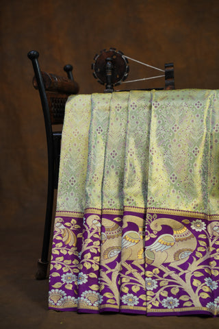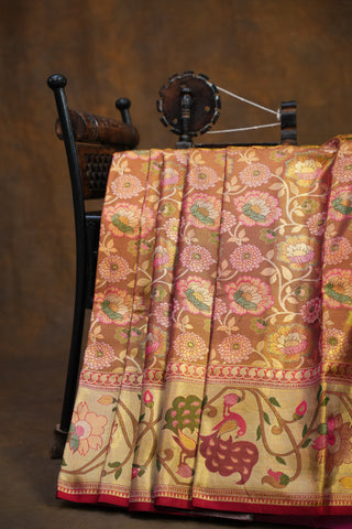 Pure silk sarees with real gold zari—such as Kanchipuram, Banarasi, and exclusive handcrafted Gadwal silk sarees—are among the most expensive. Their cost reflects fine silk quality, intricate handwork, and the time-intensive weaving process.