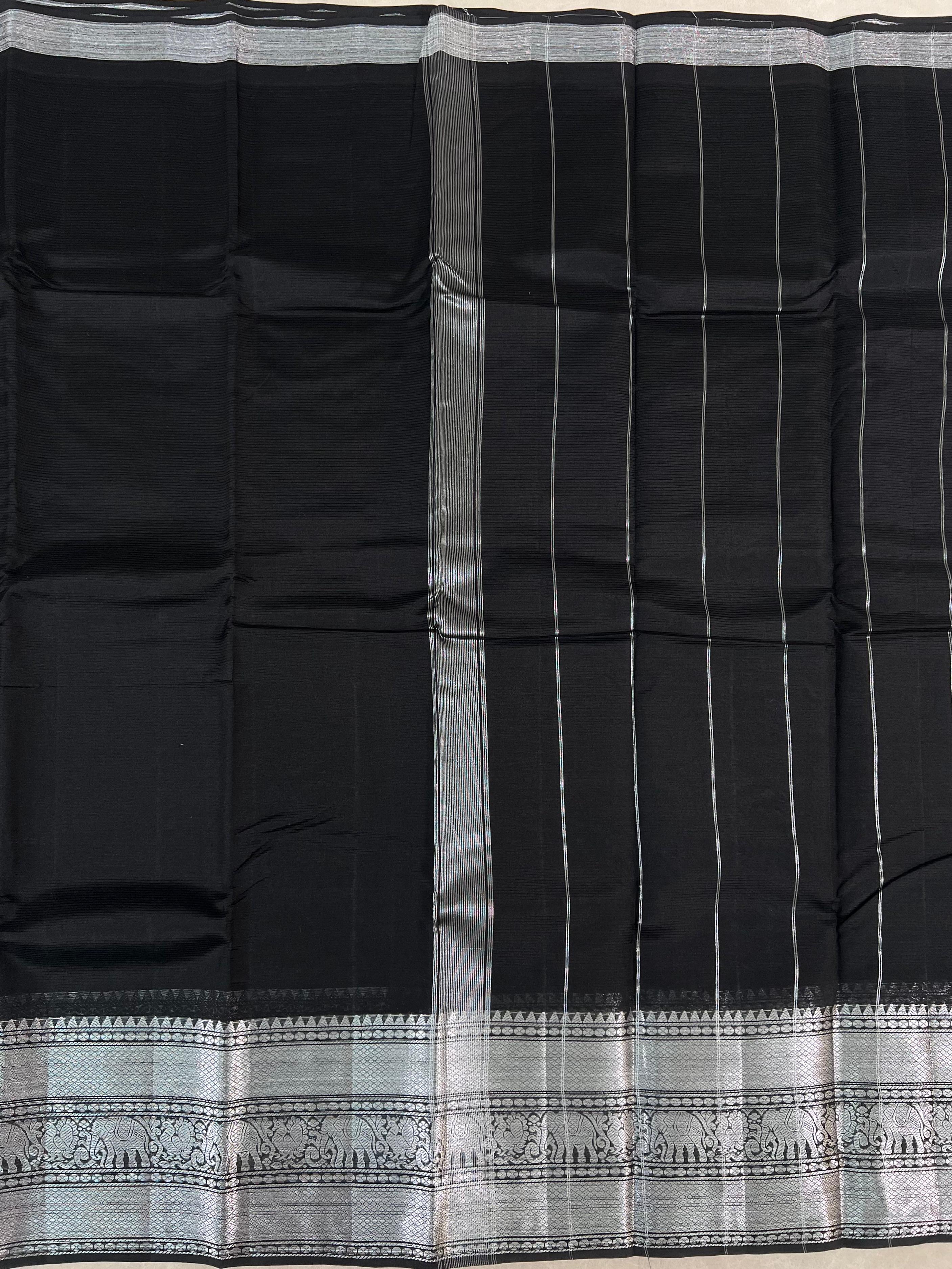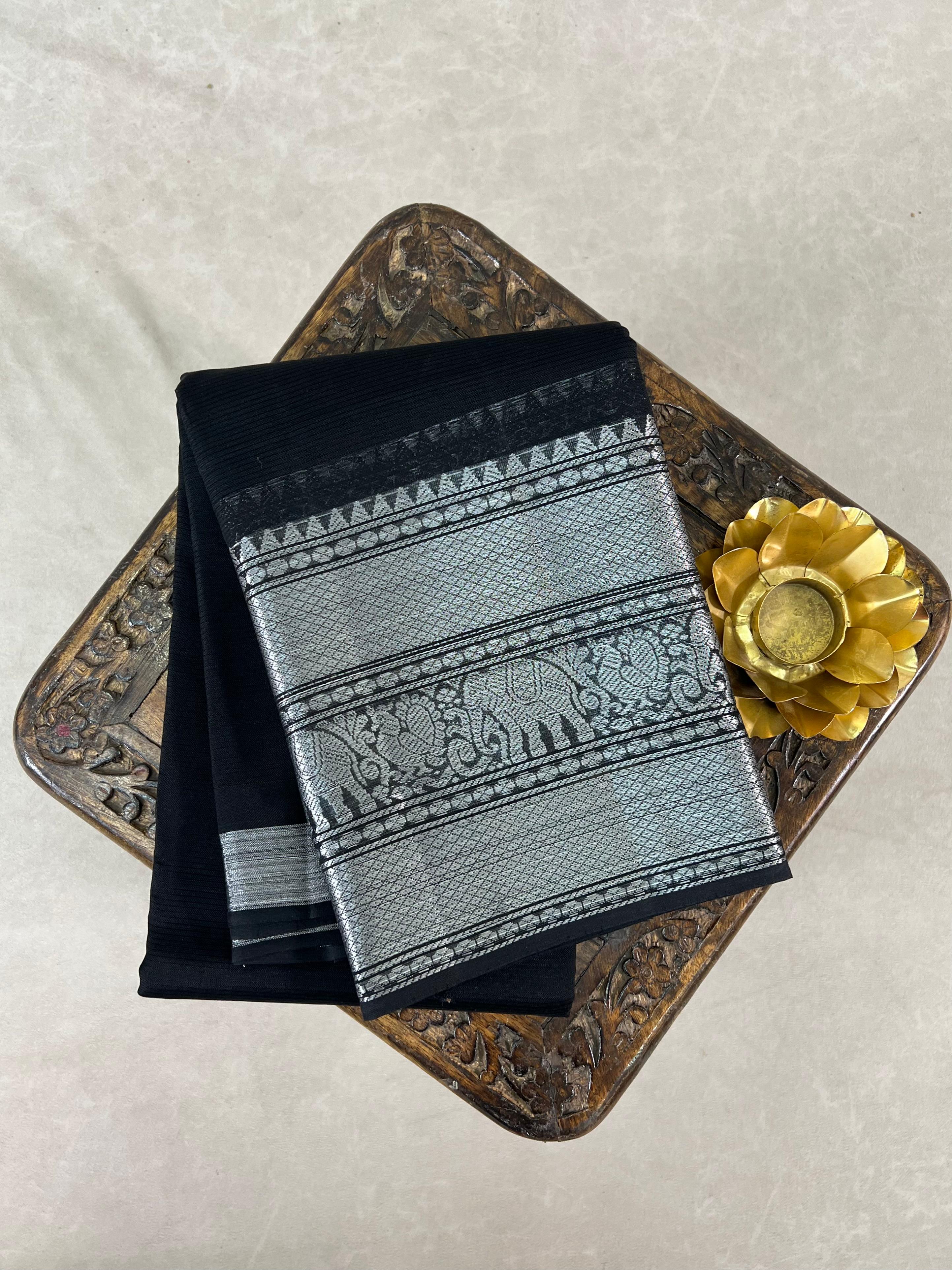 This Mangalagiri Silk Cotton Saree features a rich Black Color body with a fine, elegant weave. It is enhanced by a silver zari traditional border with subtle floral and geometric motifs, adding a soft festive touch. Lightweight and breathable, this saree is ideal for office wear, festive occasions, and everyday elegance, reflecting timeless handloom craftsmanship. This saree Comes with self blouse.