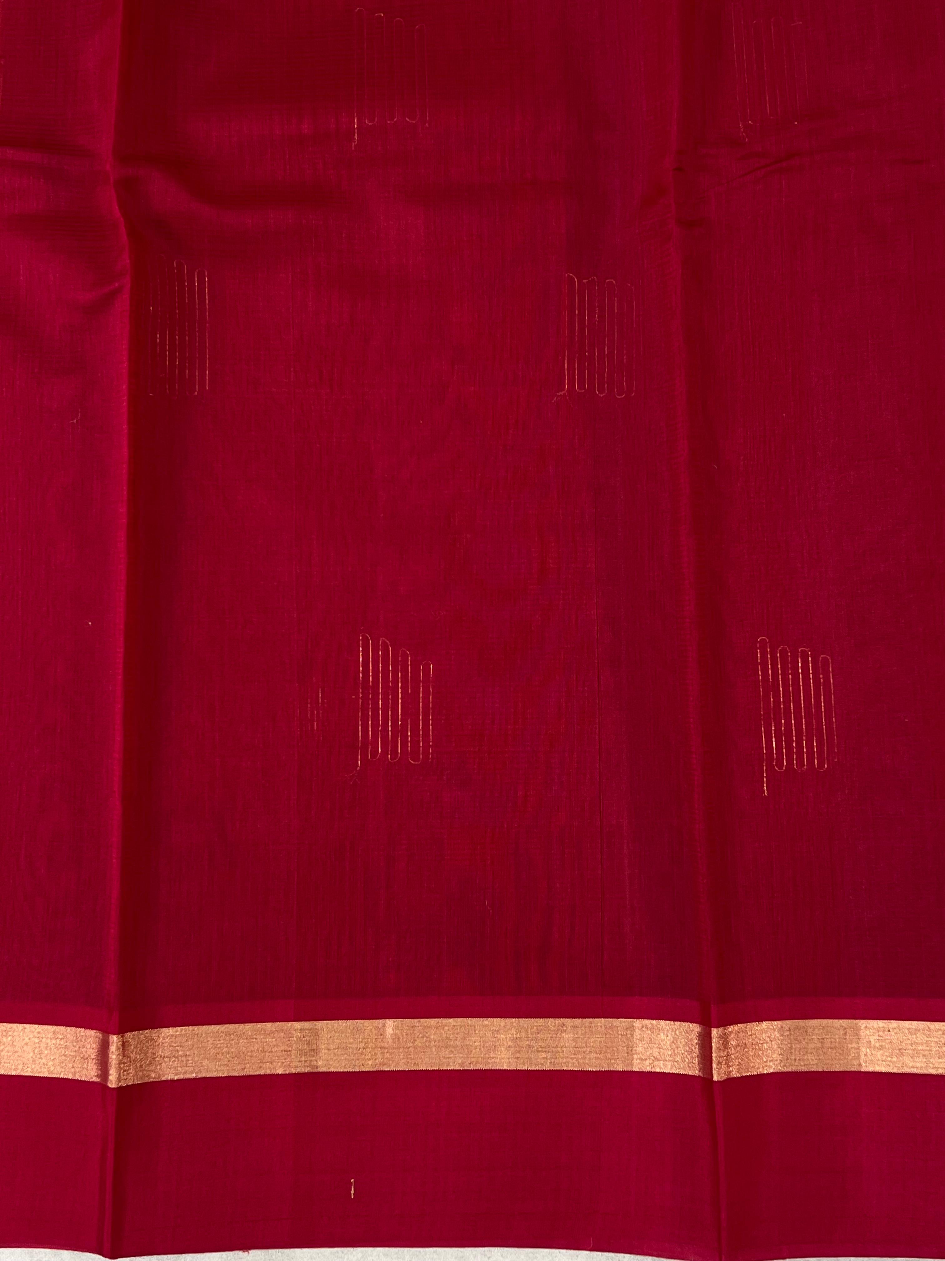 This Coimbatore silk cotton saree features a Sand beige tone with a smooth and gold zari motif, lustrous finish that reflects the elegance of traditional weaving, and the saree comes with small dark maroon red plain border, the fabric beautifully blends the softness of cotton with the subtle sheen of silk, offering both comfort and sophistication. A refined woven motif on the pallu adds a graceful highlight. Perfect for office wear, festive gatherings, or formal occasions, this saree exudes timeless charm and effortless elegance. Blouse included