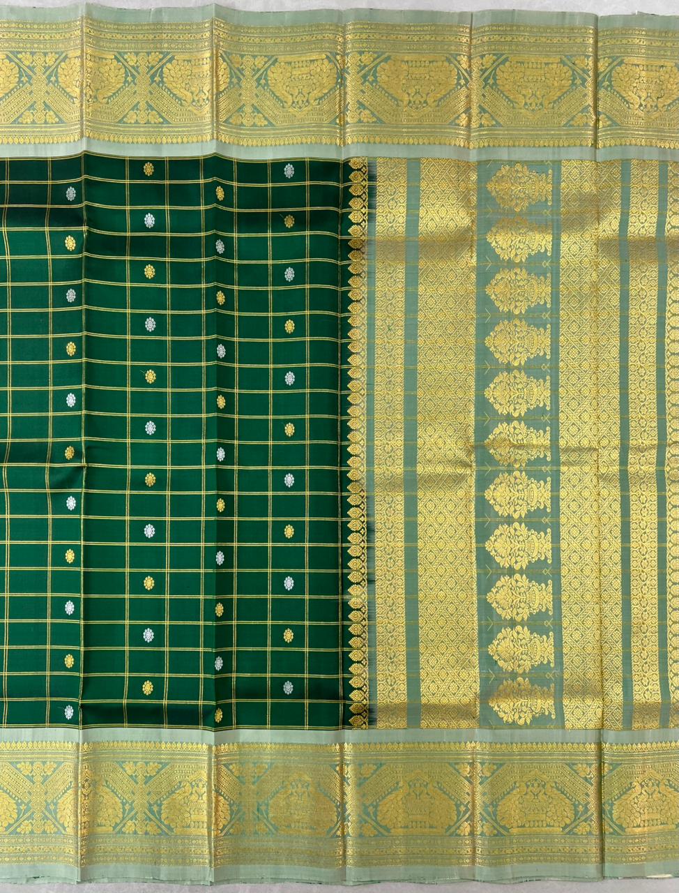 This elegant Gadwal Pure Silk Handloom Dupatta features a Bottle Green body with golden checks and gold and silver motifs. The highlight is its grand pallu, adorned with exquisite golden motifs and traditional patterns, self bordered with a subtle gold zari detailing. A perfect blend of heritage and luxury, this dupatta adds a regal charm to any attire. Silk Mark Certified.