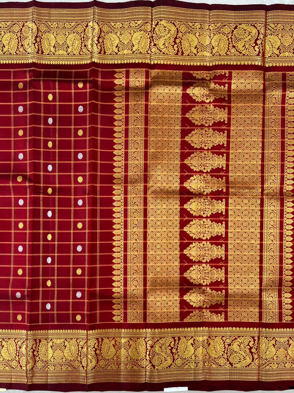 This elegant Gadwal Pure Silk Handloom Dupatta features a Rust Brown body with golden checks and gold and silver motifs. The highlight is its grand pallu, adorned with exquisite golden motifs and traditional patterns, self bordered with a subtle gold zari detailing. A perfect blend of heritage and luxury, this dupatta adds a regal charm to any attire. Silk Mark Certified.