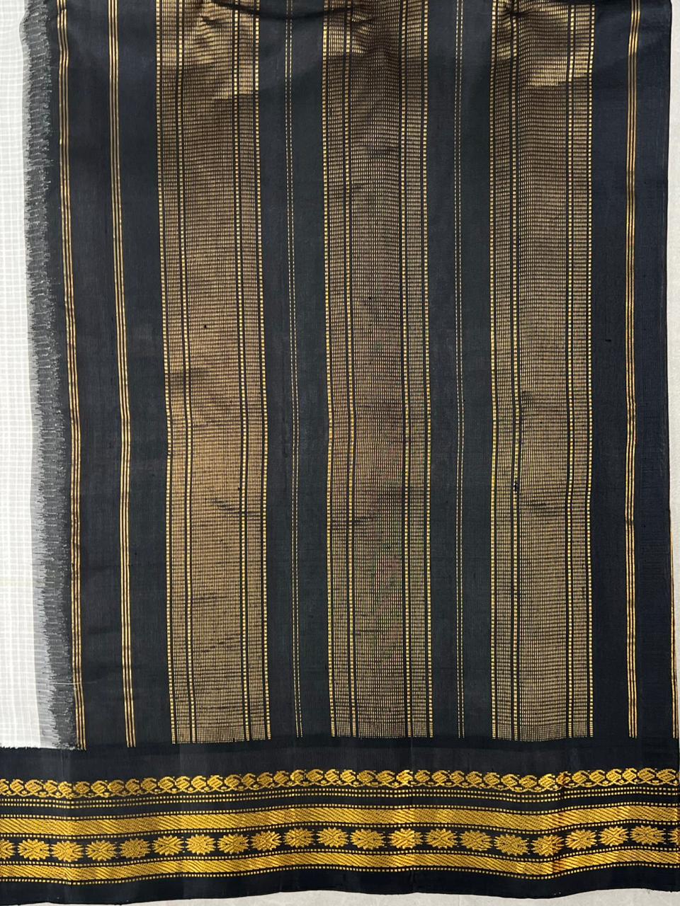 This is a Gadwal Cotton Kuttu Handloom Saree, featuring a soft white body with white checks contrasted with a Black border. The border is adorned with intricate golden zari weaving in traditional kuttu technique, giving it a timeless elegance. Lightweight and breathable, this saree is perfect for graceful everyday wear or simple festive occasions, showcasing the authentic charm of handloom craftsmanship. This saree Comes without Blouse.