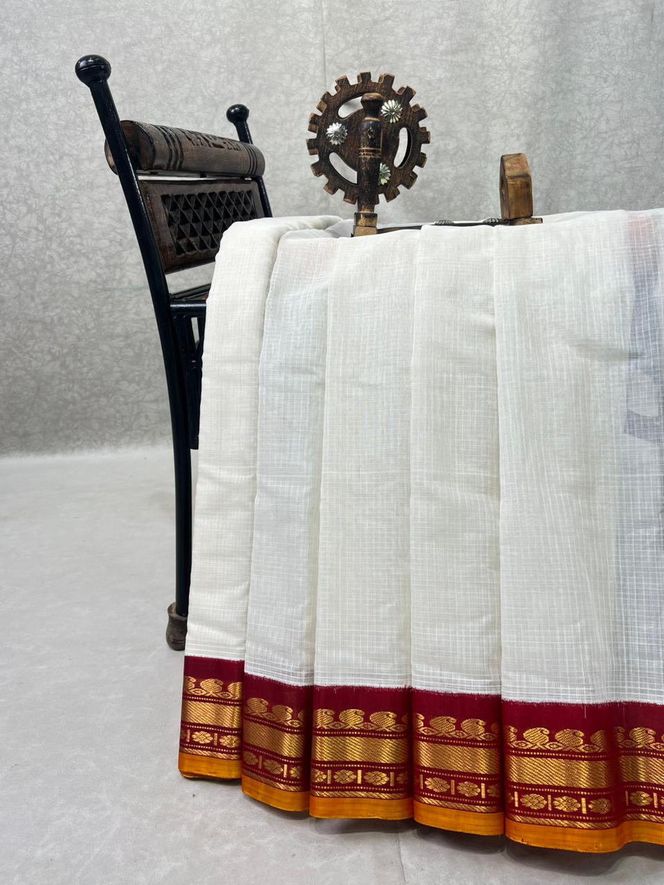 This is a Gadwal Cotton Kuttu Handloom Saree, featuring a soft white body with white checks contrasted with a Red border comes with Orange selvedge. The border is adorned with intricate golden zari weaving in traditional kuttu technique, giving it a timeless elegance. Lightweight and breathable, this saree is perfect for graceful everyday wear or simple festive occasions, showcasing the authentic charm of handloom craftsmanship. This saree Comes without Blouse.