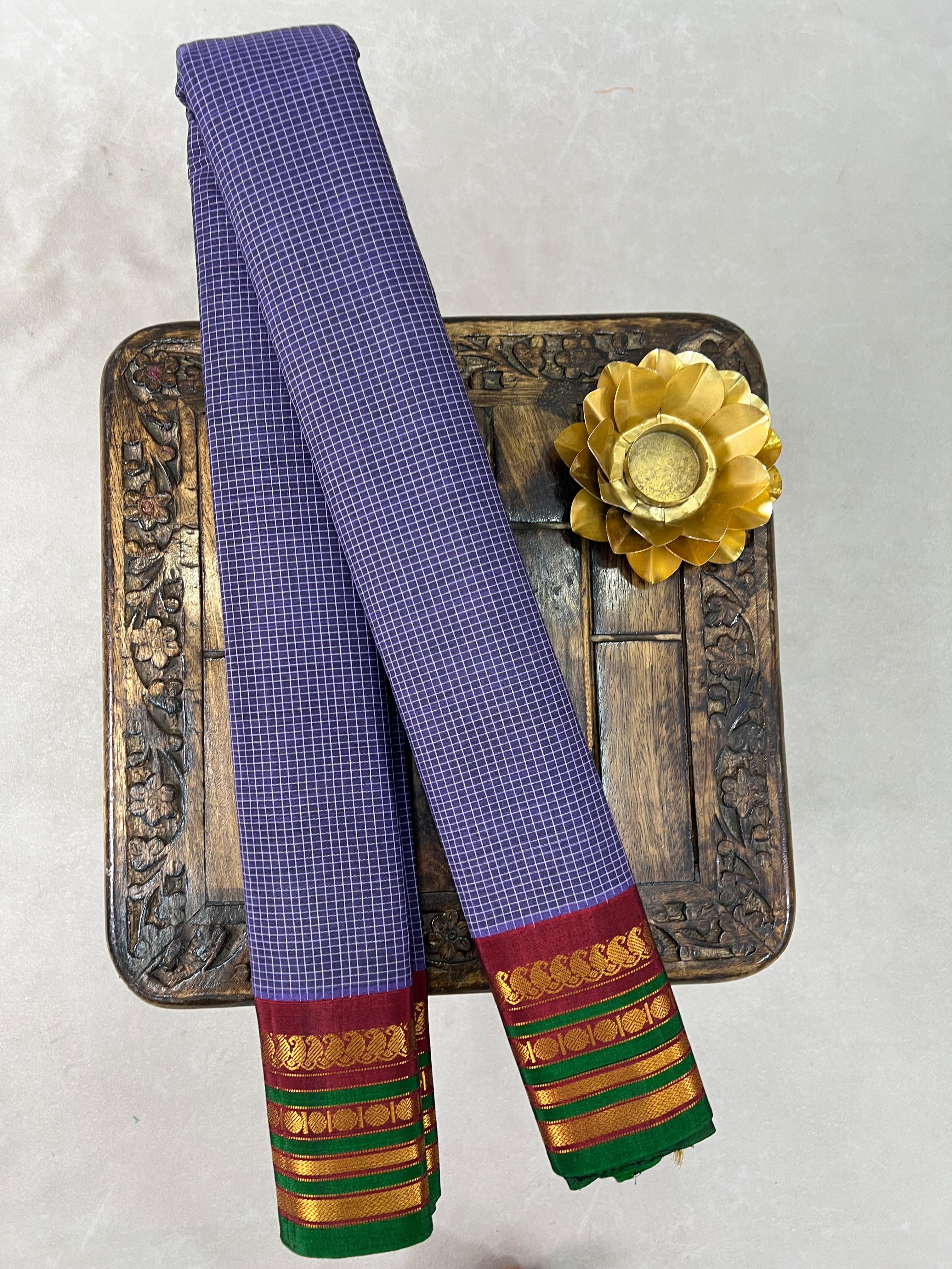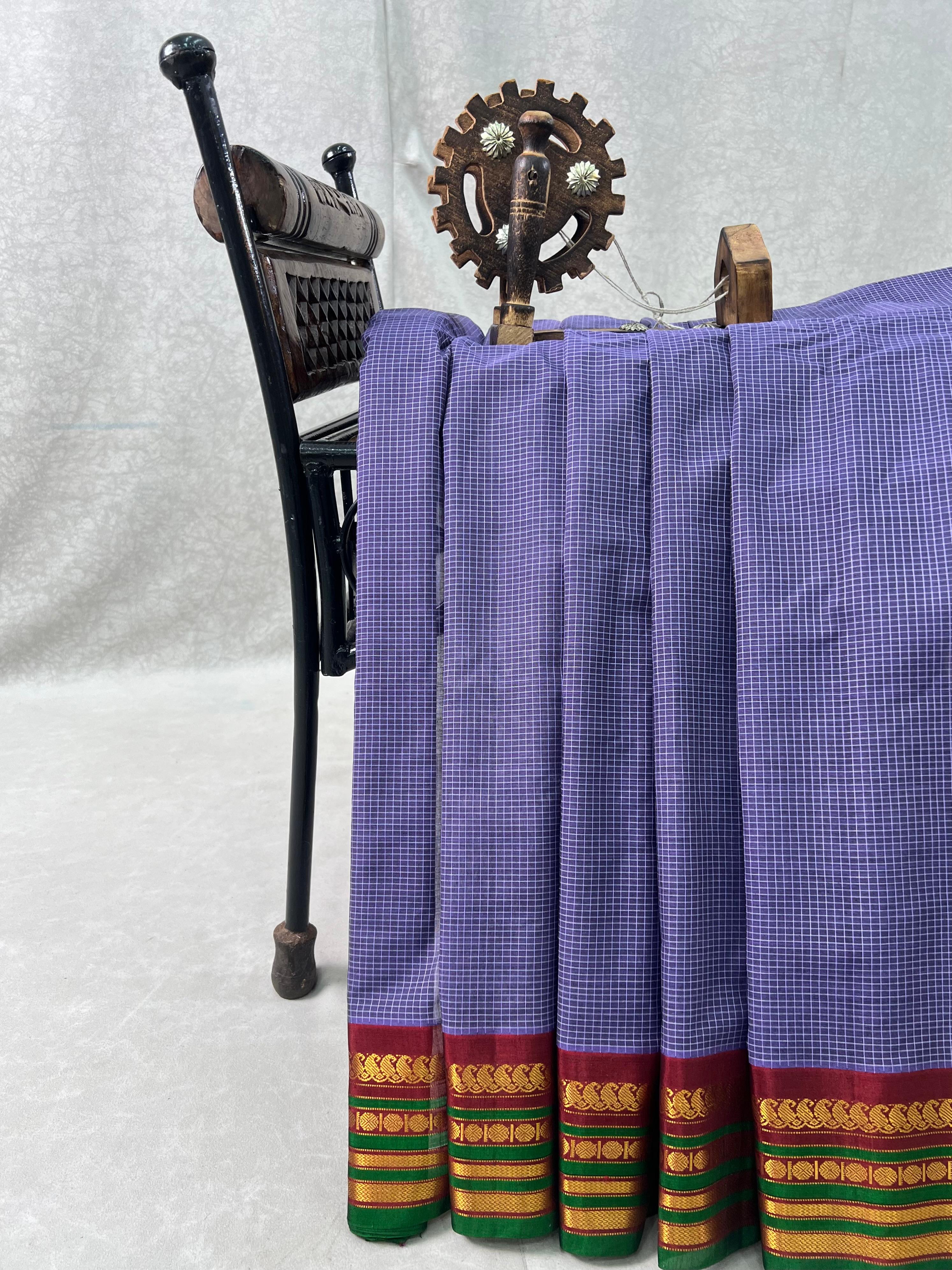 This elegant Gadwal Pure Cotton Checks Handloom Saree features a subtle Lavender Purple base adorned with fine checks, giving it a classy and timeless appeal. The contrasting borders in Maroon, gold zari and Green pallu add a vibrant touch, beautifully balancing tradition with sophistication. Lightweight and comfortable, it is perfect for everyday wear as well as special occasions. Blouse not included.