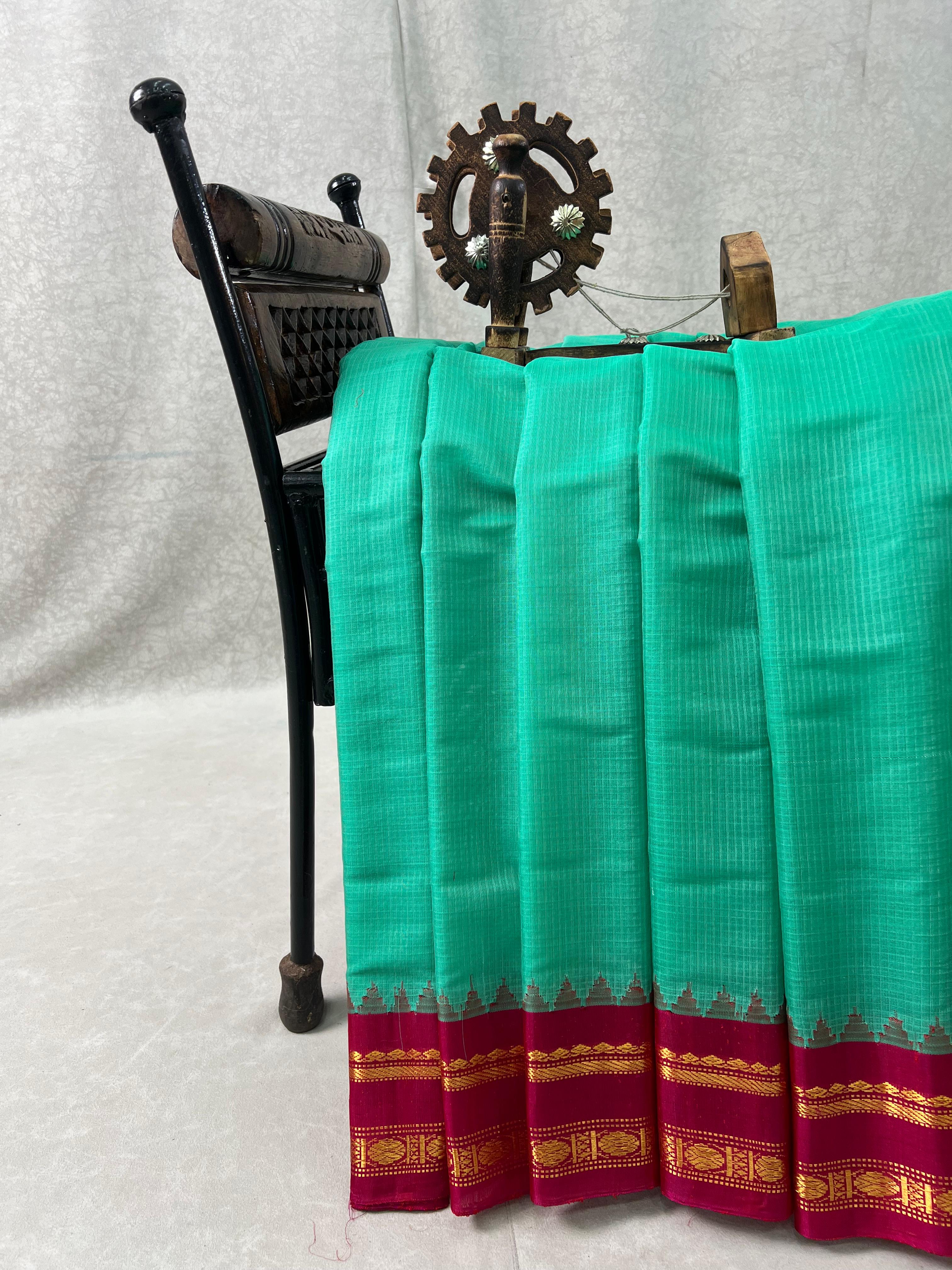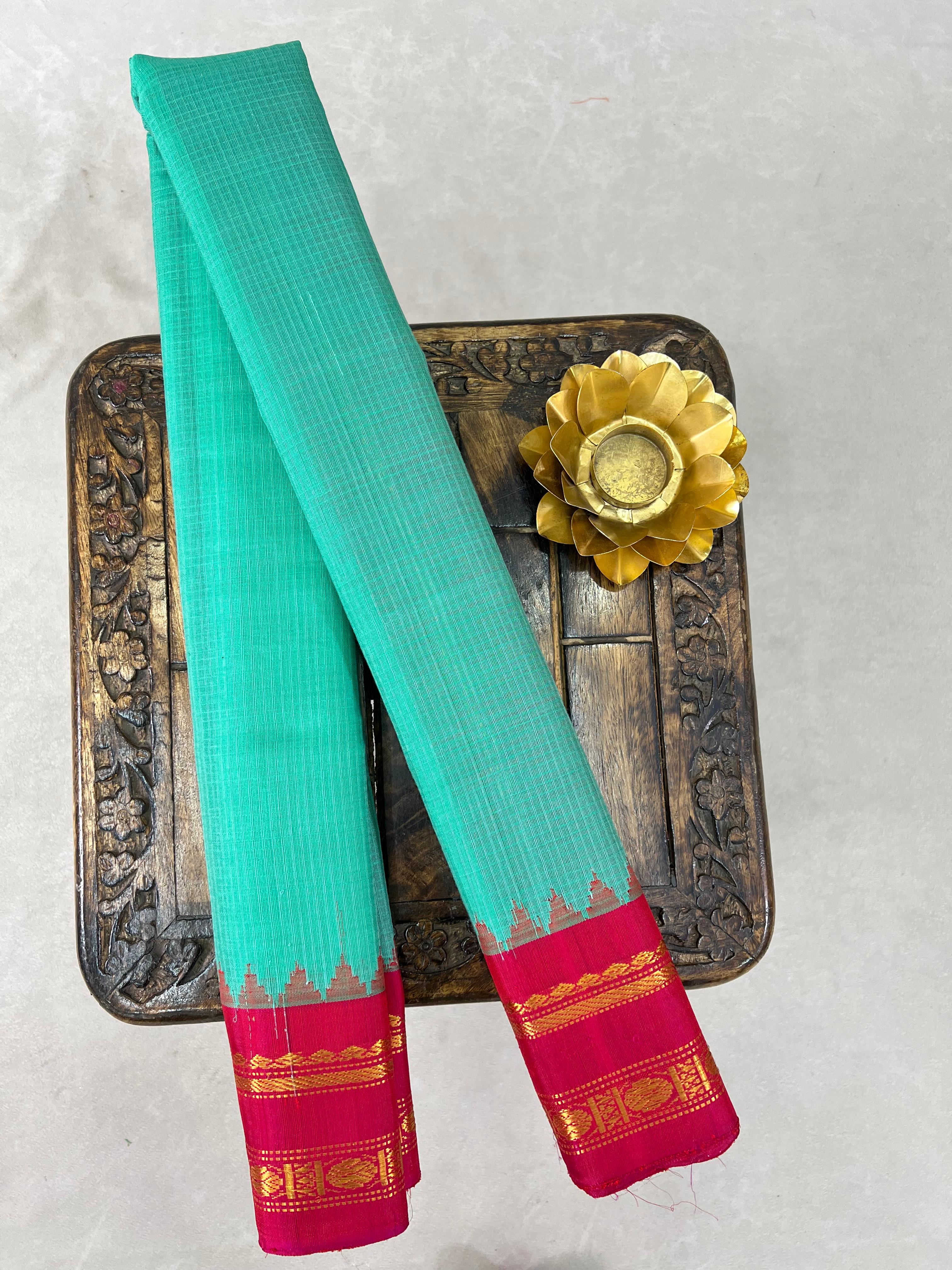 This elegant Gadwal Pure Cotton Checks Handloom Saree features a subtle Bright turquoise base adorned with fine checks, giving it a classy and timeless appeal. The contrasting gap borders in Pink, gold zari add a vibrant touch, beautifully balancing tradition with sophistication. Lightweight and comfortable, it is perfect for everyday wear as well as special occasions. Blouse not included.
