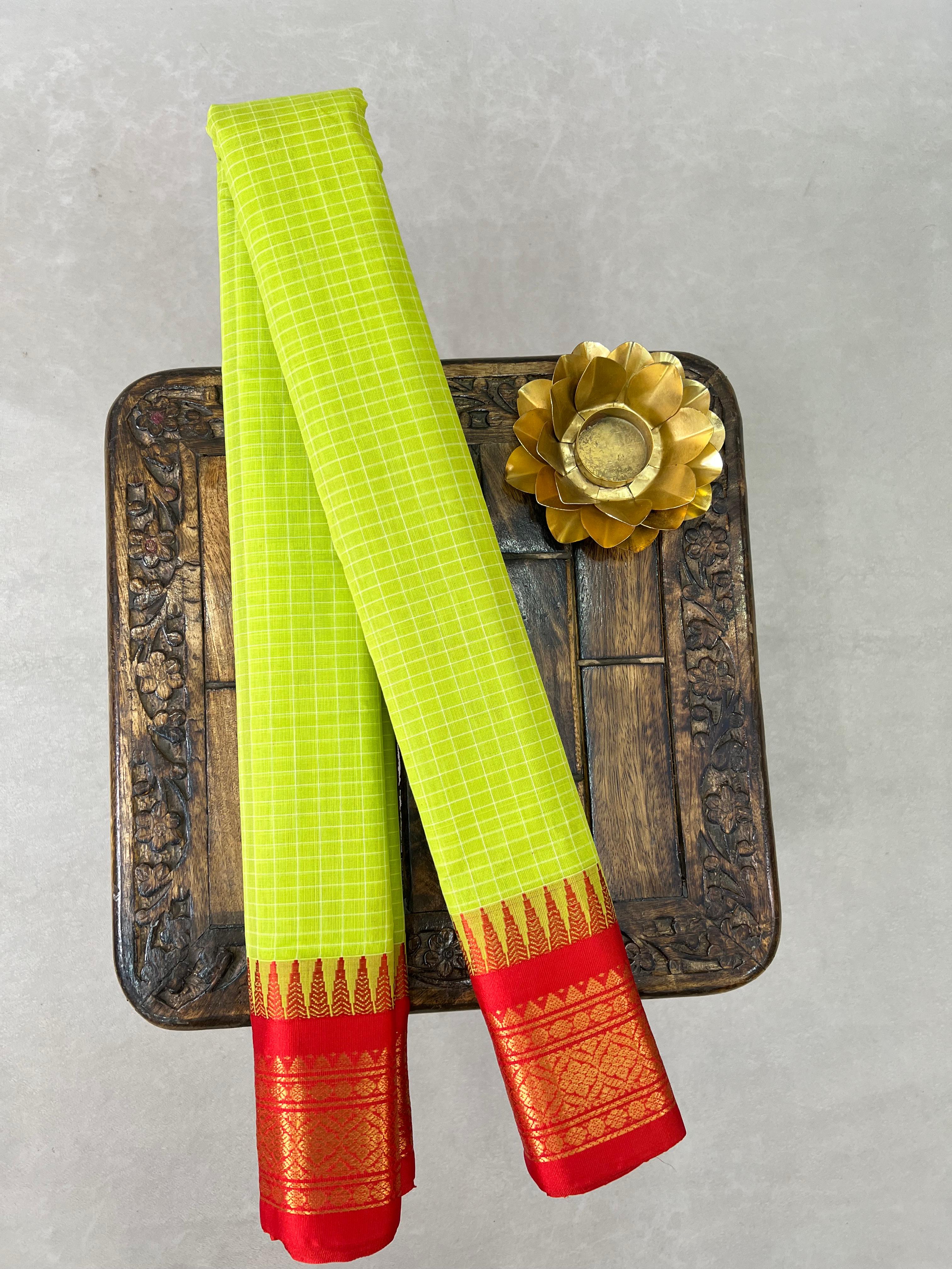 This elegant Gadwal Pure Cotton Checks Handloom Saree features a subtle Parrot Green Color base adorned with fine white checks, giving it a classy and timeless appeal. The contrasting borders in Red zari floral motifs add a vibrant touch, beautifully balancing tradition with sophistication. Lightweight and comfortable, it is perfect for everyday wear as well as special occasions. Blouse not included.