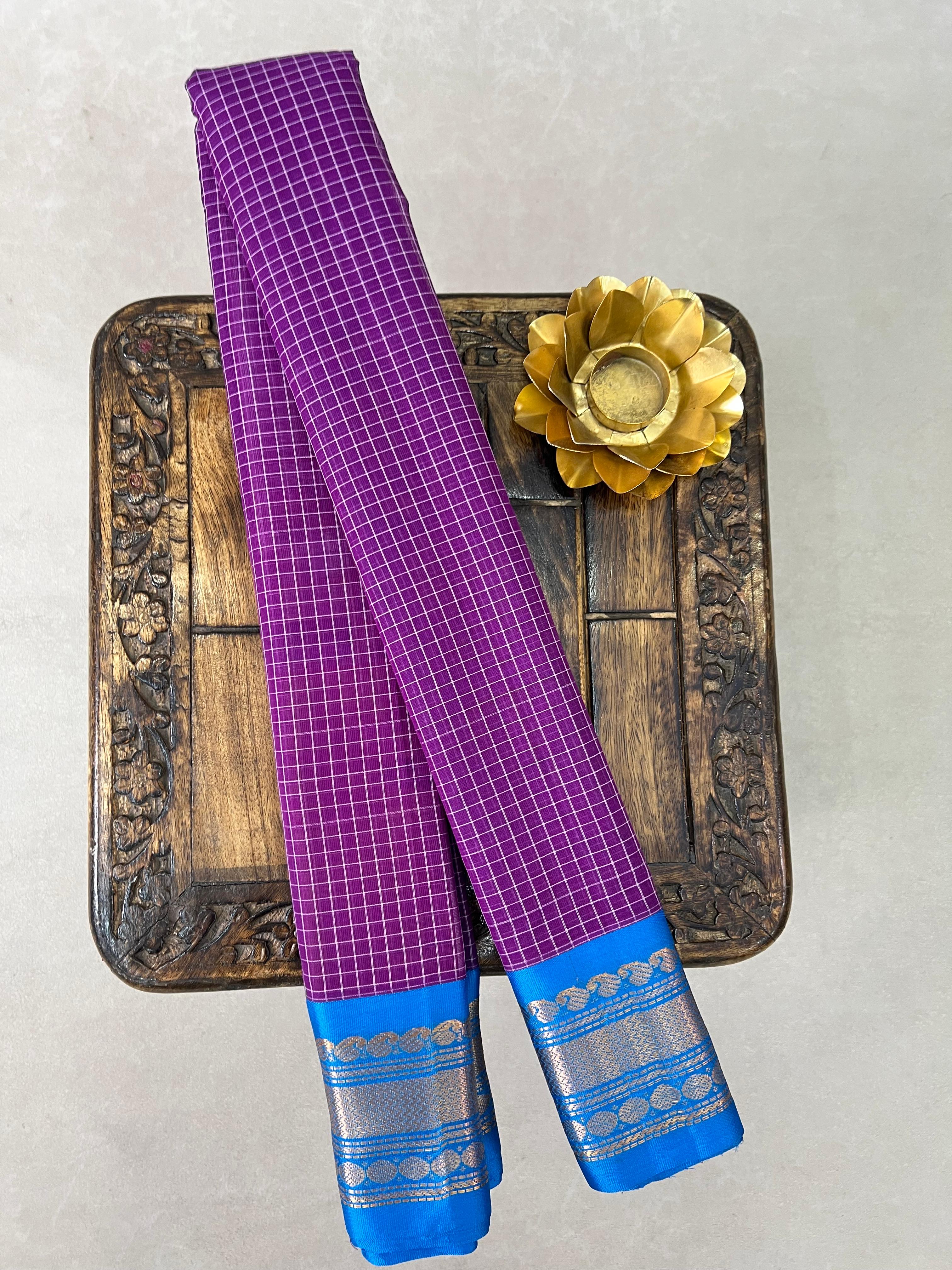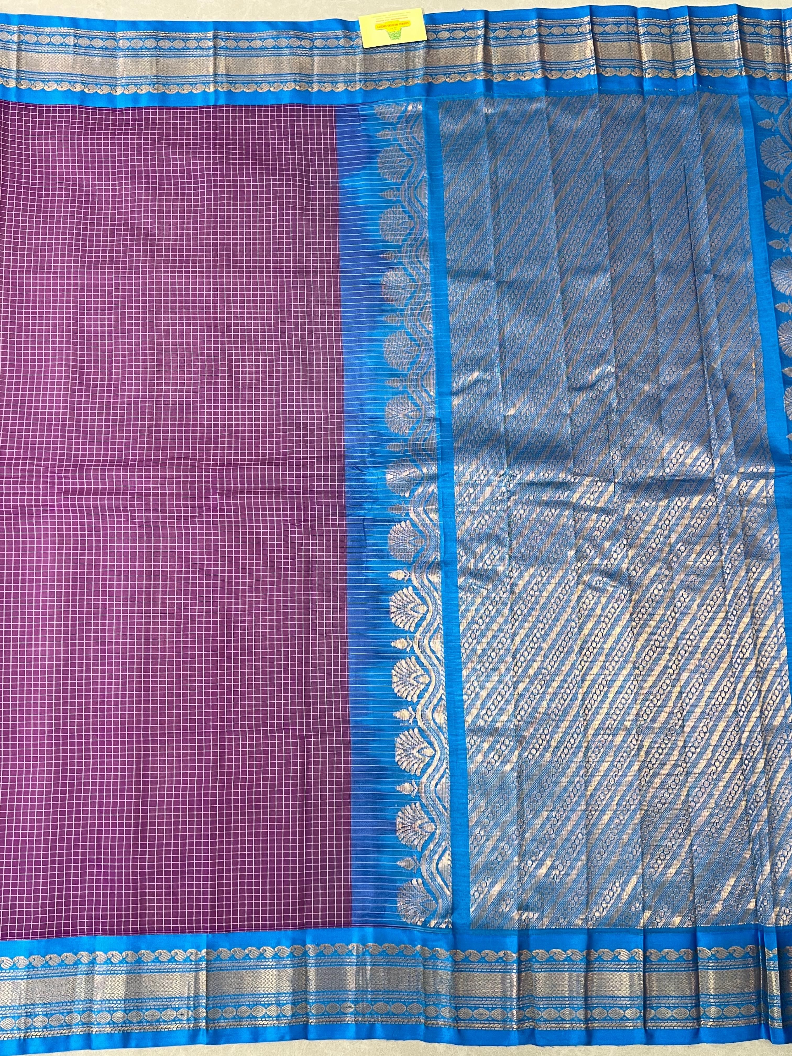 This elegant Gadwal Pure Cotton Checks Handloom Saree features a subtle Purple Color base adorned with fine white checks, giving it a classy and timeless appeal. The contrasting Blue border with Gold zari floral motifs add a vibrant touch, beautifully balancing tradition with sophistication. Lightweight and comfortable, it is perfect for everyday wear as well as special occasions. Blouse not included.