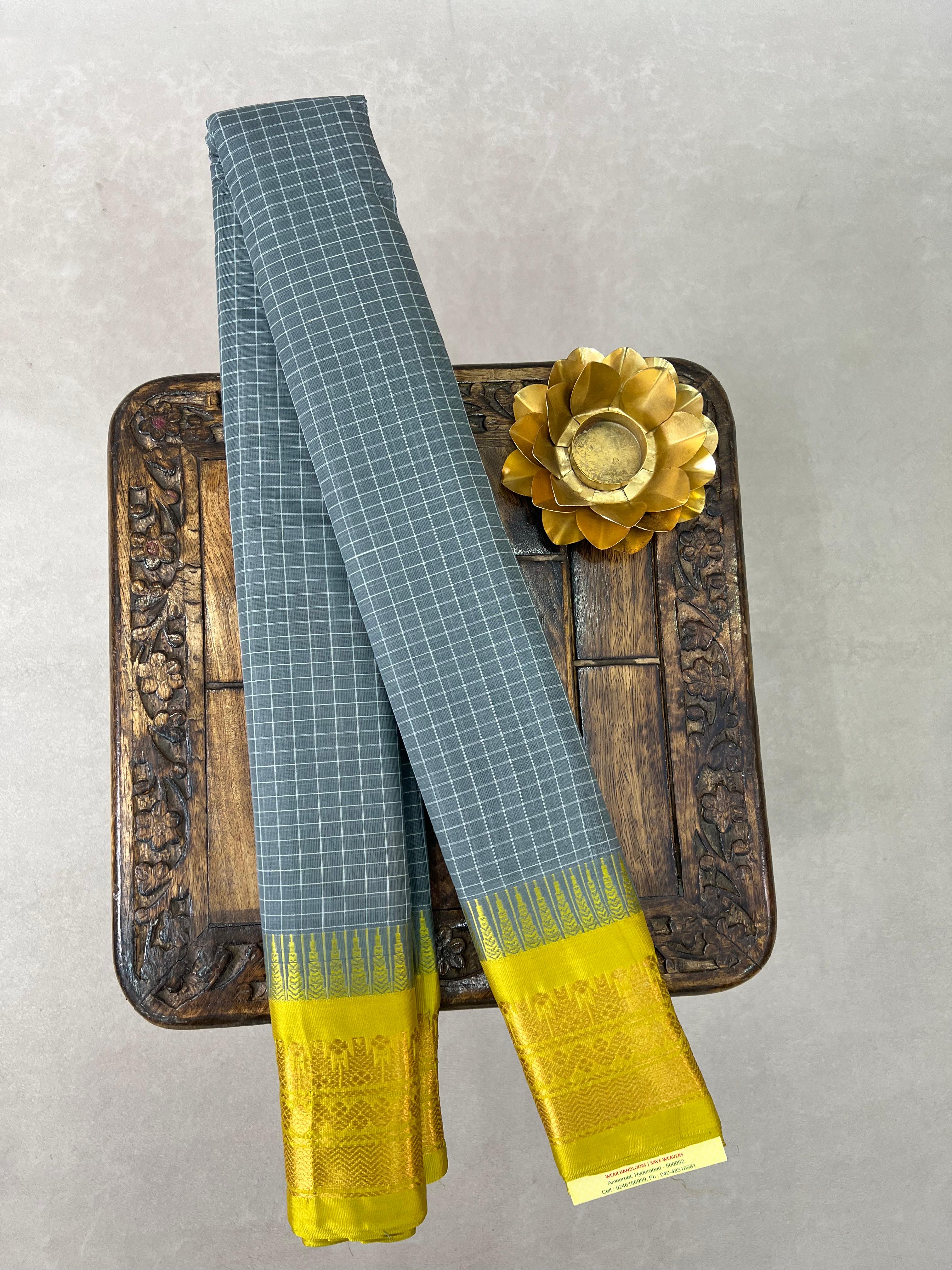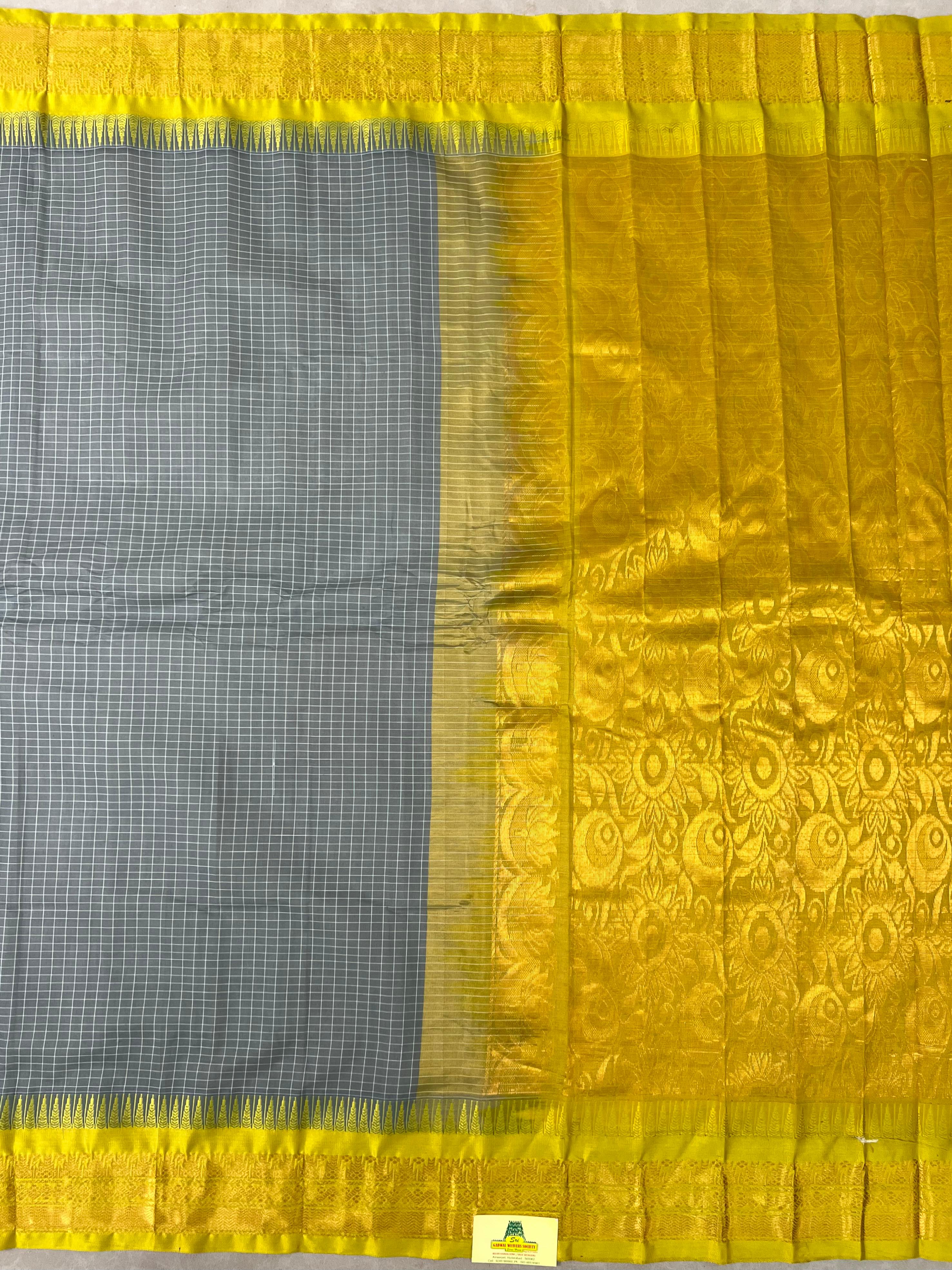 This elegant Gadwal Pure Cotton Checks Handloom Saree features a subtle Ash Color base adorned with fine white checks, giving it a classy and timeless appeal. The contrasting Golden yellow border with Gold zari floral motifs add a vibrant touch, beautifully balancing tradition with sophistication. Lightweight and comfortable, it is perfect for everyday wear as well as special occasions. Blouse not included.