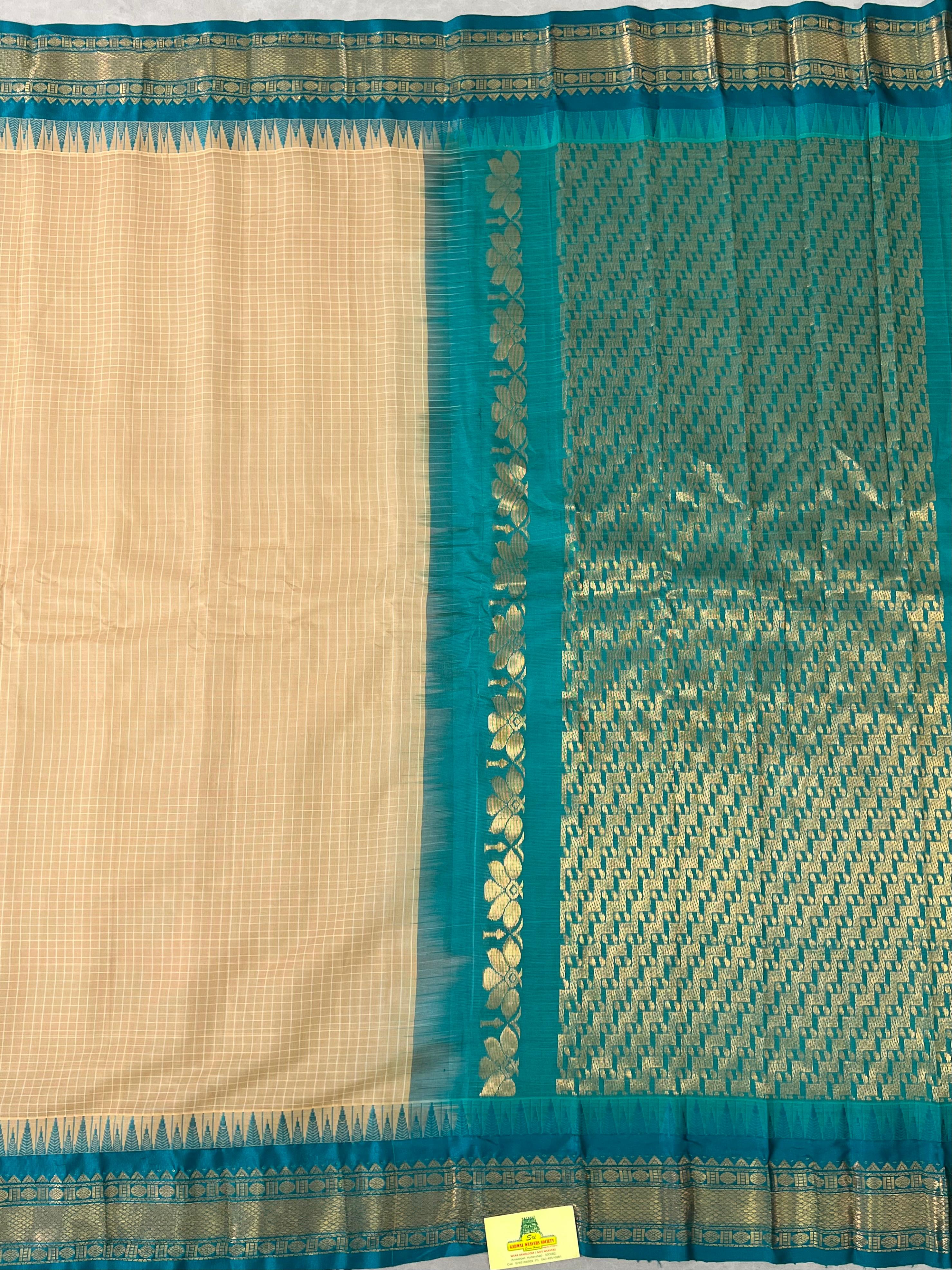 This elegant Gadwal Pure Cotton Checks Handloom Saree features a subtle Beige Color base adorned with fine white checks, giving it a classy and timeless appeal. The contrasting Rama Green border with Gold zari floral motifs add a vibrant touch, beautifully balancing tradition with sophistication. Lightweight and comfortable, it is perfect for everyday wear as well as special occasions. Blouse not included.