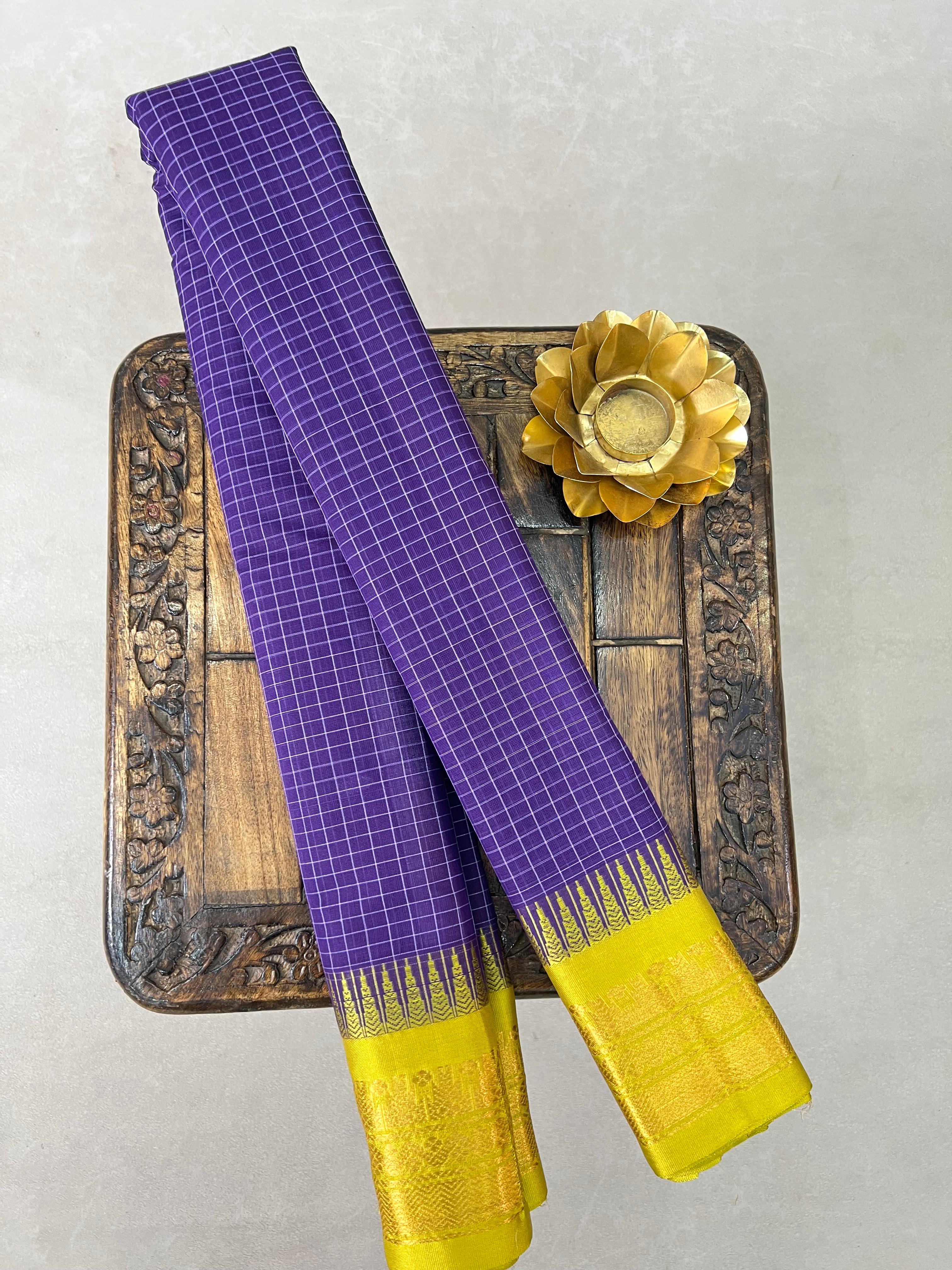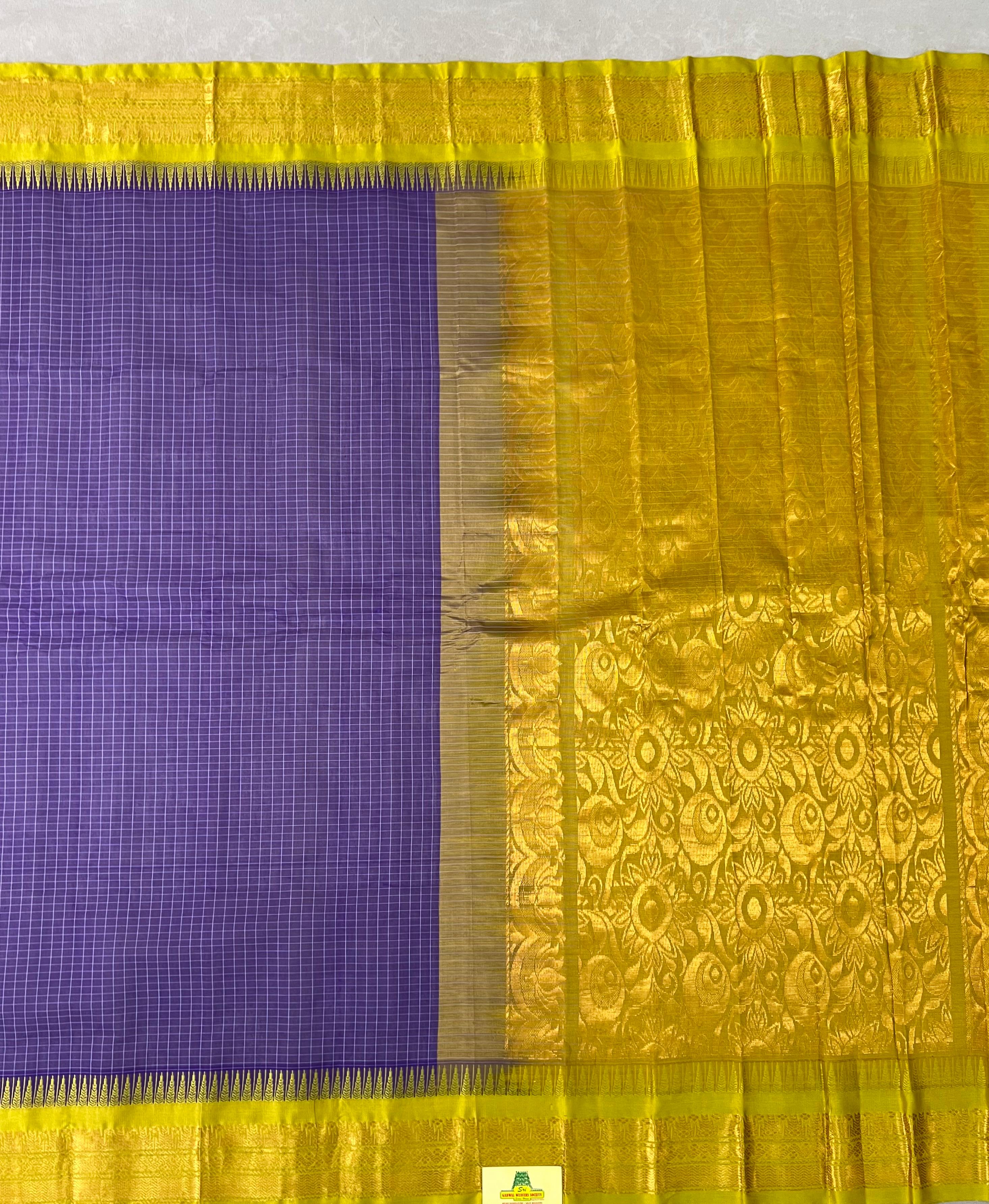 This elegant Gadwal Pure Cotton Checks Handloom Saree features a subtle Purple Color base adorned with fine white checks, giving it a classy and timeless appeal. The contrasting Golden Yellow Color Temple border with Gold zari floral motifs add a vibrant touch, beautifully balancing tradition with sophistication. Lightweight and comfortable, it is perfect for everyday wear as well as special occasions. Blouse not included.