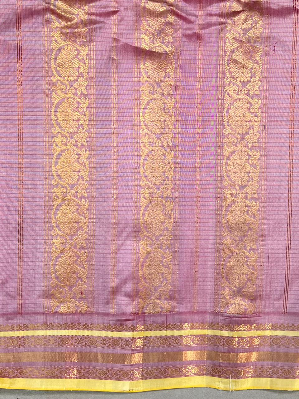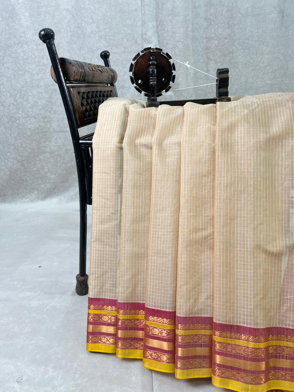 This elegant Gadwal Pure Cotton Stripes Handloom Saree features a subtle Sand beige base adorned with fine white Stripes, giving it a classy and timeless appeal. The contrasting borders in yellow, gold zari, and baby pink add a vibrant touch, beautifully balancing tradition with sophistication. Lightweight and comfortable, it is perfect for everyday wear as well as special occasions. Blouse not included.