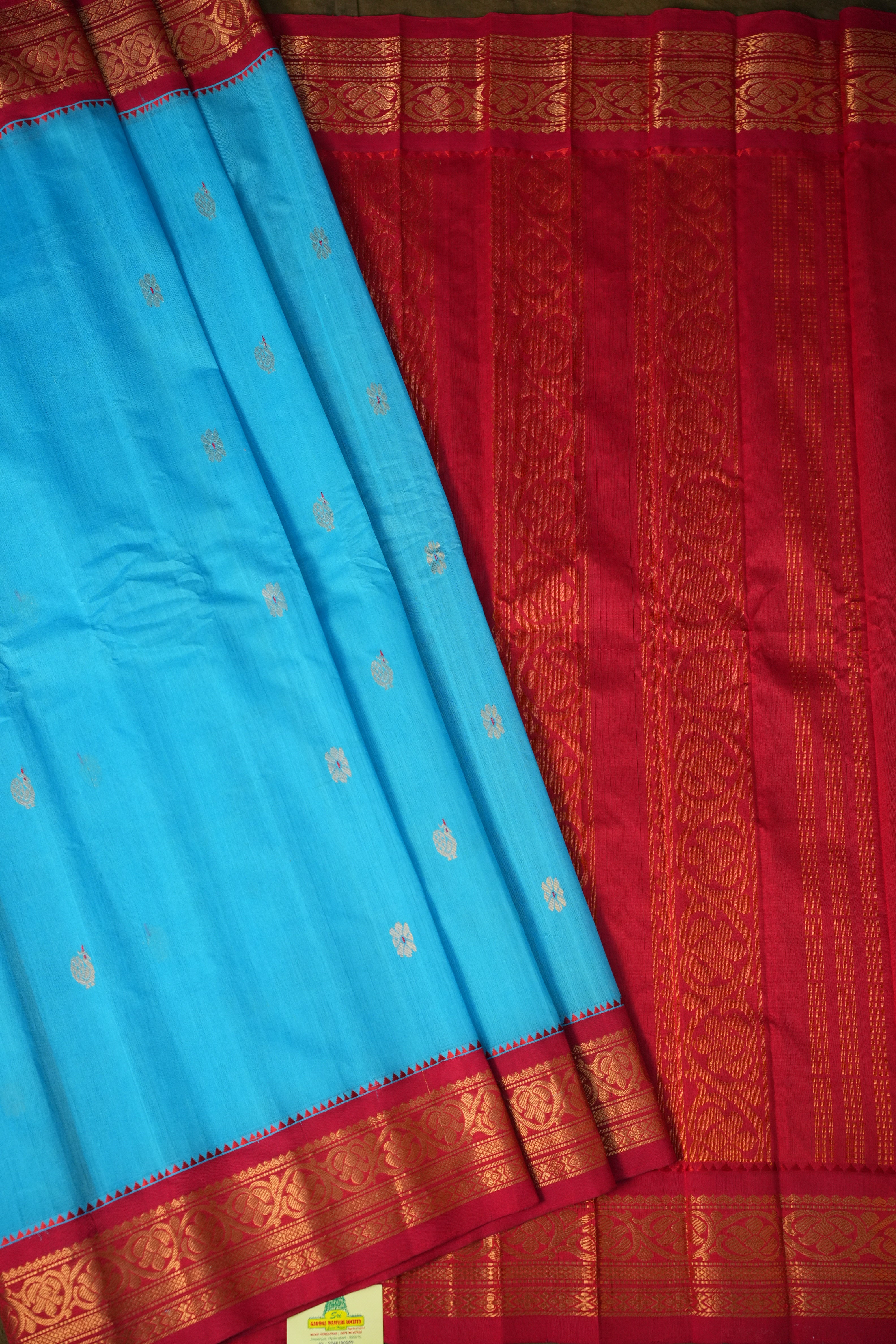This elegant Gadwal Cotton Saree showcases a beautifully woven Deep Sky Blue body, adorned with gold meenakari motifs featuring subtle and refined lines that add graceful texture. The saree is complemented by a Red border, intricately designed with golden zari detailing, enhancing its traditional handloom appeal. This saree is perfect for both everyday wear and special occasions. this saree comes with Blouse maintaining the true essence of traditional Gadwal cotton weaving.