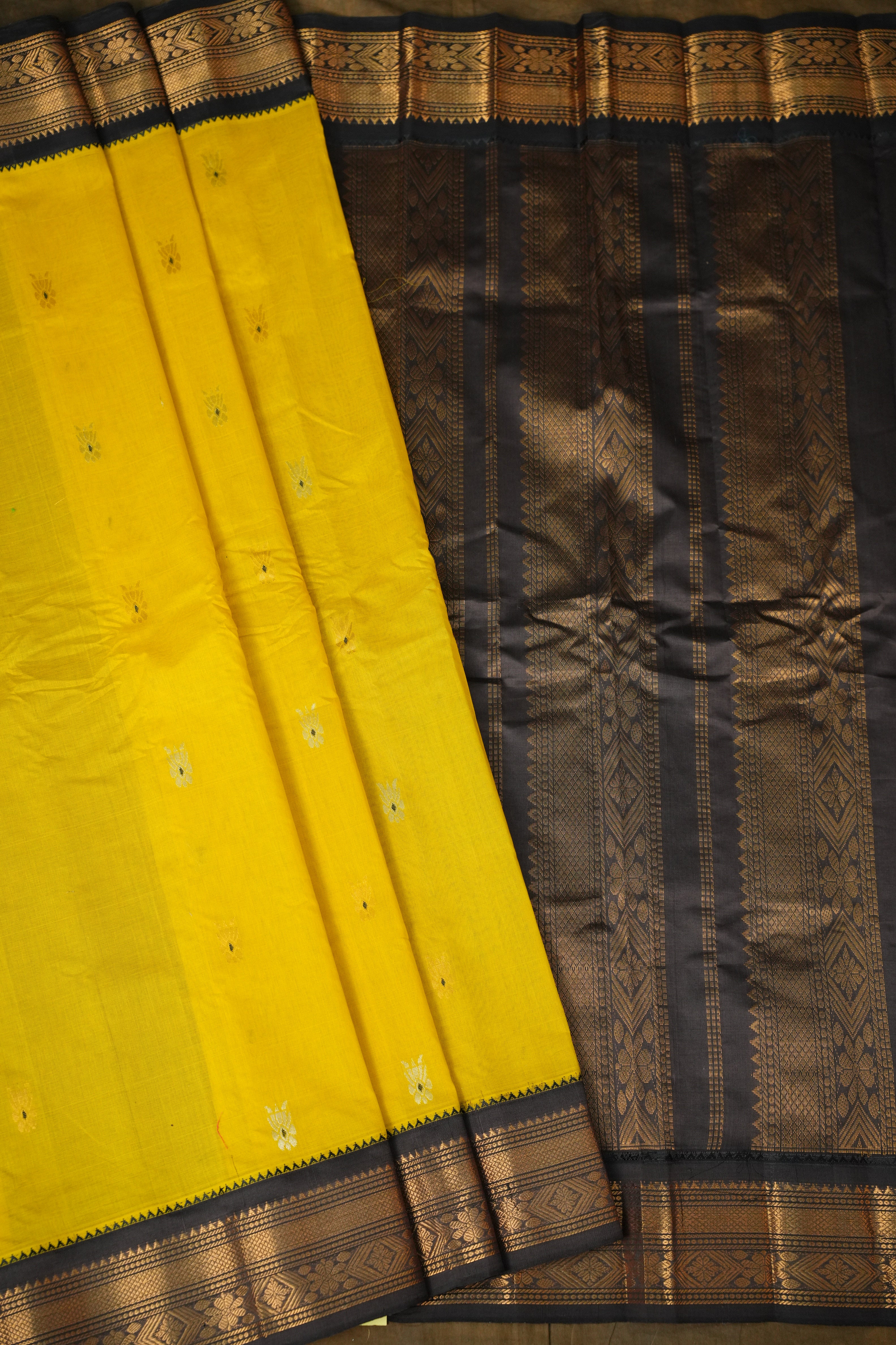 This elegant Gadwal Cotton Saree showcases a beautifully woven Yellow body, adorned with gold and silver meenakari motifs featuring subtle and refined lines that add graceful texture. The saree is complemented by a Dark Chocolate Brown  border, intricately designed with golden zari detailing, enhancing its traditional handloom appeal. This saree is perfect for both everyday wear and special occasions. this saree comes with Blouse maintaining the true essence of traditional Gadwal cotton weaving.