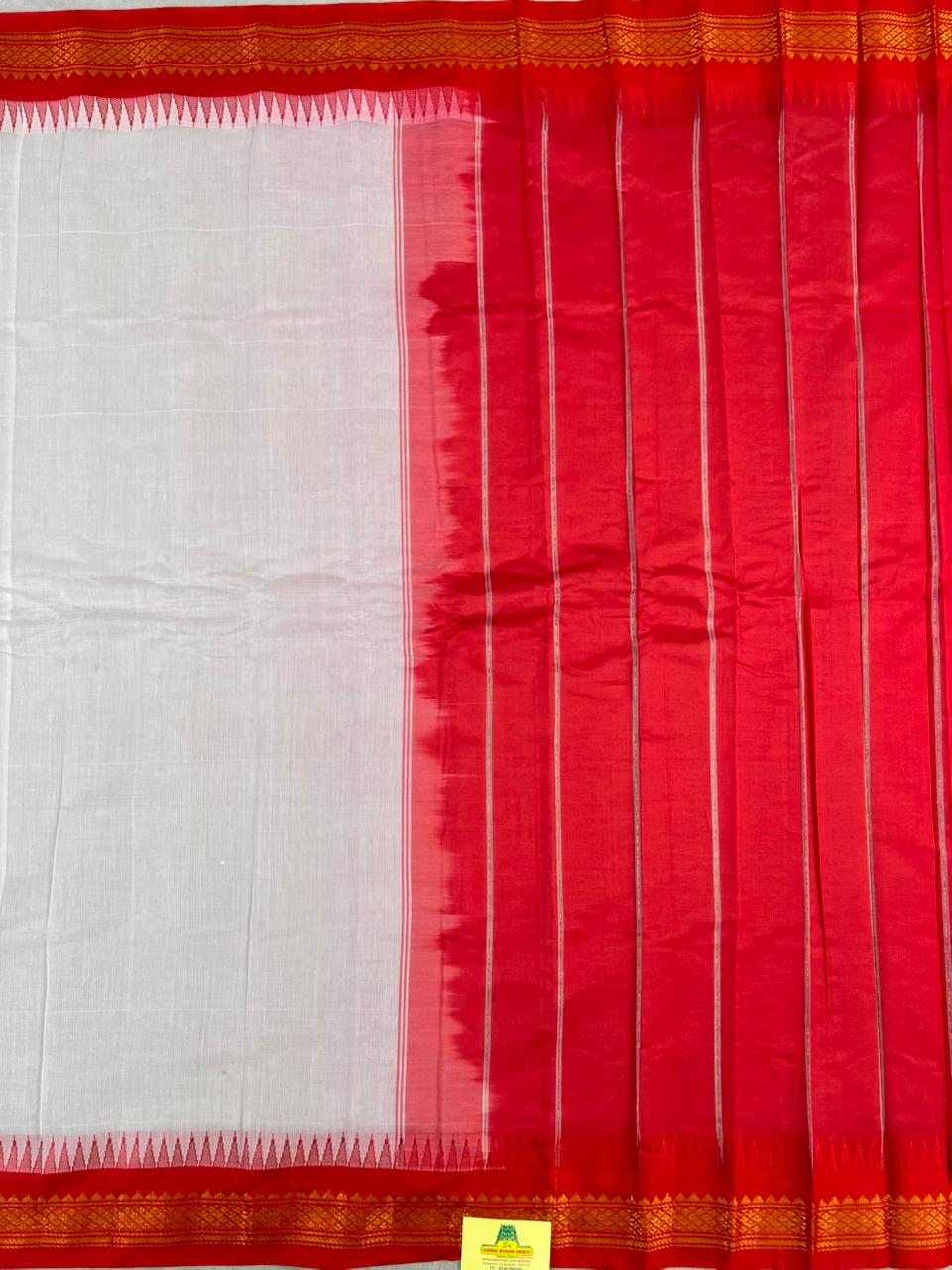 This elegant Gadwal Cotton Saree showcases a beautifully woven White body, featuring subtle and refined lines that add graceful texture. The saree is complemented by a Red border, intricately designed with golden zari detailing, enhancing its traditional handloom appeal. This saree is perfect for both everyday wear and special occasions. this saree comes without Blouse maintaining the true essence of traditional Gadwal cotton weaving.