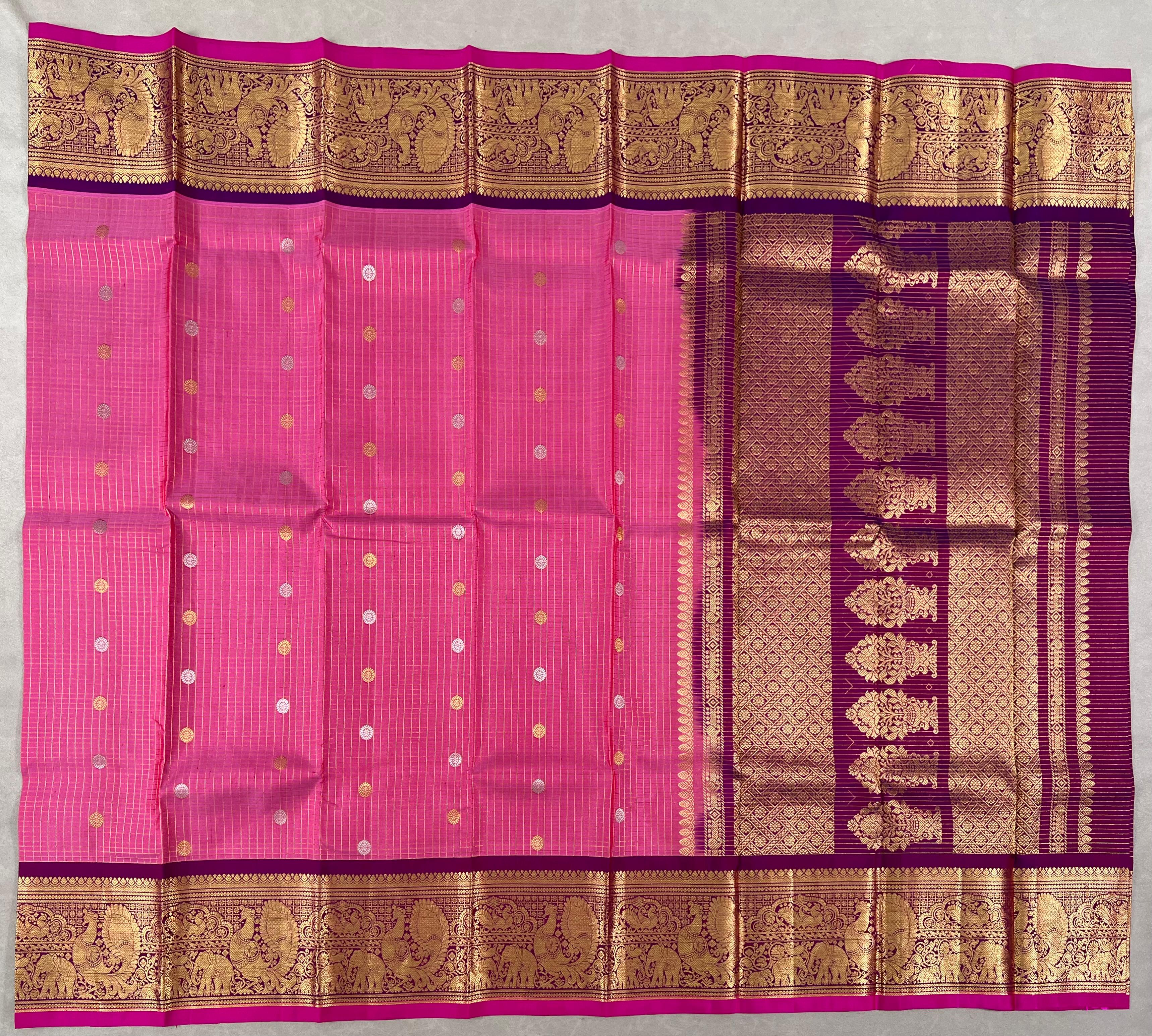This elegant Gadwal Pure Silk Handloom Dupatta features a rich light pink base with golden checks and gold and silver motifs. The highlight is its grand pallu, adorned with exquisite golden motifs and traditional patterns, bordered with a subtle purple with pink edge. A perfect blend of heritage and luxury, this dupatta adds a regal charm to any attire. Silk Mark Certified.
