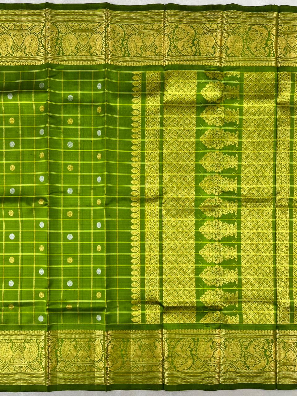 This elegant Gadwal Pure Silk Handloom Dupatta features a Parrot Green body with golden checks and gold and silver motifs. The highlight is its grand pallu, adorned with exquisite golden motifs and traditional patterns, self bordered with a subtle gold zari detailing. A perfect blend of heritage and luxury, this dupatta adds a regal charm to any attire. Silk Mark Certified.