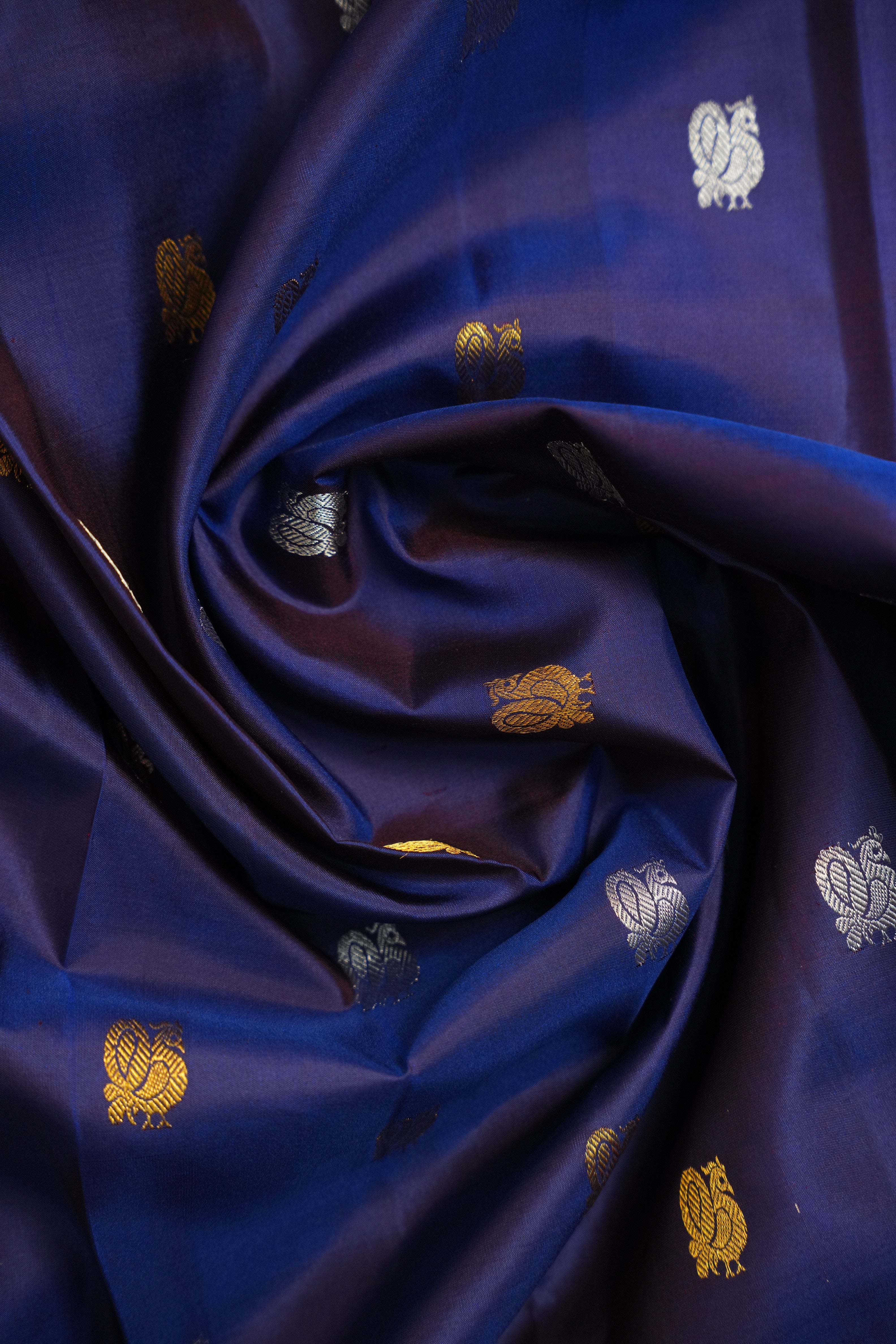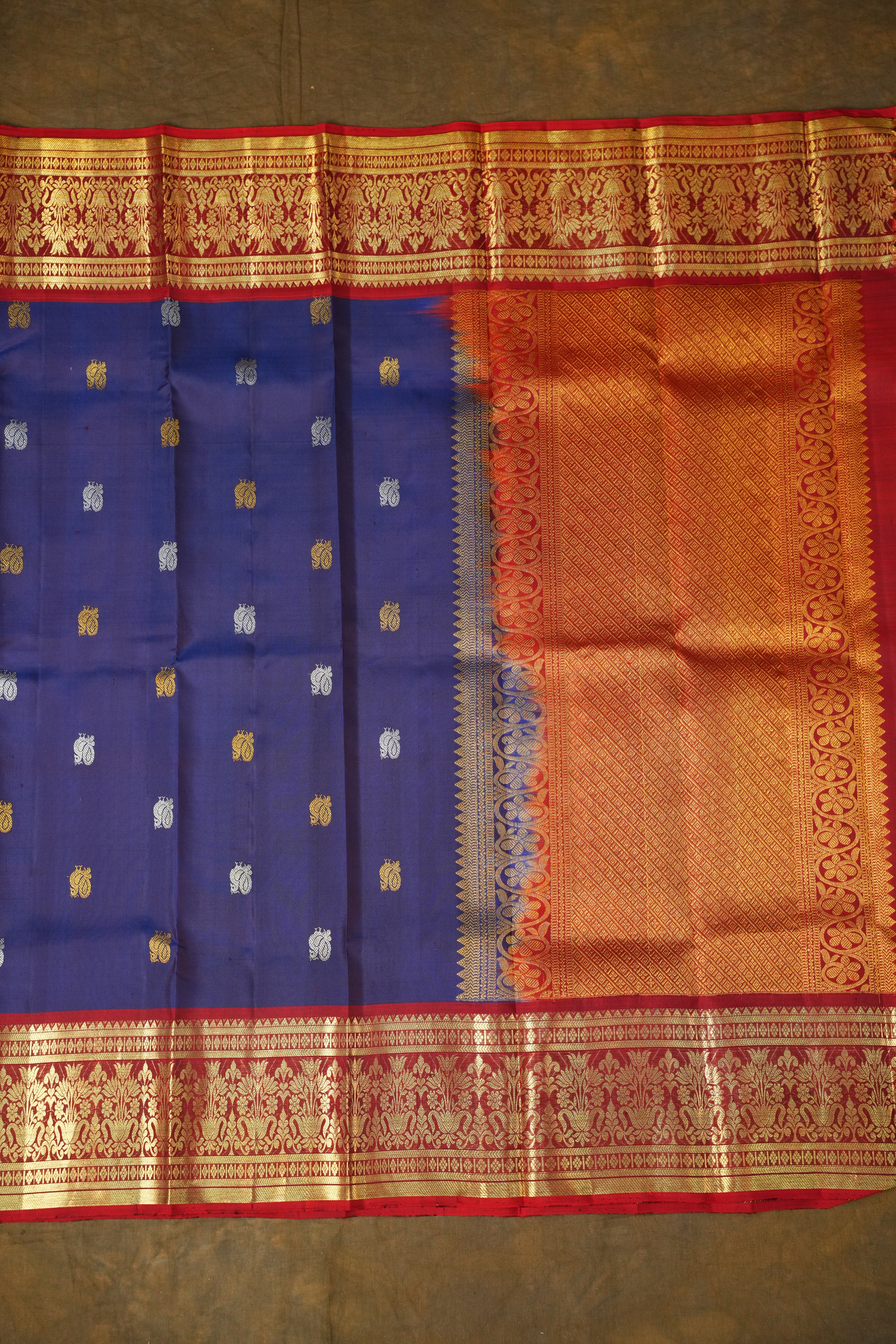This beautiful Gadwal dupatta features a vibrant Dark Navy Blue body adorned with subtle gold & Silver zari buttas, offering a refined and elegant look. The contrast maroon border and pallu, woven with intricate gold zari floral and traditional motifs, add a rich and regal finish. Perfect for festive and traditional occasions, this dupatta showcases the timeless charm of Gadwal craftsmanship.