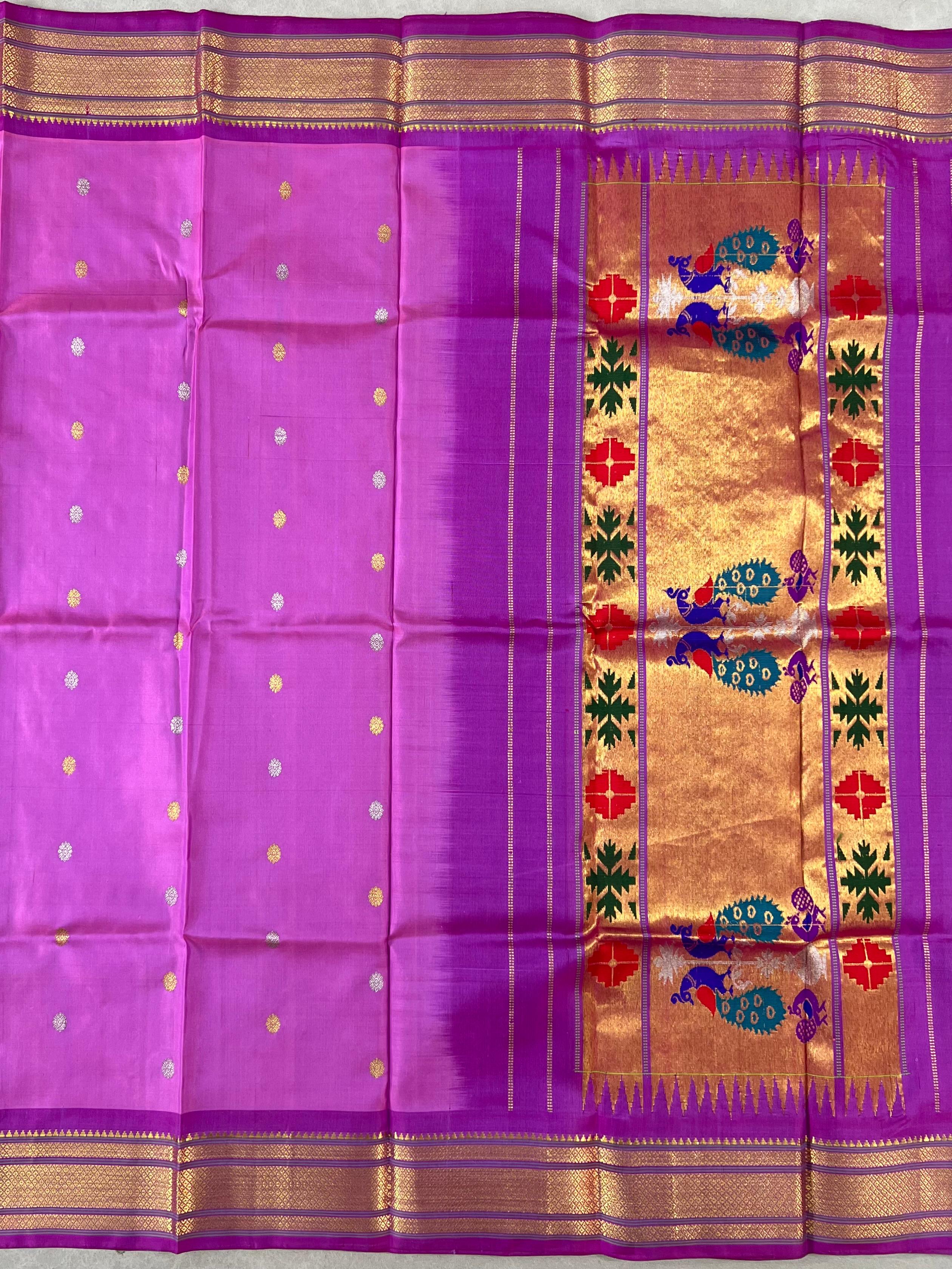 This elegant Gadwal Pure Silk Handloom Dupatta features a Baby pink body with gold and silver motifs. The highlight is its grand pallu, adorned with exquisite Muniya motifs and traditional patterns, self bordered with a subtle gold zari detailing. A perfect blend of heritage and luxury, this dupatta adds a regal charm to any attire. Silk Mark Certified.