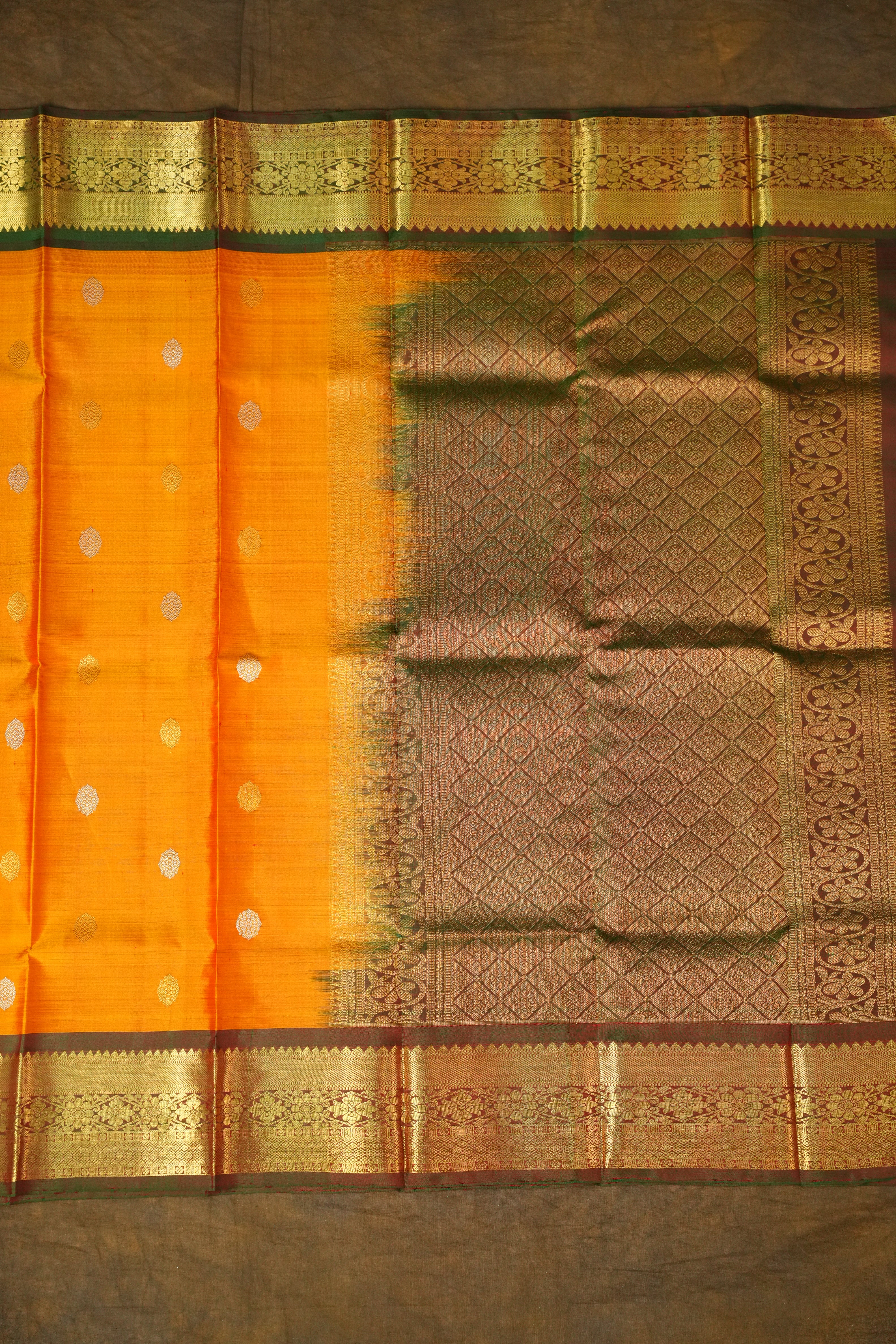 This beautiful Gadwal dupatta features a vibrant Mustard Yellow body adorned with subtle gold & Silver zari buttas, offering a refined and elegant look. The contrast mehendi green border and pallu, woven with intricate gold zari floral and traditional motifs, add a rich and regal finish. Perfect for festive and traditional occasions, this dupatta showcases the timeless charm of Gadwal craftsmanship.