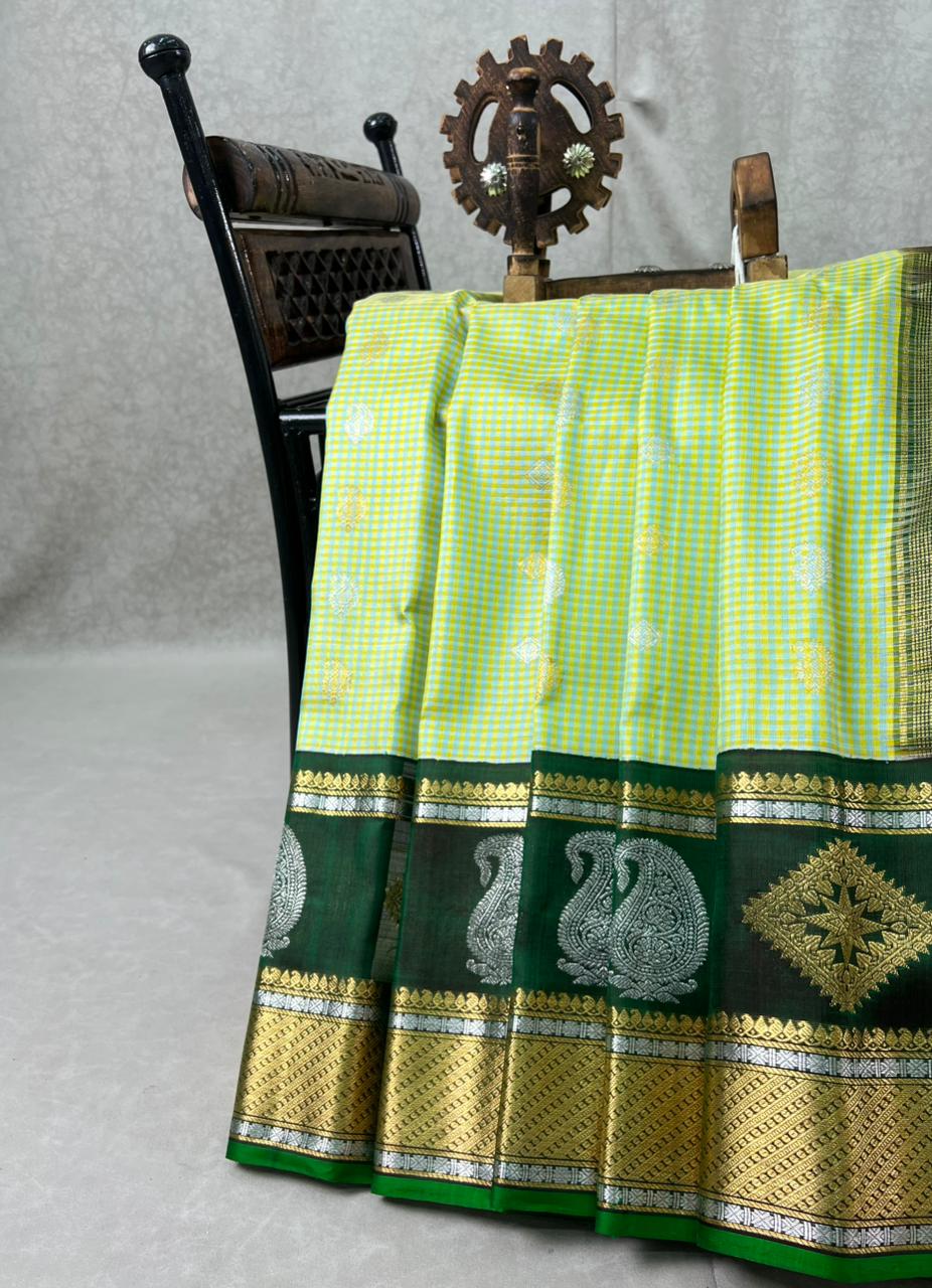 This Exclusive Gadwal Pure Silk Gap Border Saree showcases a Multicolor body woven with fine Gindham checks, highlighted with elegant gold and silver zari stripes with buttas that add a graceful sheen. The saree is beautifully contrasted by a Dark green gap border, intricately crafted with traditional Gold and Silver motifs in shimmering gold and silver zari detaling, reflecting the timeless heritage of Gadwal handloom artistry. Finished with a refreshing Green selvedge, This saree comes with contrast blouse and it is Silk mark certified