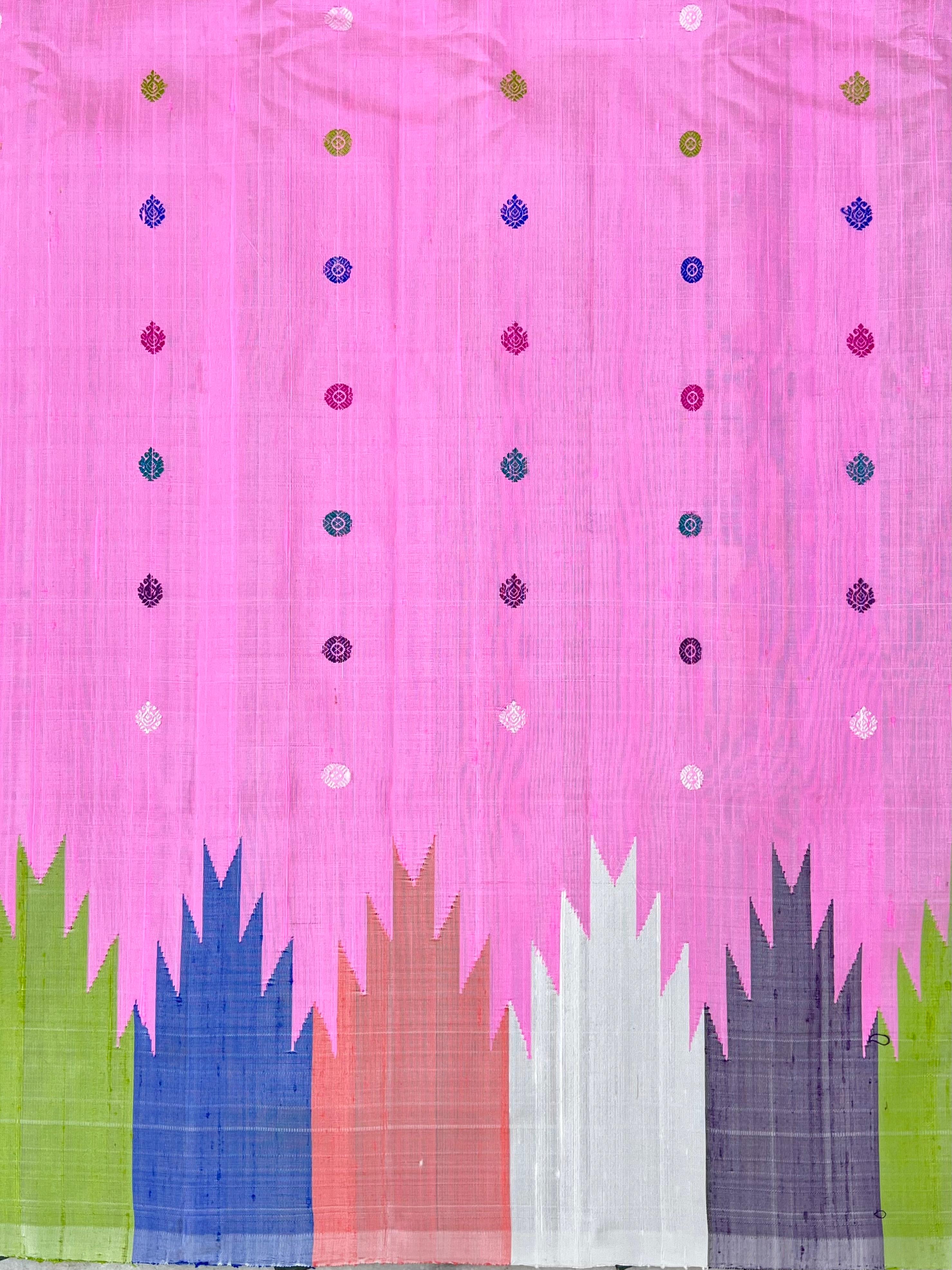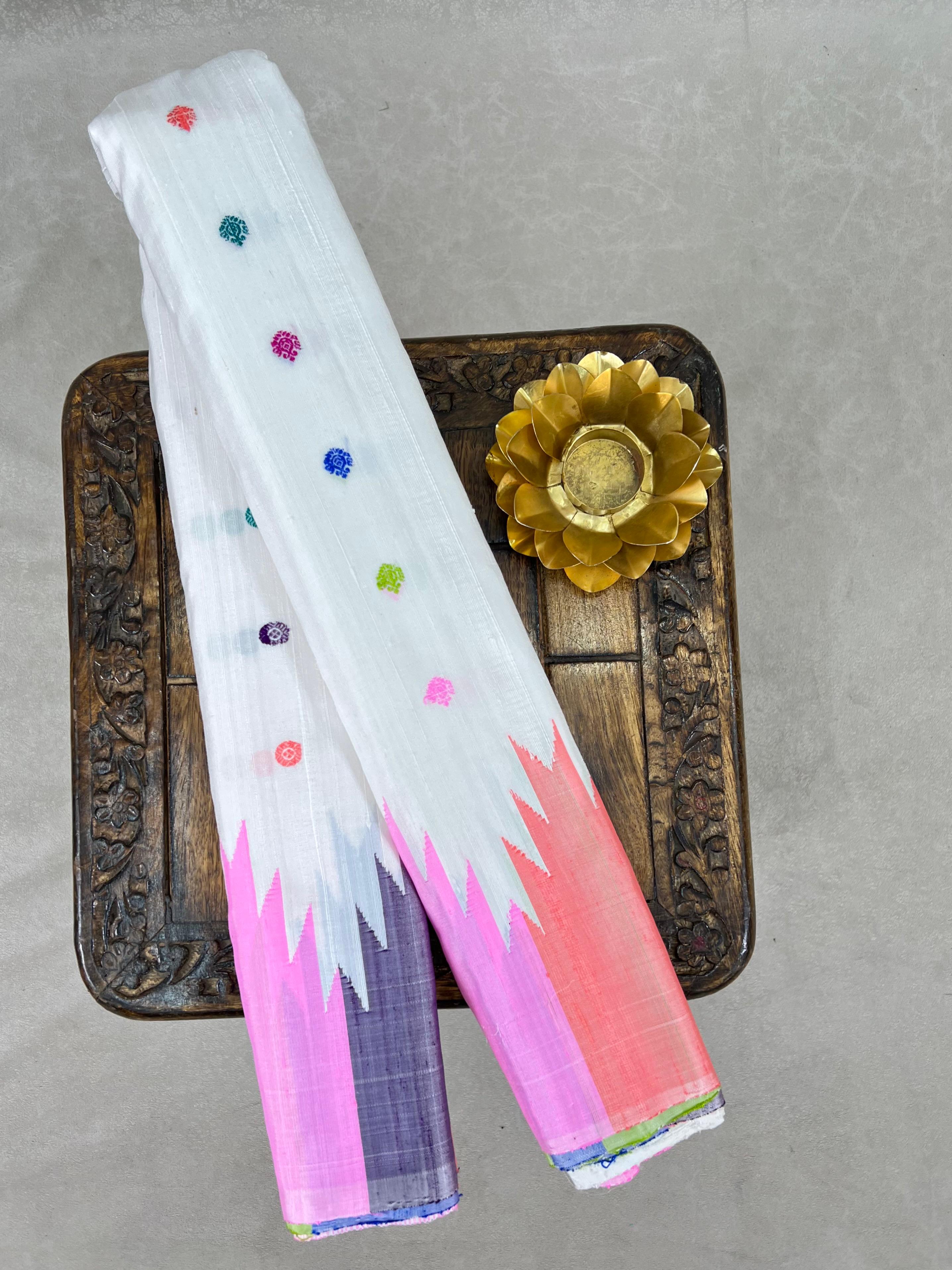 This beautiful Gadwal Dupion Silk Saree showcases a pristine white body adorned with vibrant multi-color buttas that add a joyful touch of tradition to its refined simplicity. The saree comes alive with its striking multi-shade temple border, featuring a harmonious blend of Multi-color patterns that create a bold yet graceful contrast against the serene white backdrop. The smooth dupion silk texture enhances its natural sheen, making the drape look effortlessly elegant. Perfect for festive celebrations, daytime events, this saree beautifully merges minimalistic charm with colorful artistry-an authentic reflection of Gadwal craftsmanship. This saree comes with a contrast blouse and it is Silk Mark Certified, assuring premium quality and authenticity.