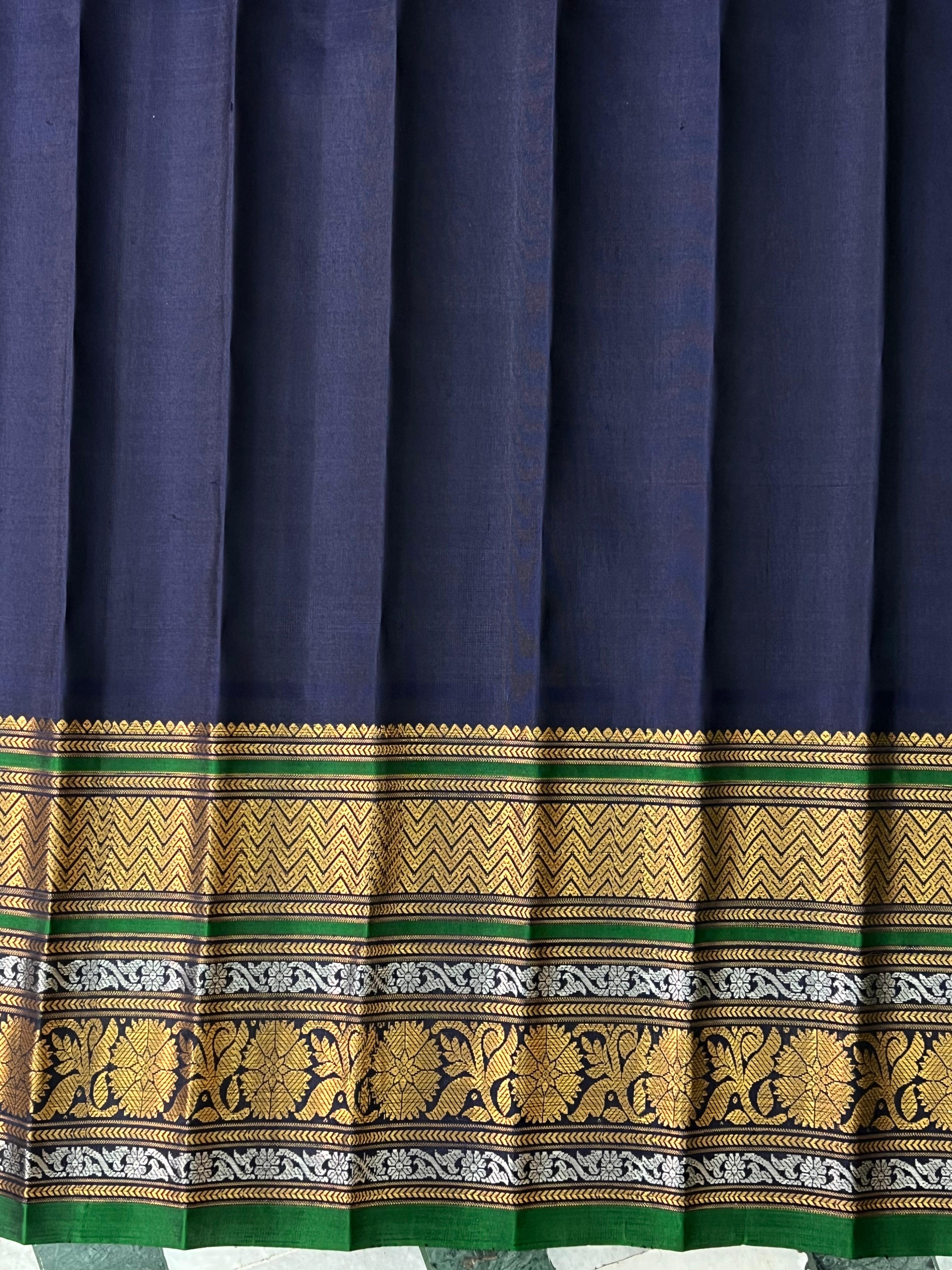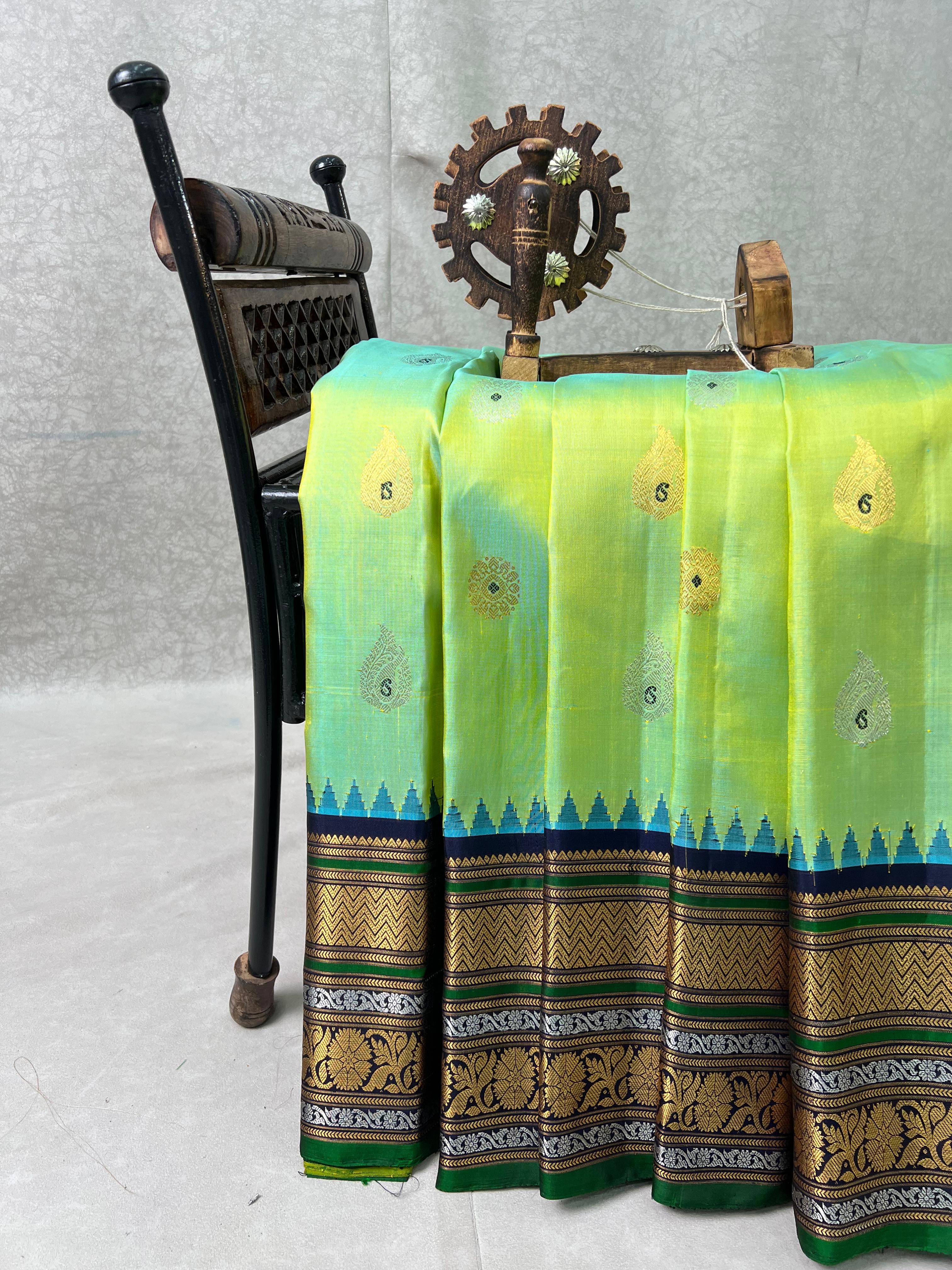 This exquisite Gadwal Pure Silk Handloom Saree is a blend of tradition and elegance. The vibrant parrot green body is adorned with delicate gold and silver buttas, while the striking navy blue border features intricate gold and silver zari work with temple motifs and floral patterns with green selvedge. A true heirloom piece that celebrates heritage with a contemporary touch. Comes with a contrast blouse, making it a perfect choice for festive occasions and grand celebrations!. Silk Mark Certified.