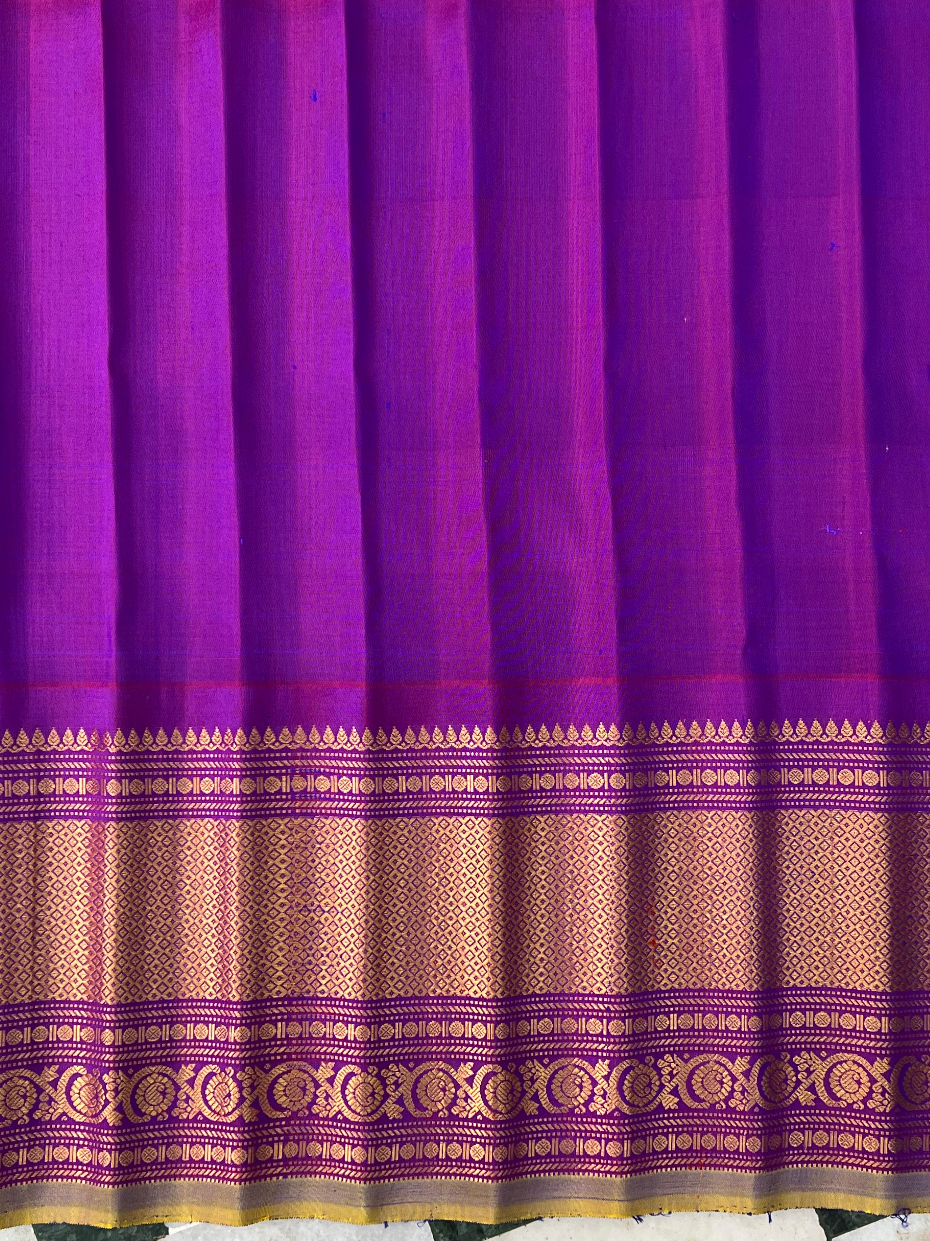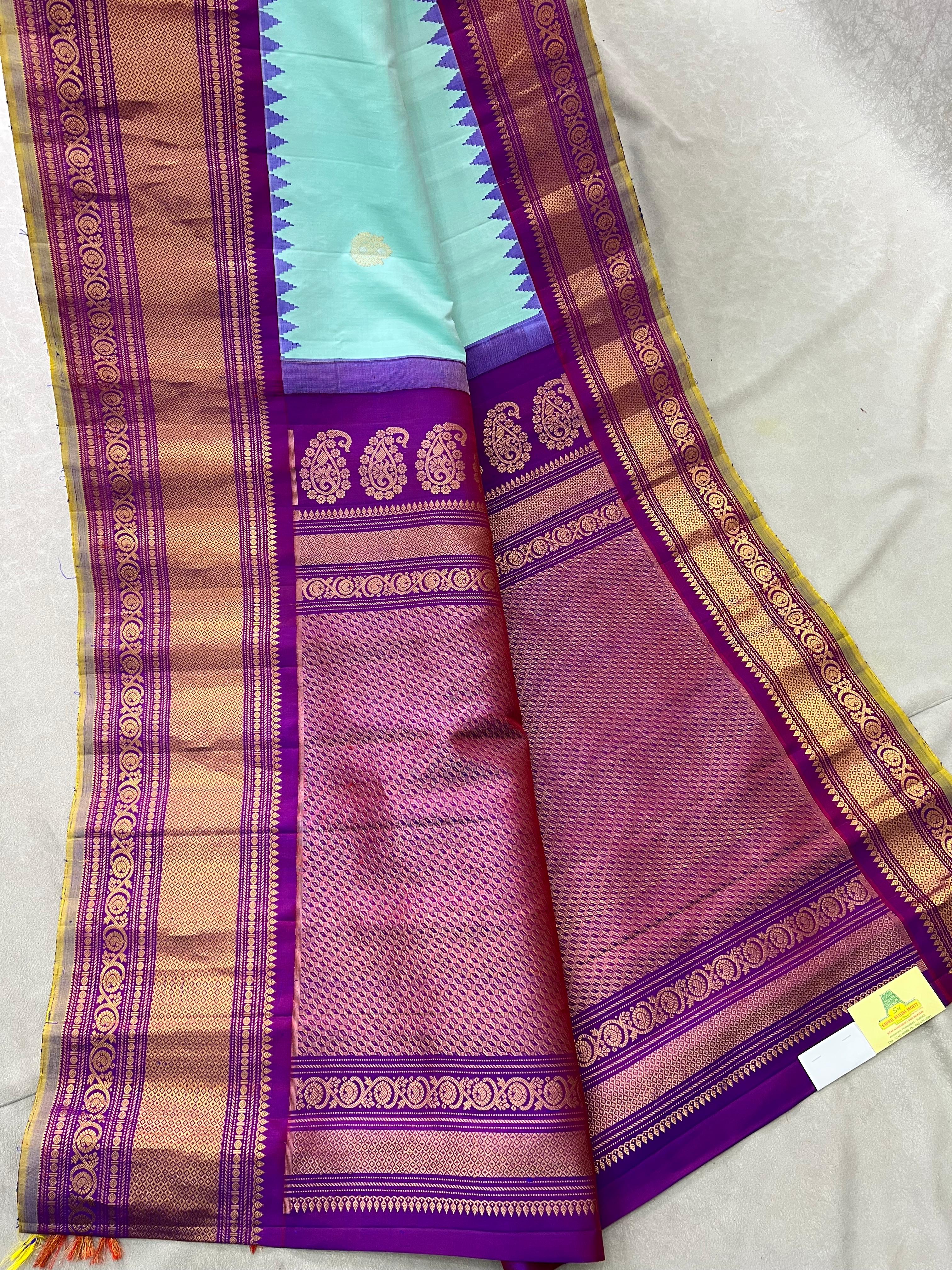 This exquisite Gadwal Pure Silk Handloom Saree is a blend of tradition and elegance. The vibrant sea blue body is adorned with delicate gold buttas, while the striking magenta border features intricate gold zari work with temple motifs and floral patterns with light green selvedge.  A true heirloom piece that celebrates heritage with a contemporary touch. Comes with a contrast blouse, making it a perfect choice for festive occasions and grand celebrations!. Silk Mark Certified.