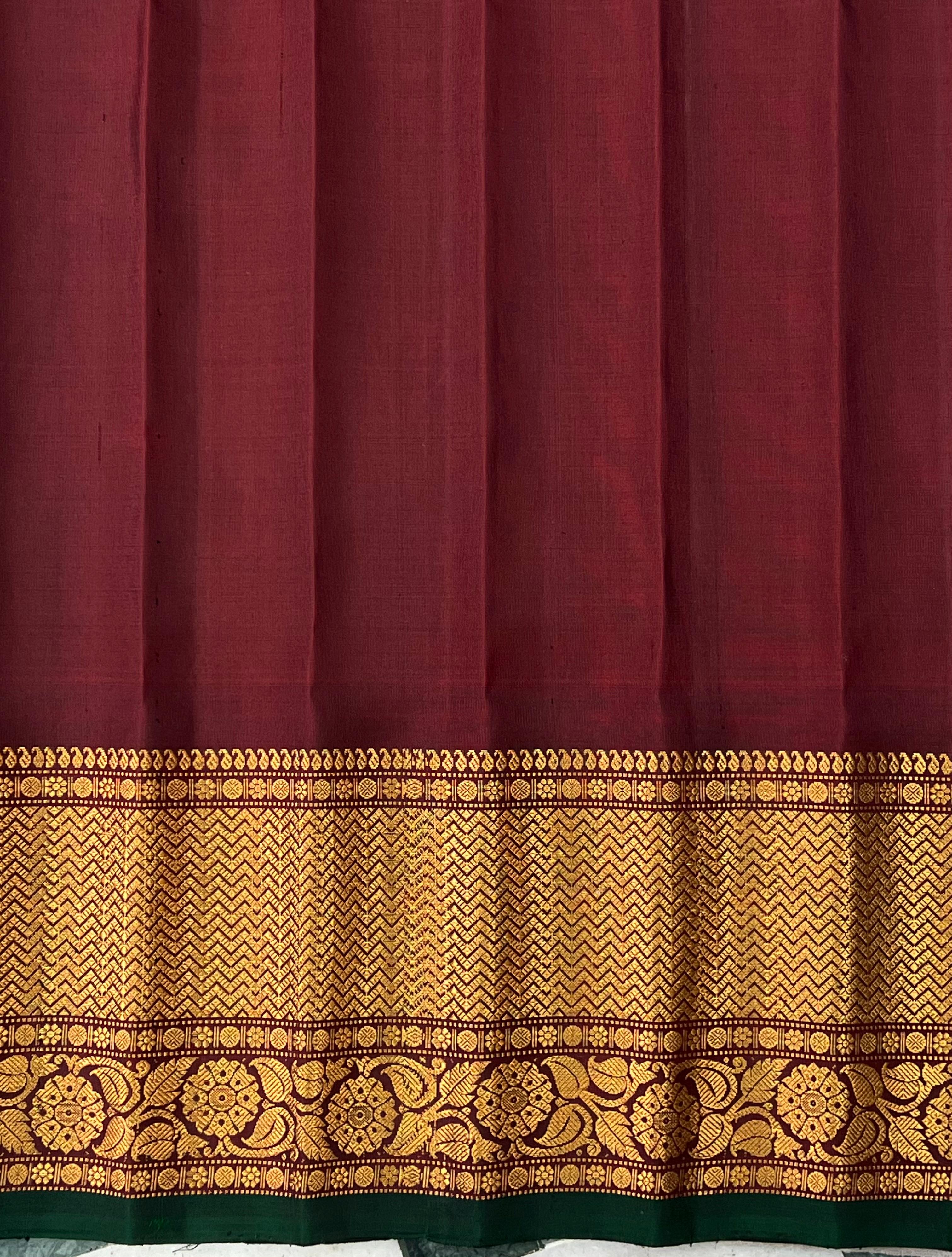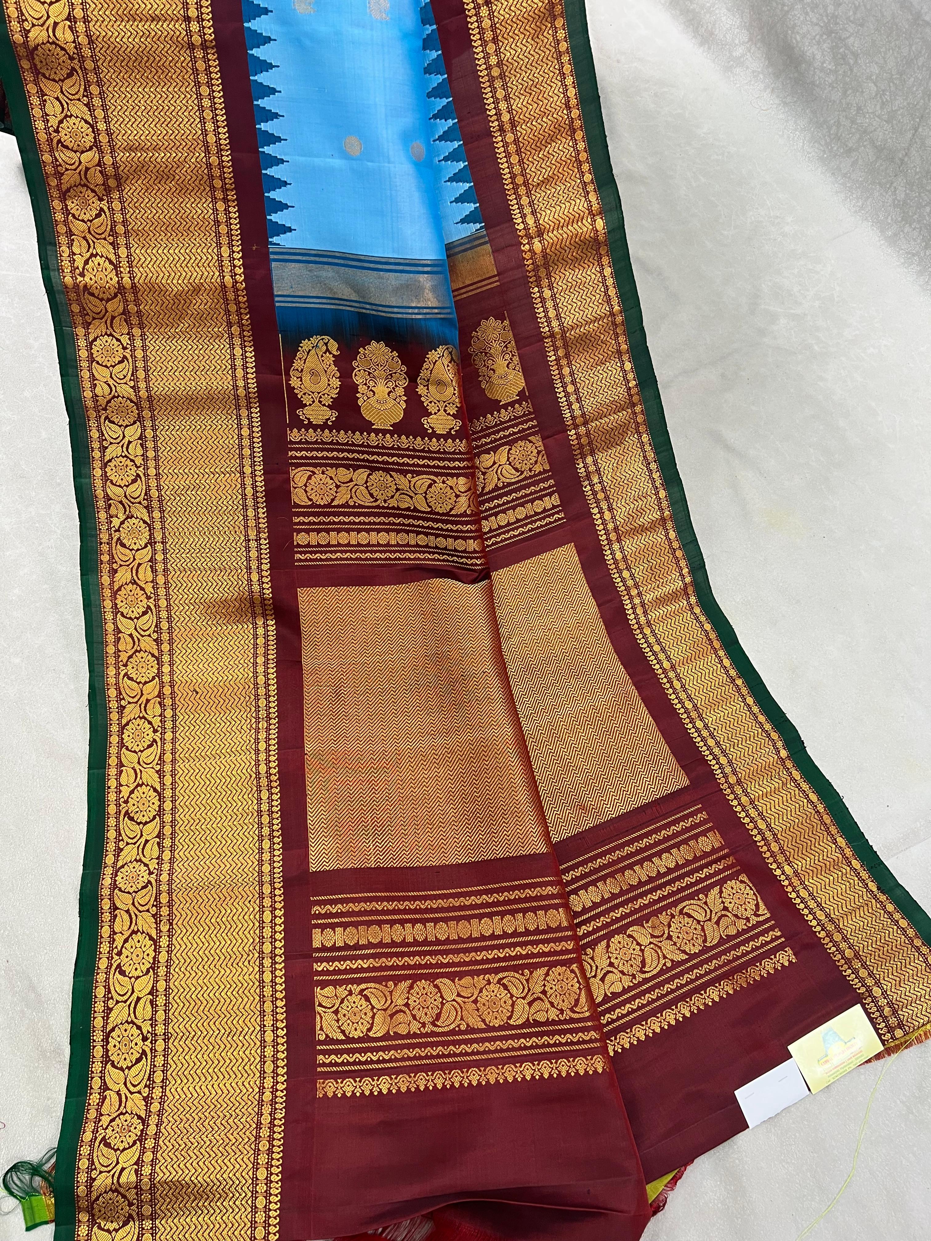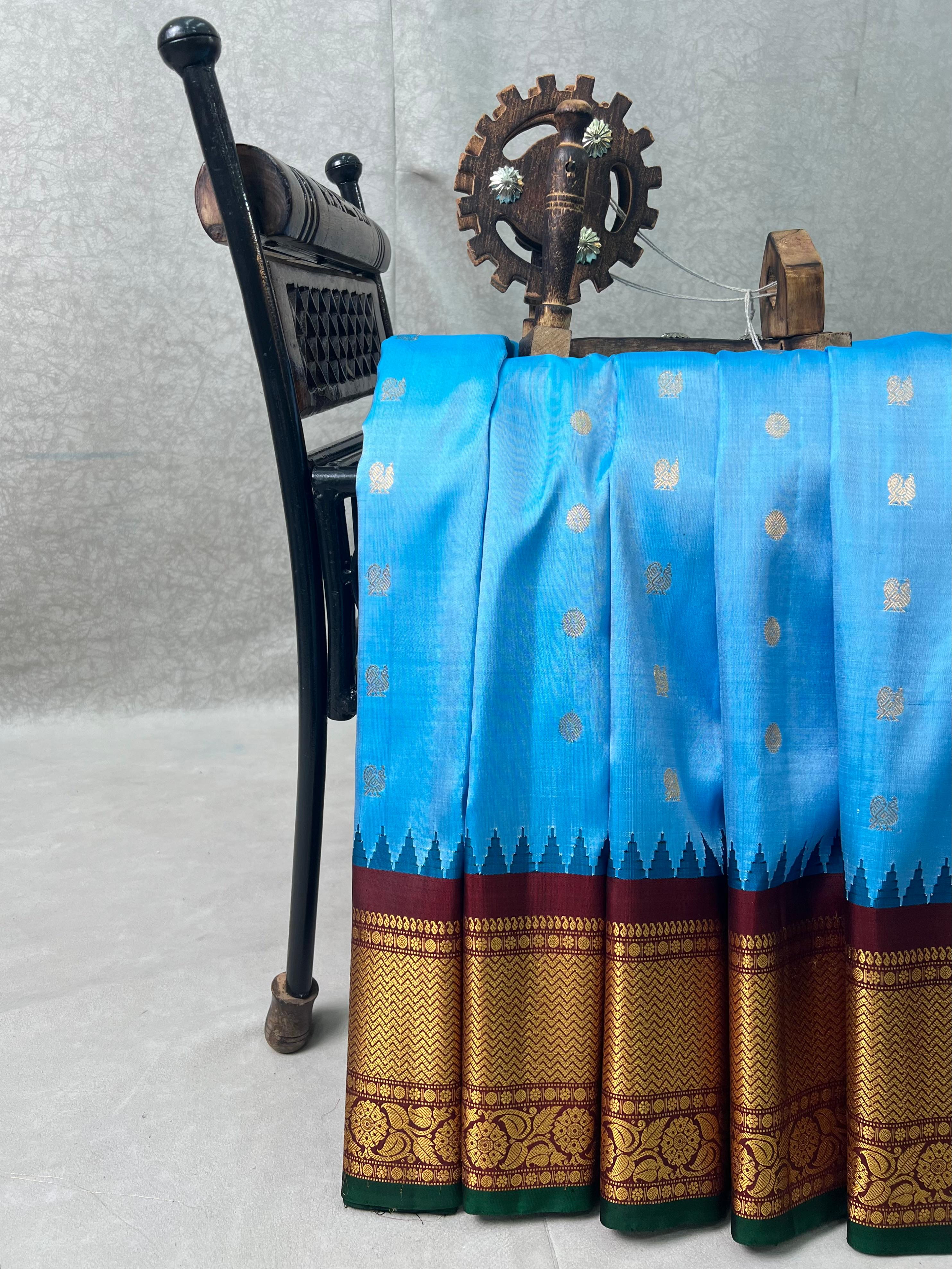 This exquisite Gadwal Pure Silk Handloom Saree is a blend of tradition and elegance. The vibrant ice blue body is adorned with delicate gold buttas, while the striking maroon border features intricate gold zari work with temple motifs and floral patterns with green selvedge.  A true heirloom piece that celebrates heritage with a contemporary touch. Comes with a contrast blouse, making it a perfect choice for festive occasions and grand celebrations!. Silk Mark Certified.