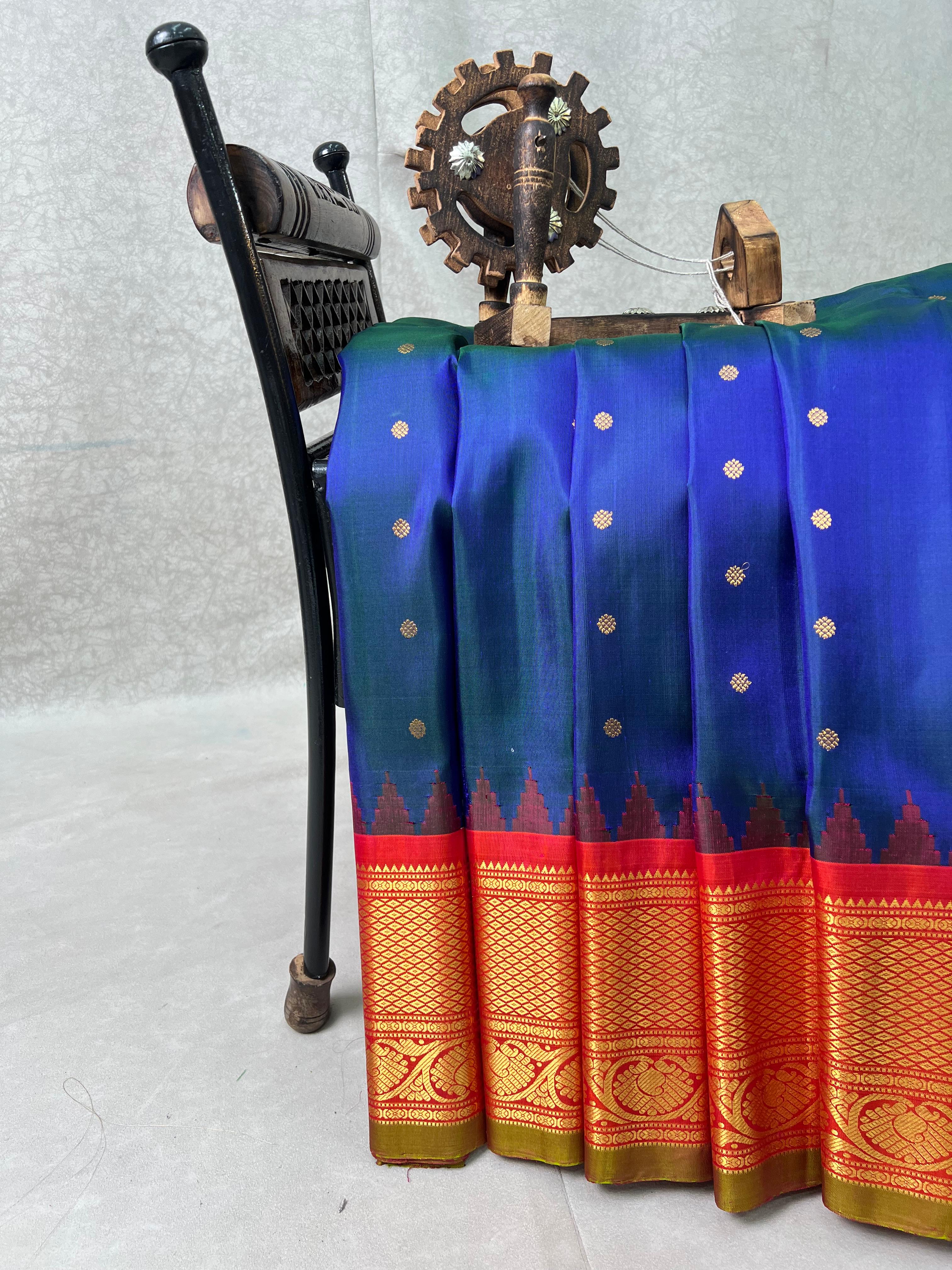 This exquisite Gadwal Pure Silk Handloom Saree is a blend of tradition and elegance. The vibrant royal blue body is adorned with delicate gold buttas, while the striking red border features intricate golden zari work with temple motifs and floral patterns.  A true heirloom piece that celebrates heritage with a contemporary touch.Comes with a contrast blouse, making it a perfect choice for festive occasions and grand celebrations!. Silk Mark Certified.