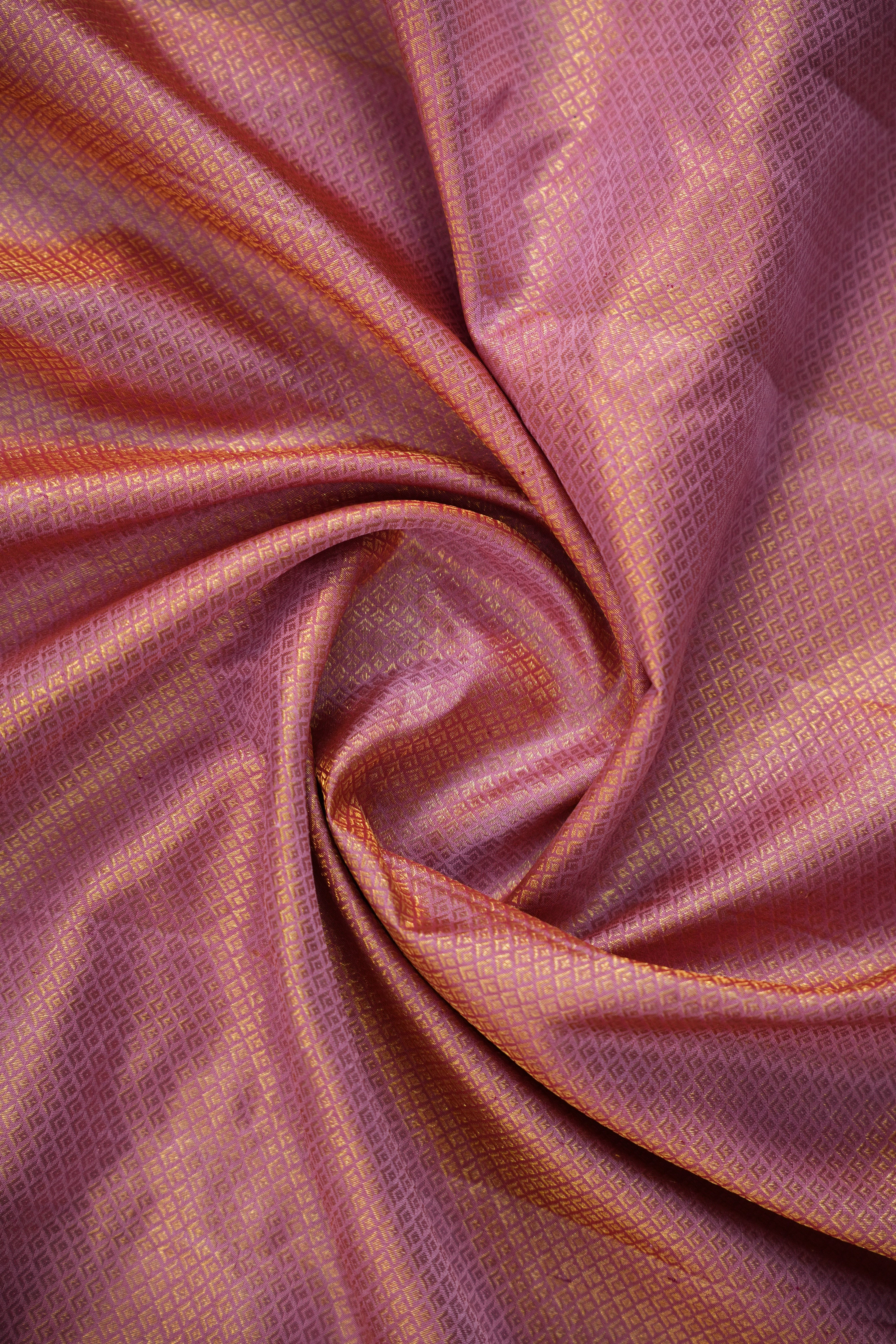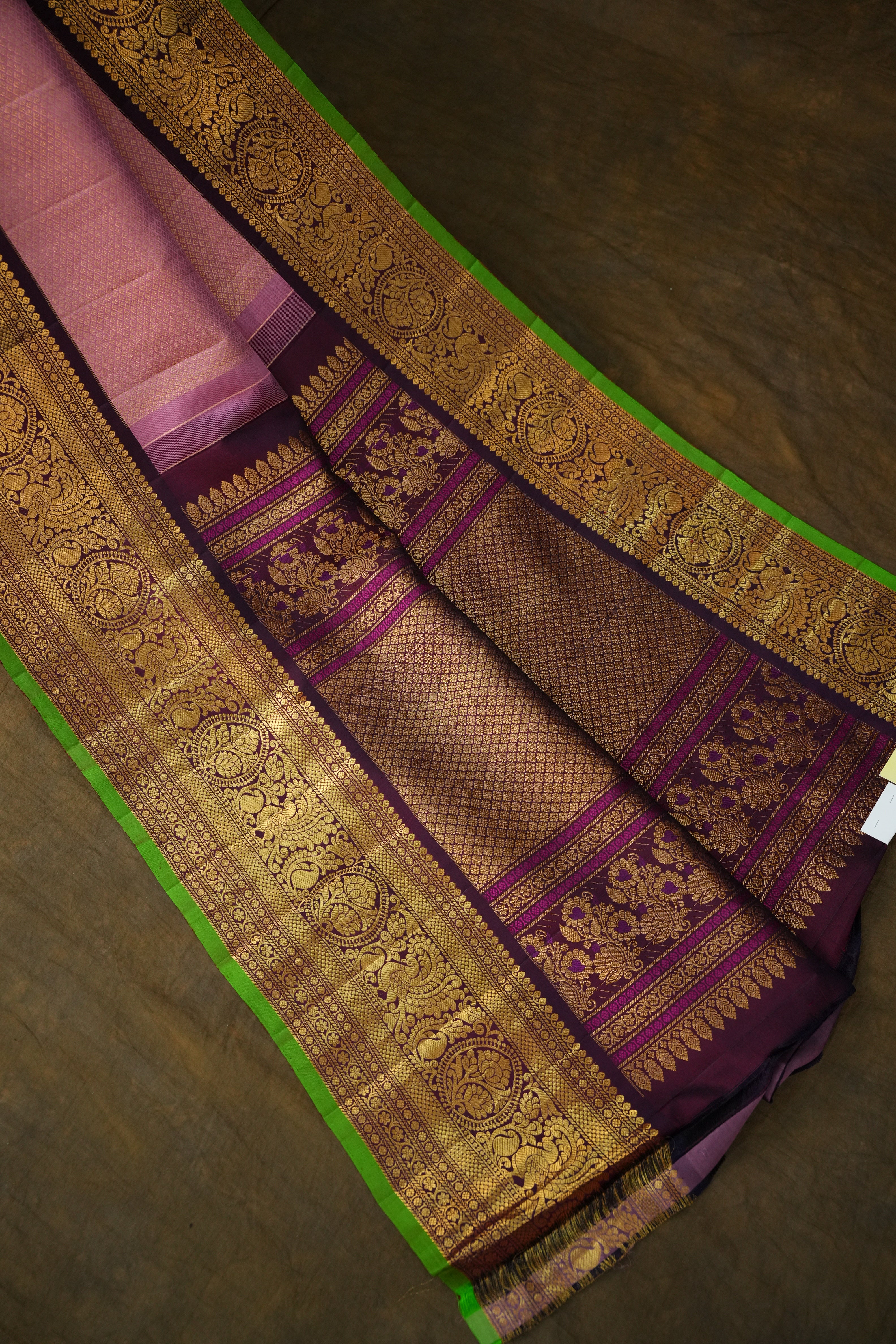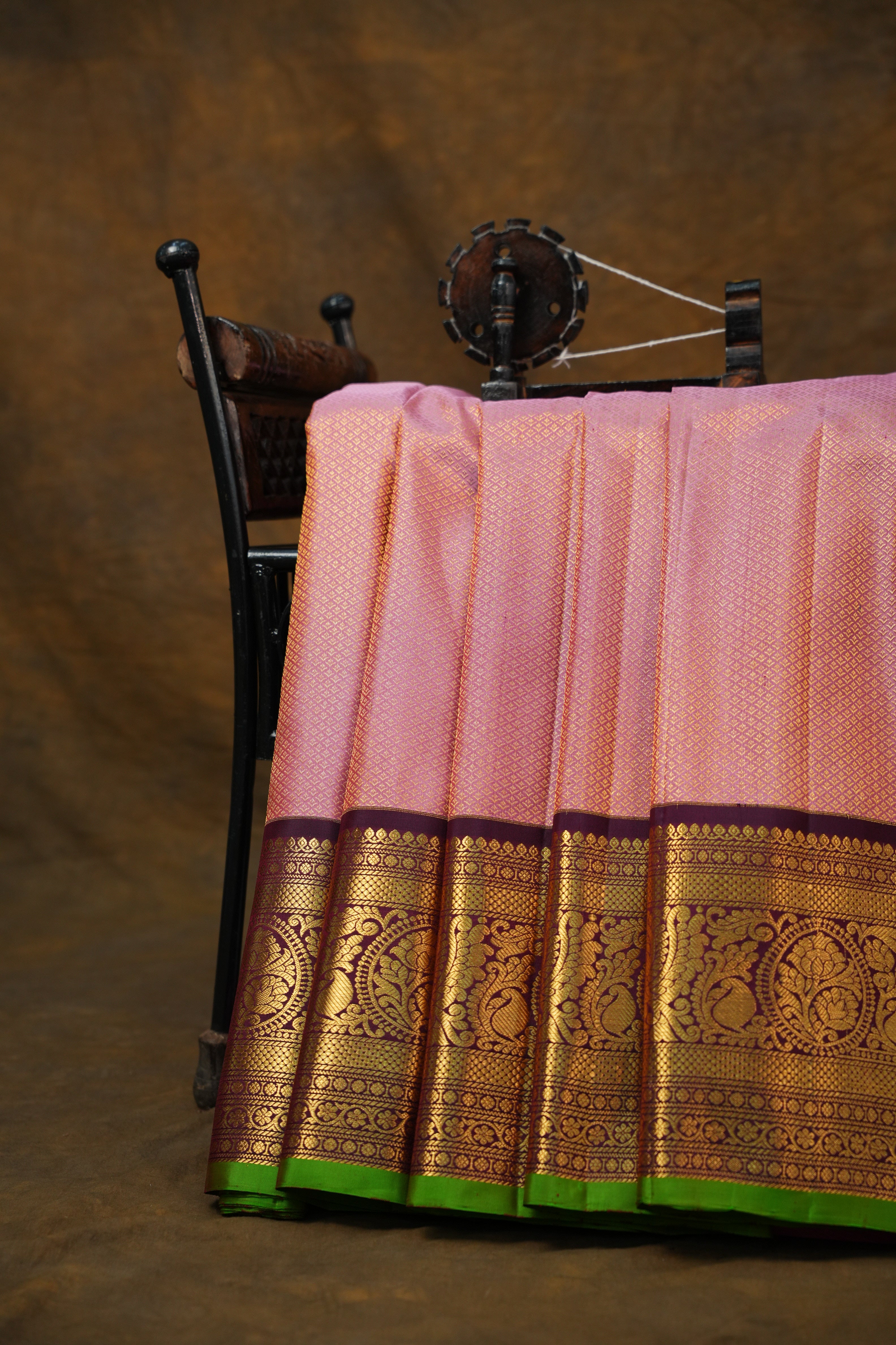 This stunning Gadwal Pure Silk Brocade Handloom saree features a finely woven Peach body beautifully adorned with Gold zari brocade motifs adding a graceful traditional charm and contrasted by a Chocolate brown border and pallu adorned with rich gold zari floral motifs. The saree is tastefully finished with a green selvedge, adding a charming pop of color to this regal ensemble - perfect for weddings and festive celebrations. Comes with contrast blouse and is Silk Mark Certified.