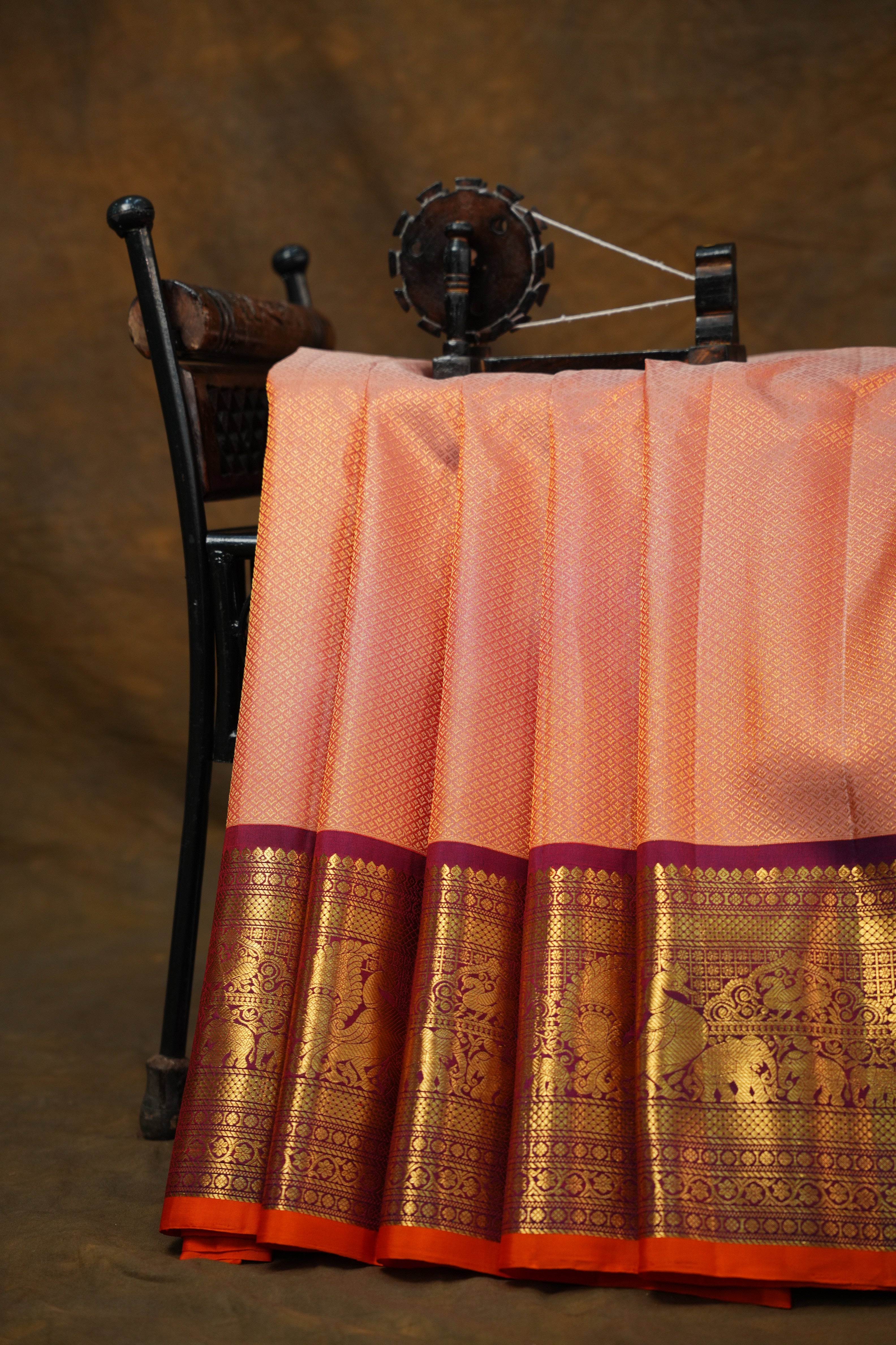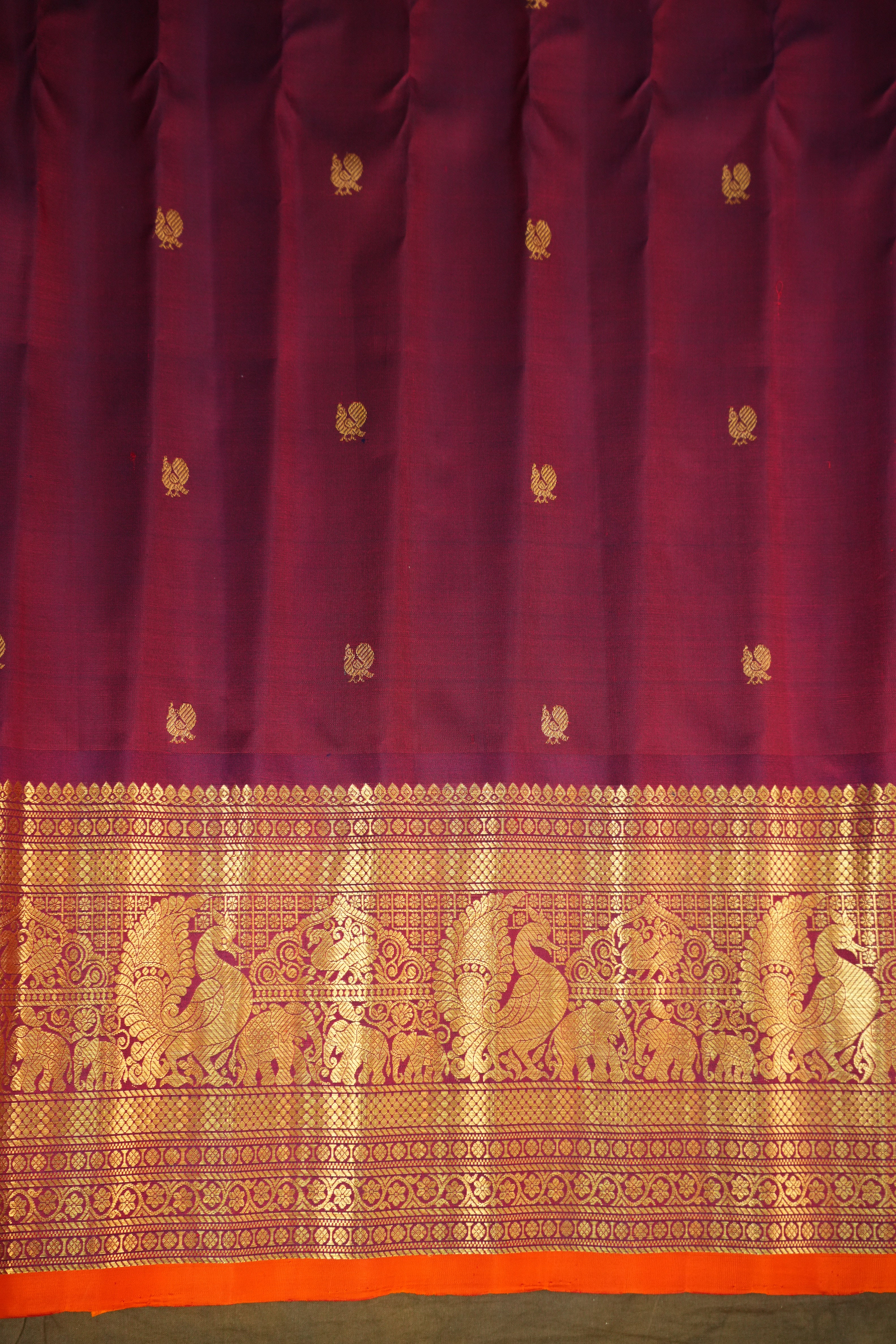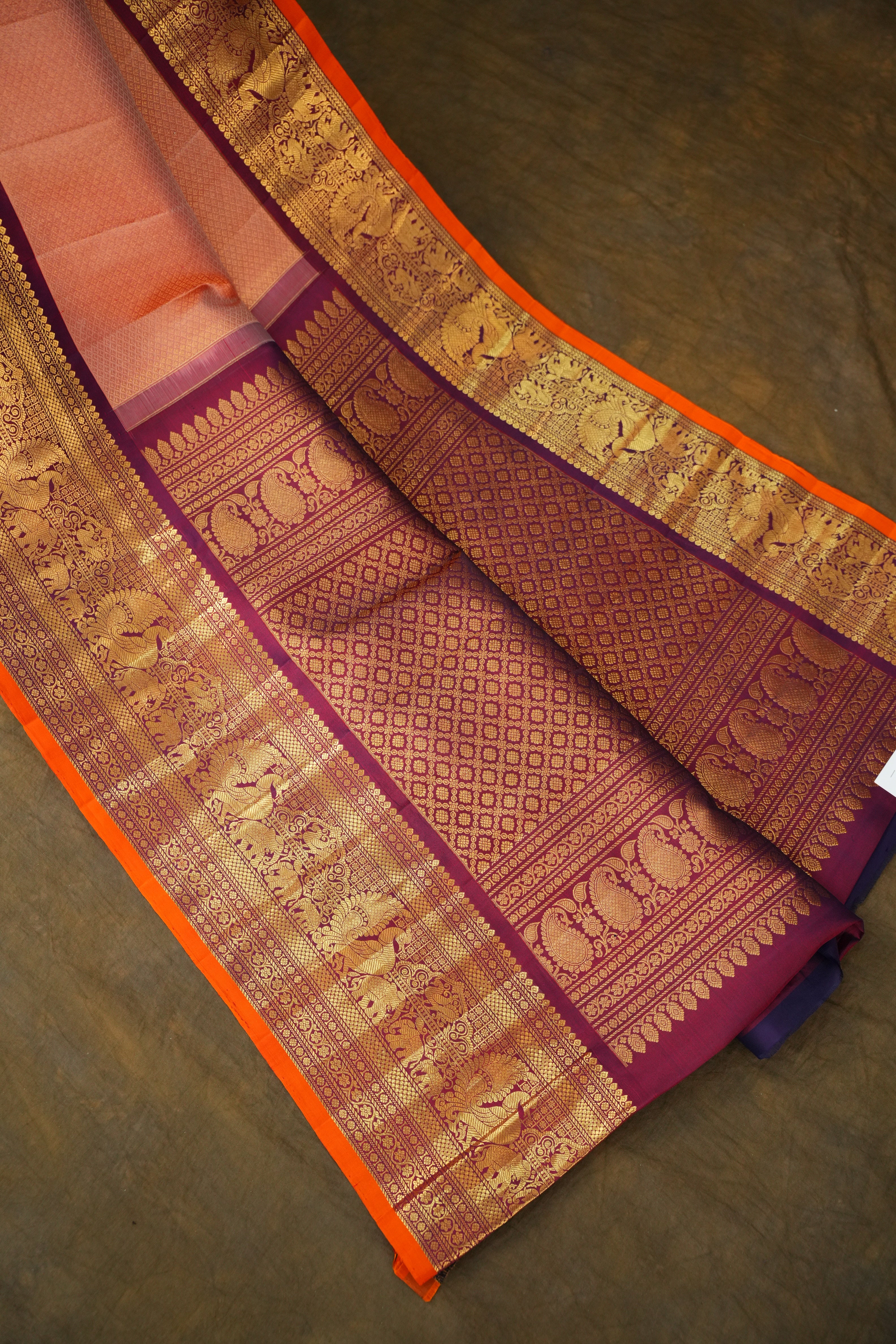 This stunning Gadwal Pure Silk Brocade Handloom saree features a finely woven Peach body beautifully adorned with Gold zari brocade motifs adding a graceful traditional charm and contrasted by a wine magenta border and pallu adorned with rich gold zari floral motifs. The saree is tastefully finished with a orange selvedge, adding a charming pop of color to this regal ensemble - perfect for weddings and festive celebrations. Comes with contrast blouse and is Silk Mark Certified.