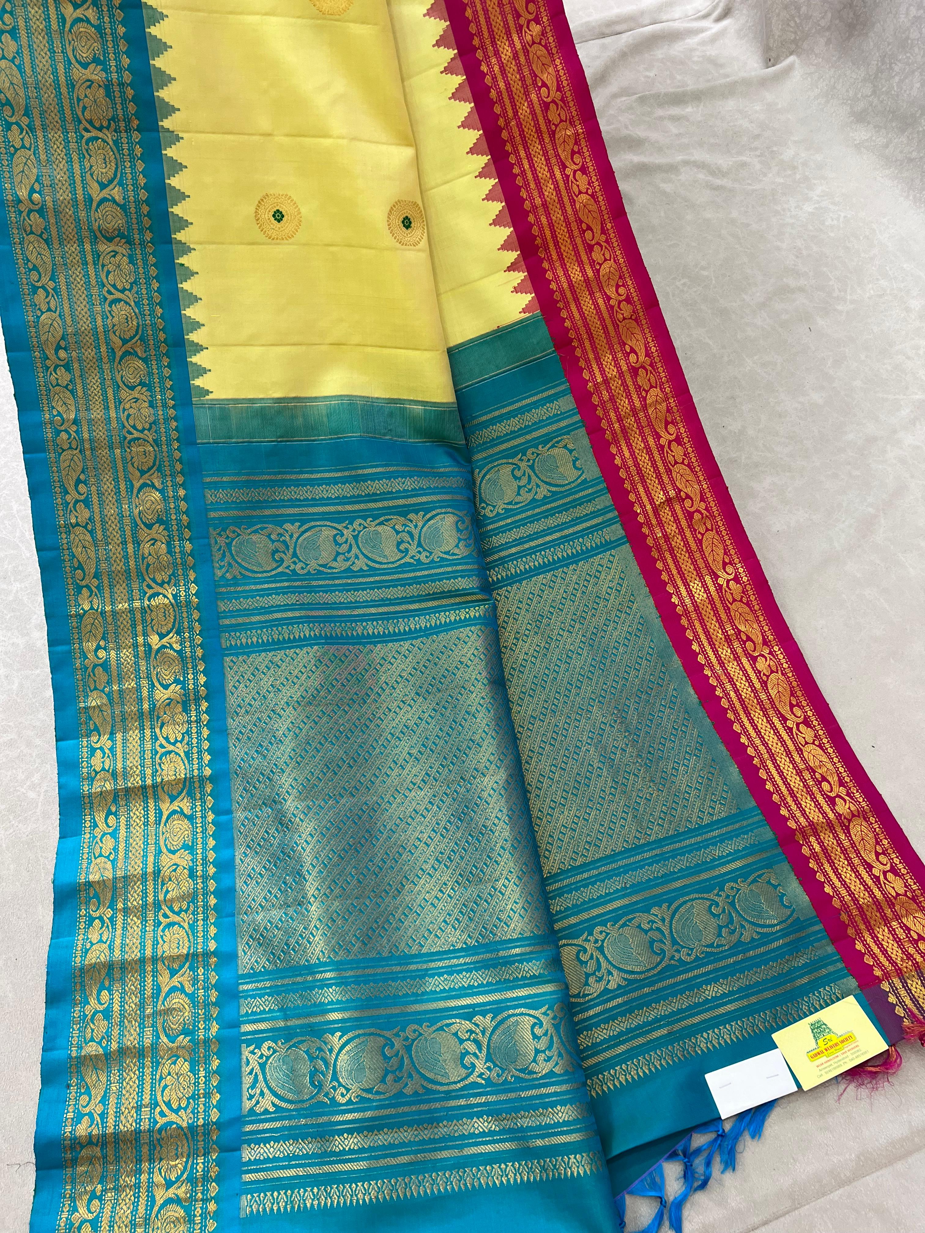 This exquisite Gadwal Pure Silk Handloom Saree showcases timeless elegance with a Butter yellow body, adorned with delicate gold zari meena buttas spread evenly across the body. The highlight of this masterpiece is its stunning Ganga Jamuna border, featuring contrasting Pink and Rama green borders-each embellished with intricate gold zari detailing. Woven by skilled artisans, this saree embodies the grace of traditional handloom weaving, perfect for weddings, festivals, and grand occasions. Comes with a contrast blouse, and is Silk Mark certified for authenticity.