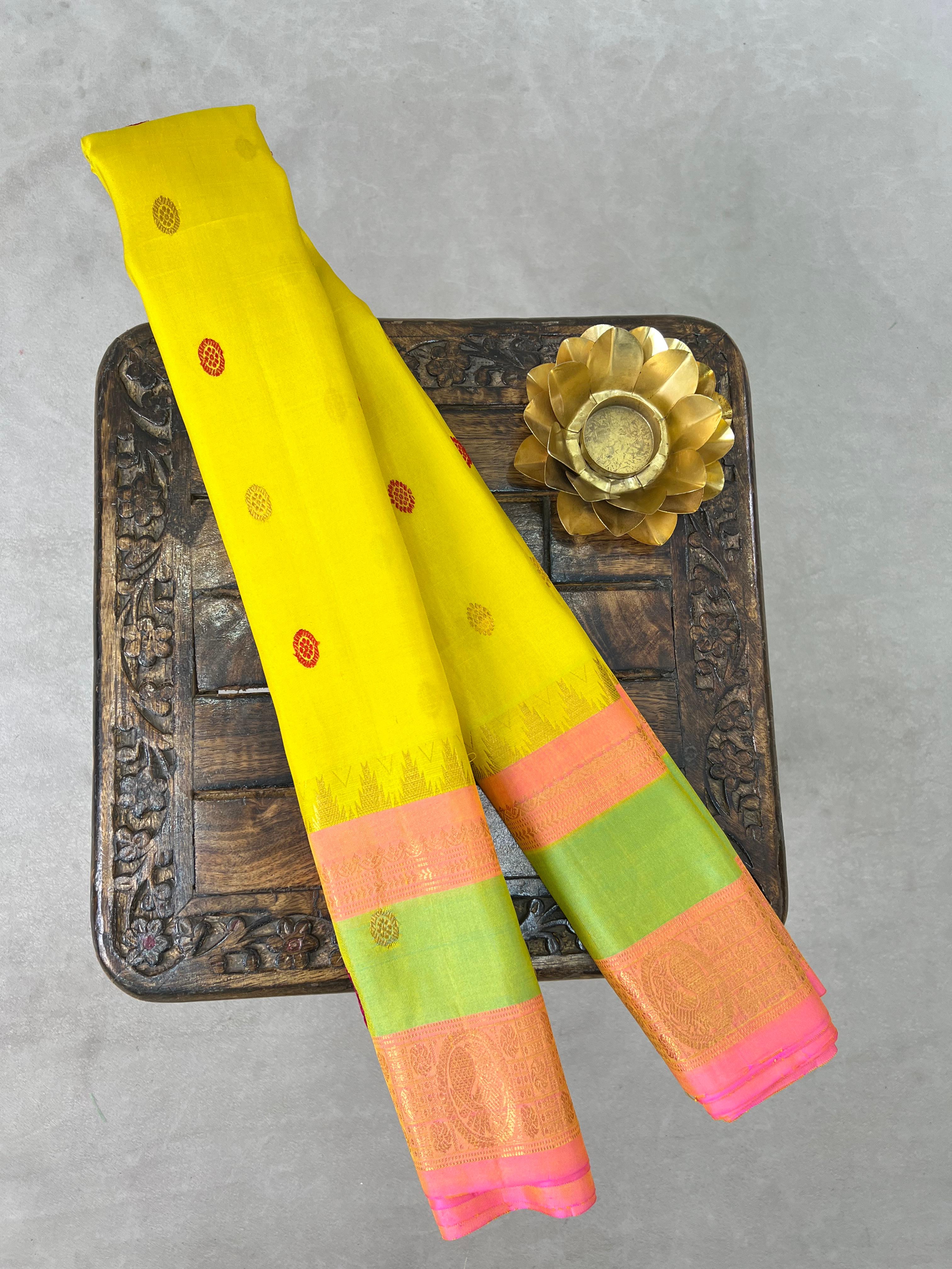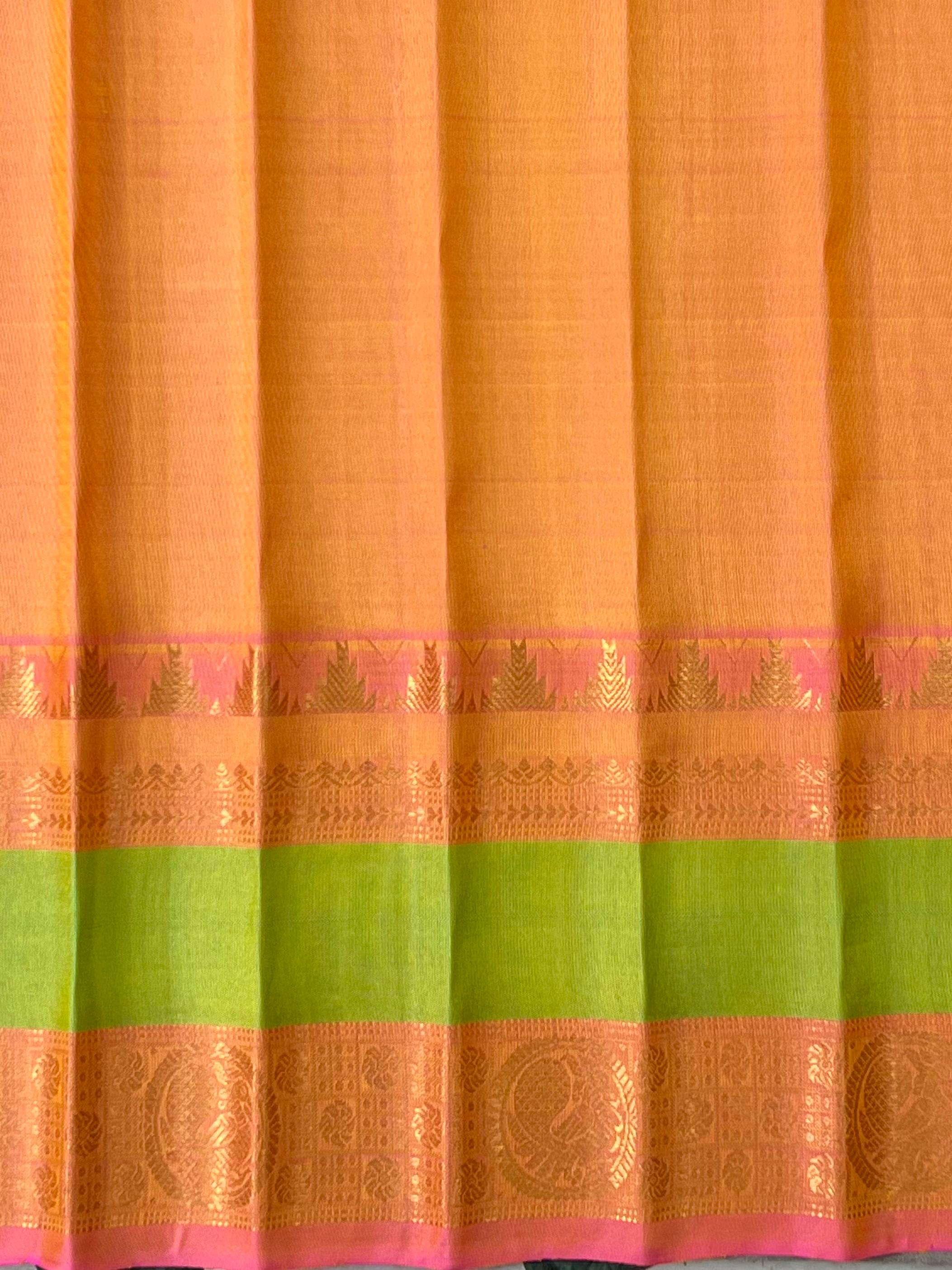 This Gadwal Pure Silk Handloom Saree features elegant yellow with delicate gold and thread buttas, beautifully complemented by a striking peach orange with green colour gap border adorned with thread and zari meena motifs with baby pink selvedge. The rich peach orange woven pallu with intricate zari designs adds grandeur, making it a perfect blend of tradition and luxury. Comes with contrast blouse and Silk Mark certified — perfect for traditional celebrations.