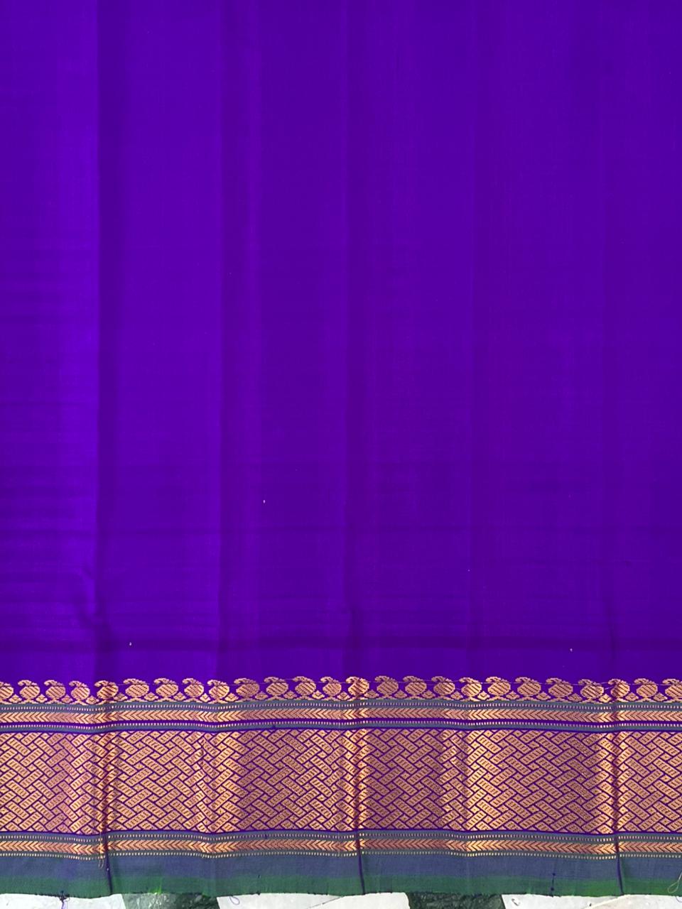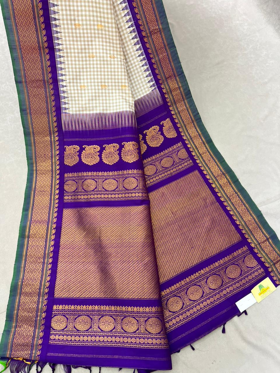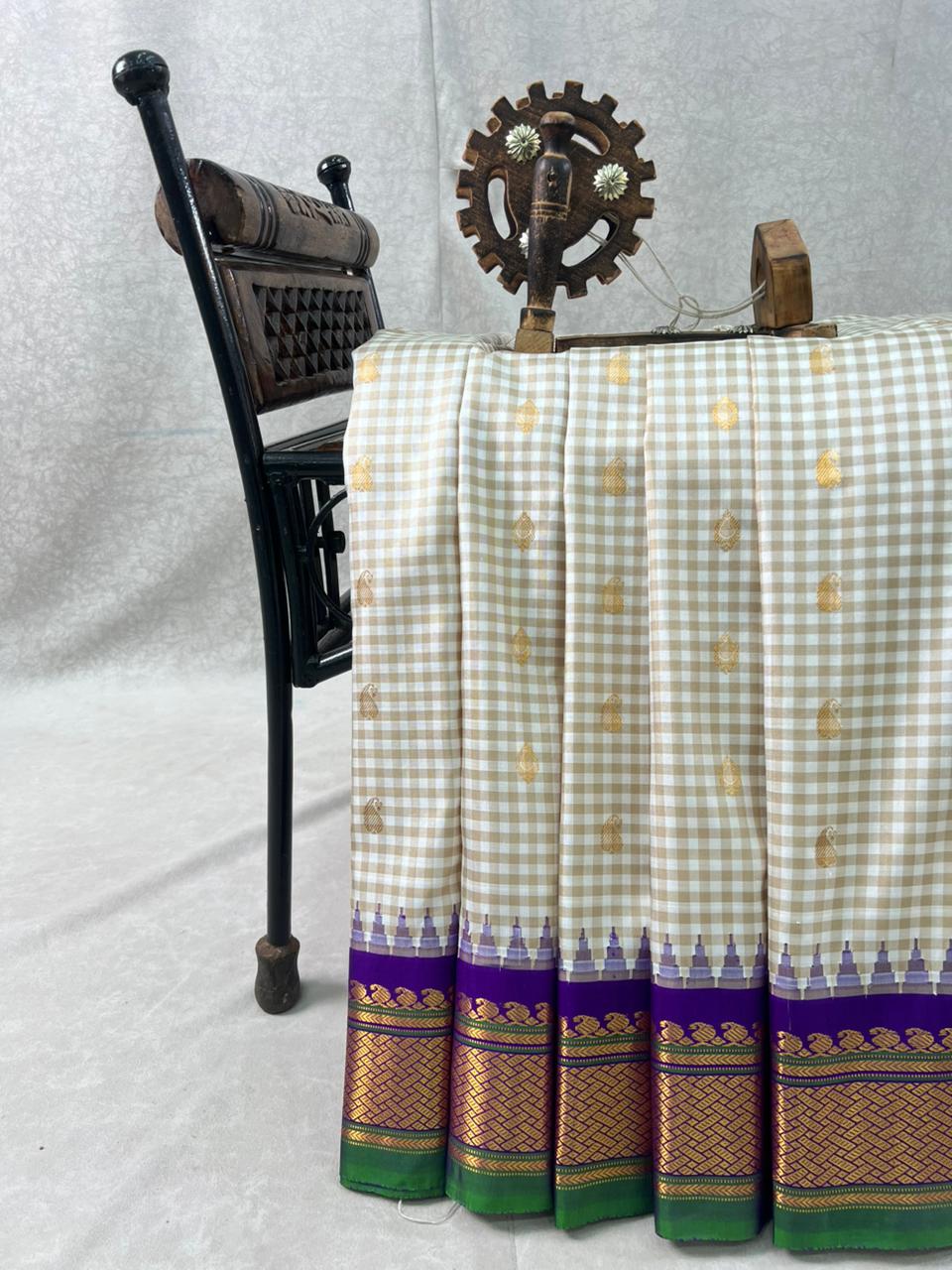An elegant blend of tradition and charm, this Gadwal Pure Silk Gingham Checks Saree features soft beige and white gingham checks adorned with delicate zari buttas. The rich contrast voilet border with intricate golden zari weaving adds a royal touch, while the signature Gadwal craftsmanship ensures unmatched finesse and drape. Perfect for festive and graceful occasions. Comes with a contrast blouse, making it a perfect choice for festive occasions and grand celebrations!. Silk Mark Certified.