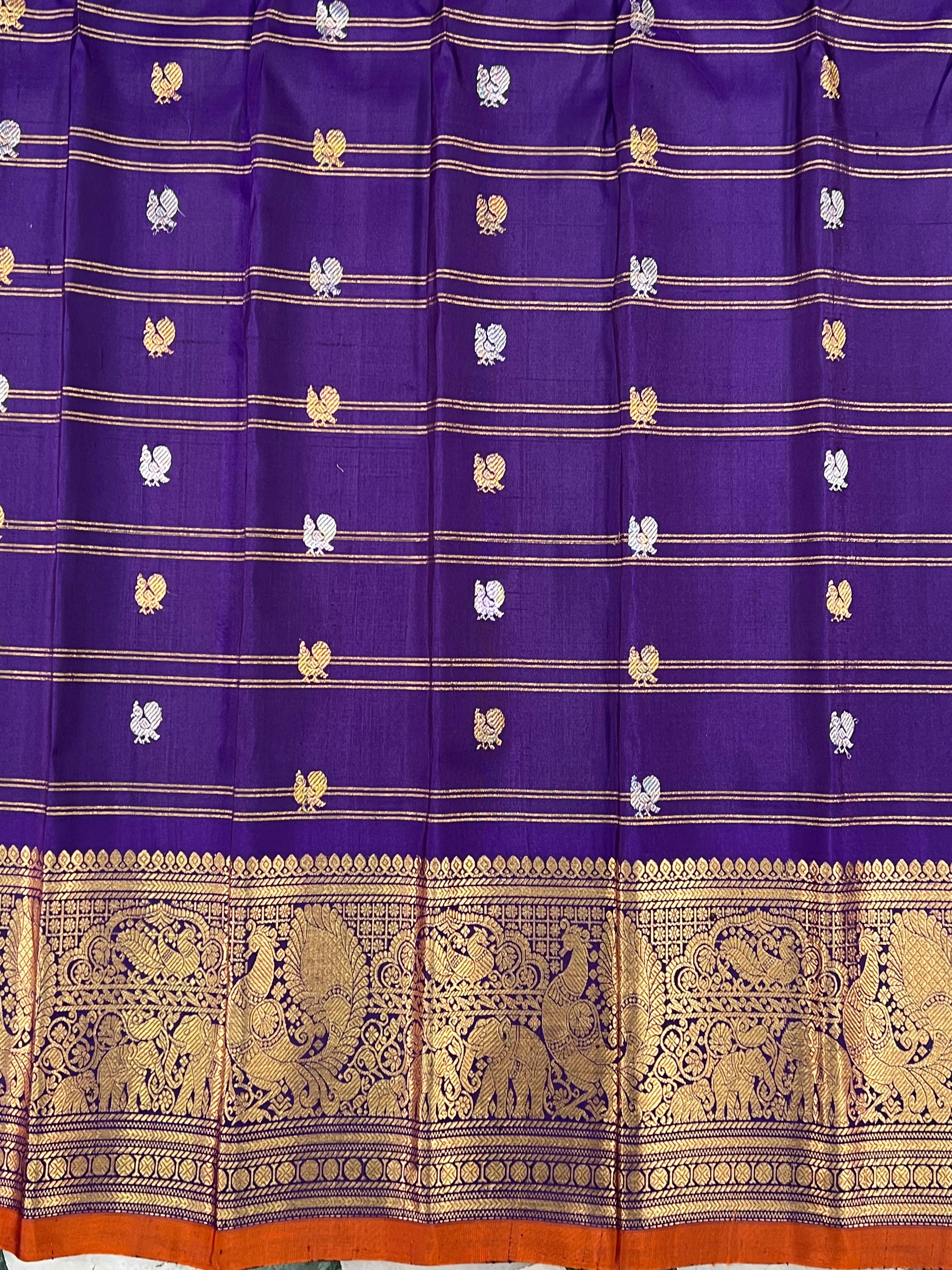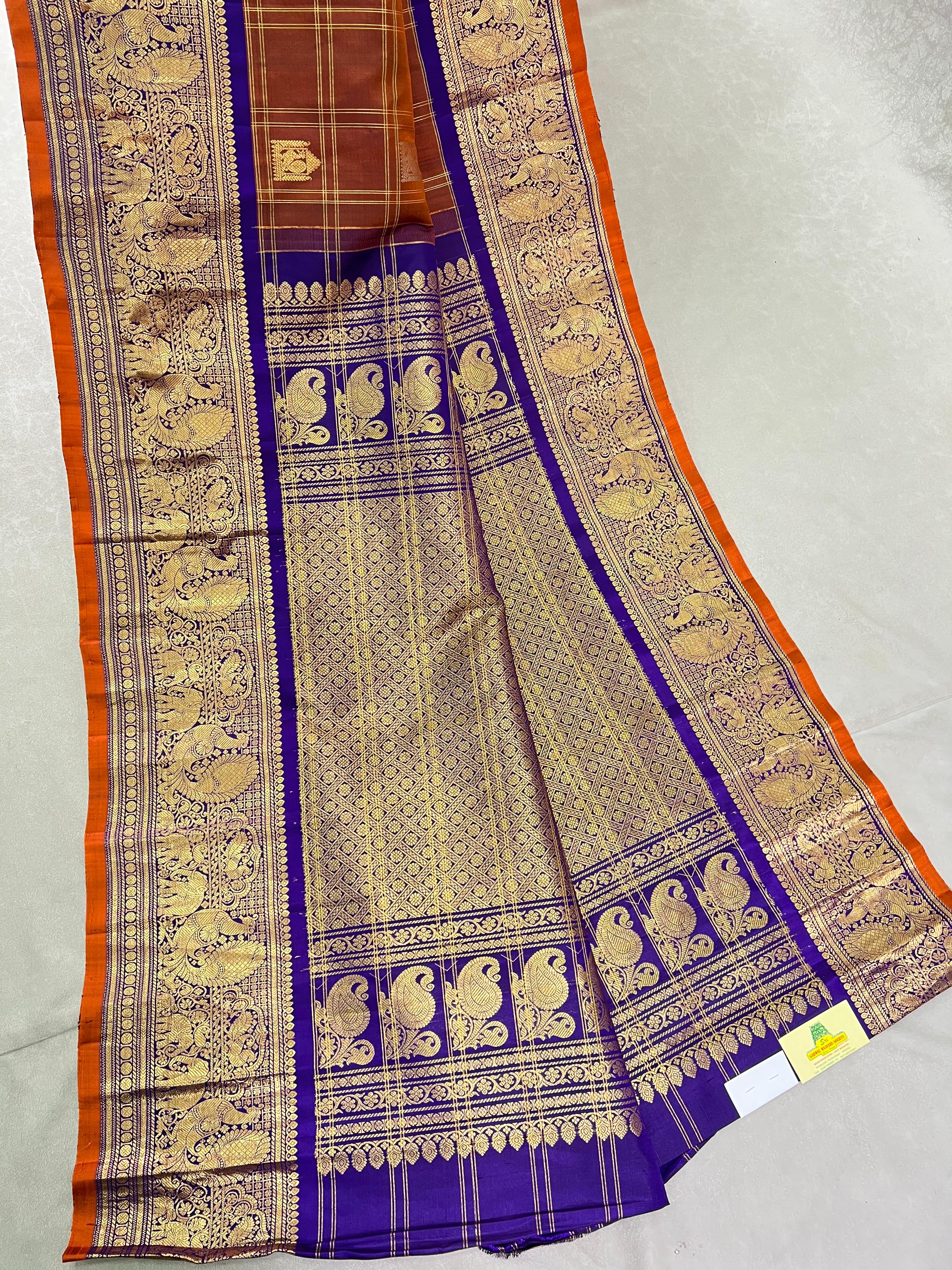 This stunning Gadwal pure silk handloom saree features a vibrant brown checked pattern adorned with subtle butta motifs, adding a touch of elegance. The rich violet Kanchi border with intricate golden zari work enhances its traditional appeal, while the hint of rust colour at the edge brings a refreshing contrast. Perfect for festive occasions and special celebrations, this saree beautifully blends classic design with timeless craftsmanship. Comes with contrast blouse and Silk Mark Certified.