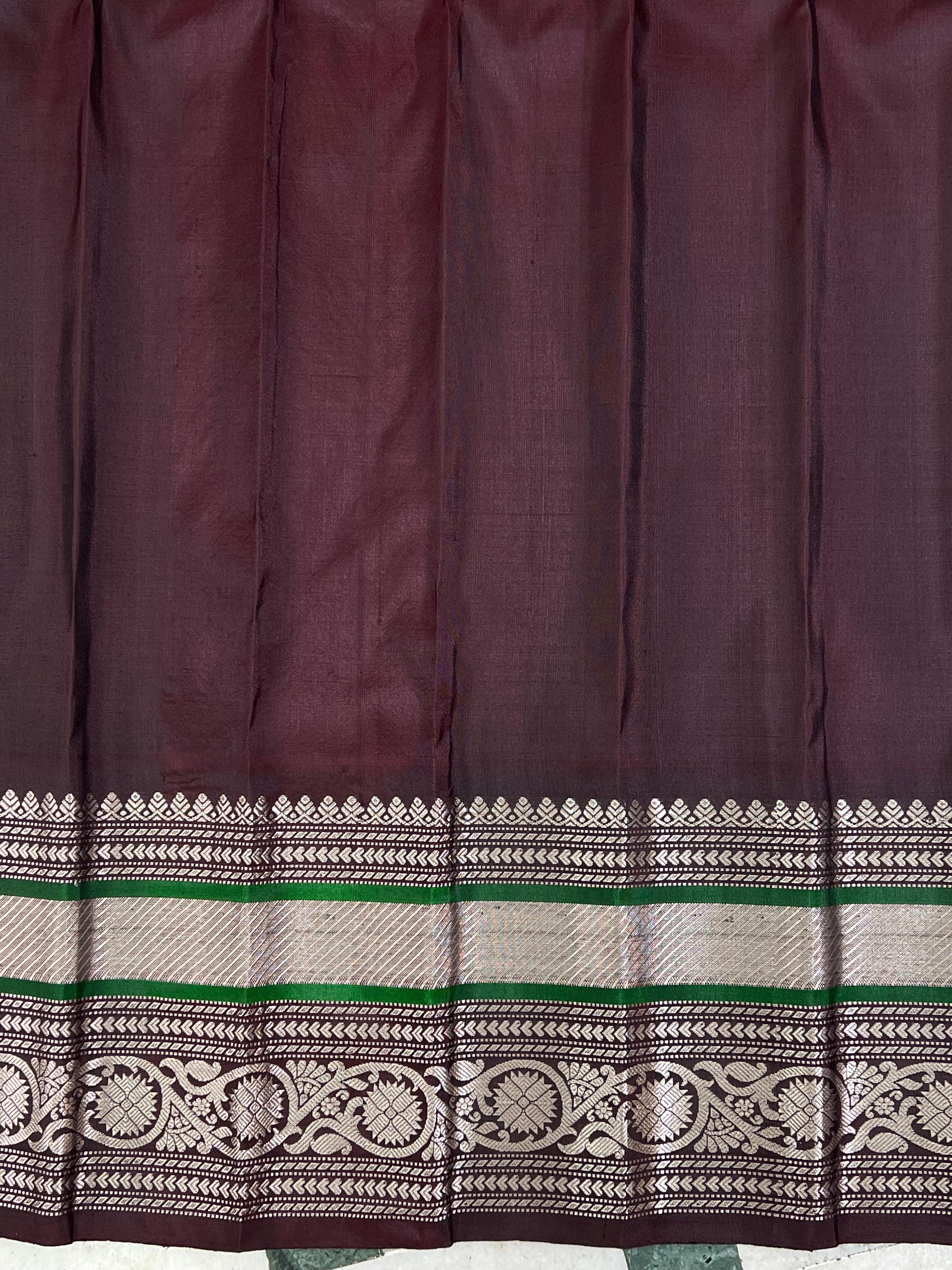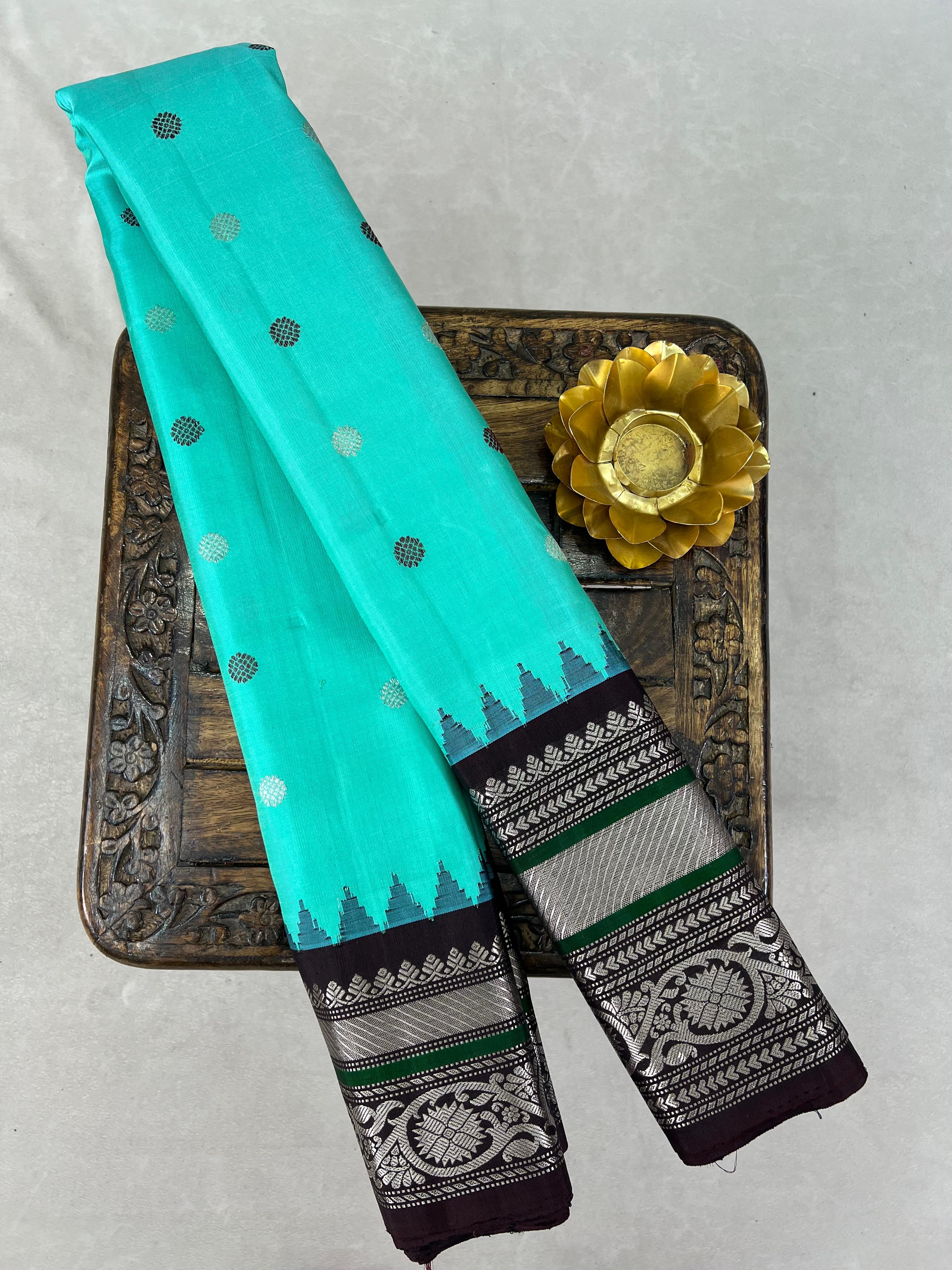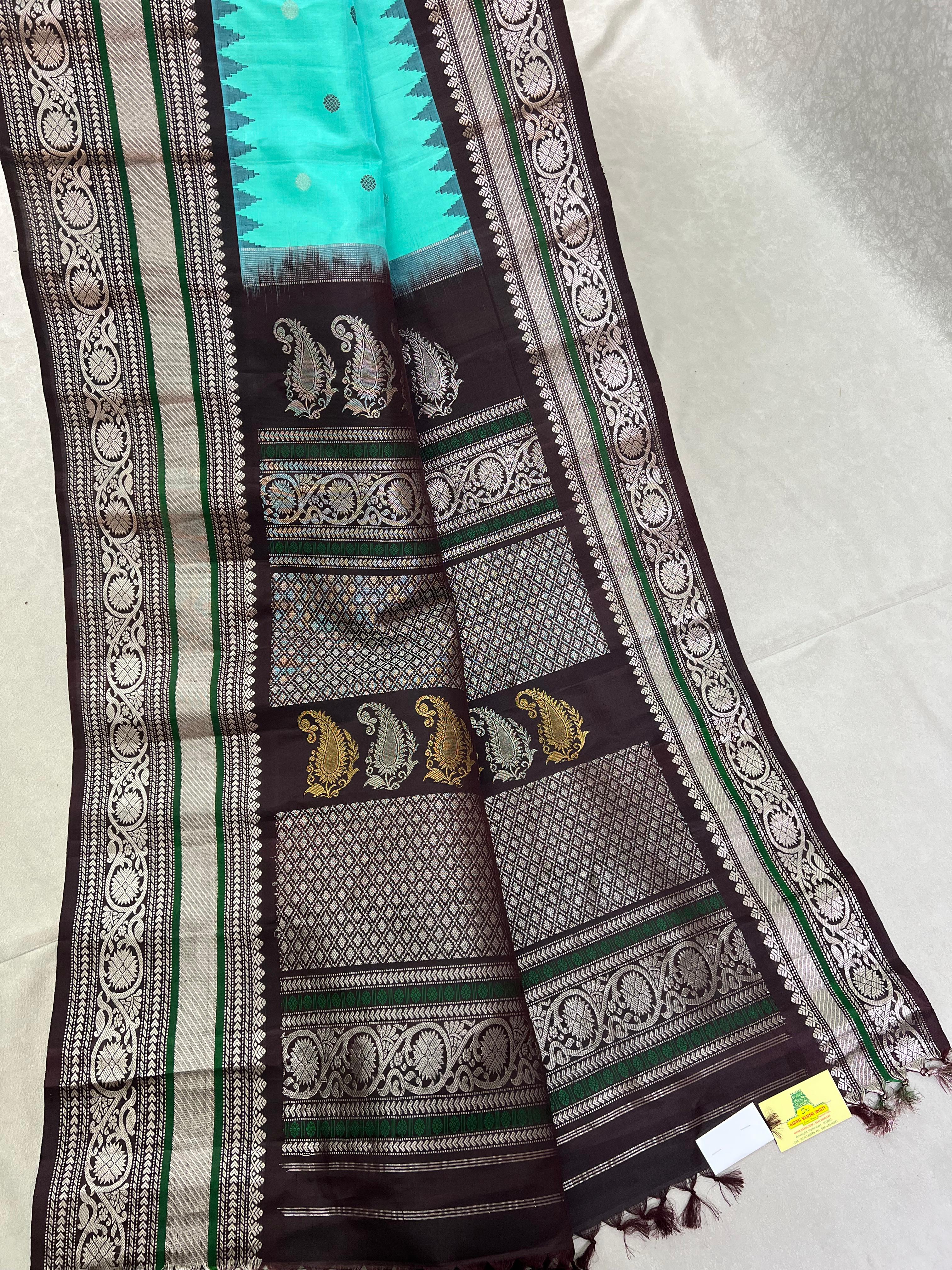 Gadwal Pure Silk Handloom Saree in a refreshing turquoise blue body highlighted with silver zari and thread buttas. The contrast brown border features intricate silver zari temple motifs and traditional designs, accentuated with a hint of green detailing. Pair with contrast blouse, and is Silk Mark certified for authenticity.