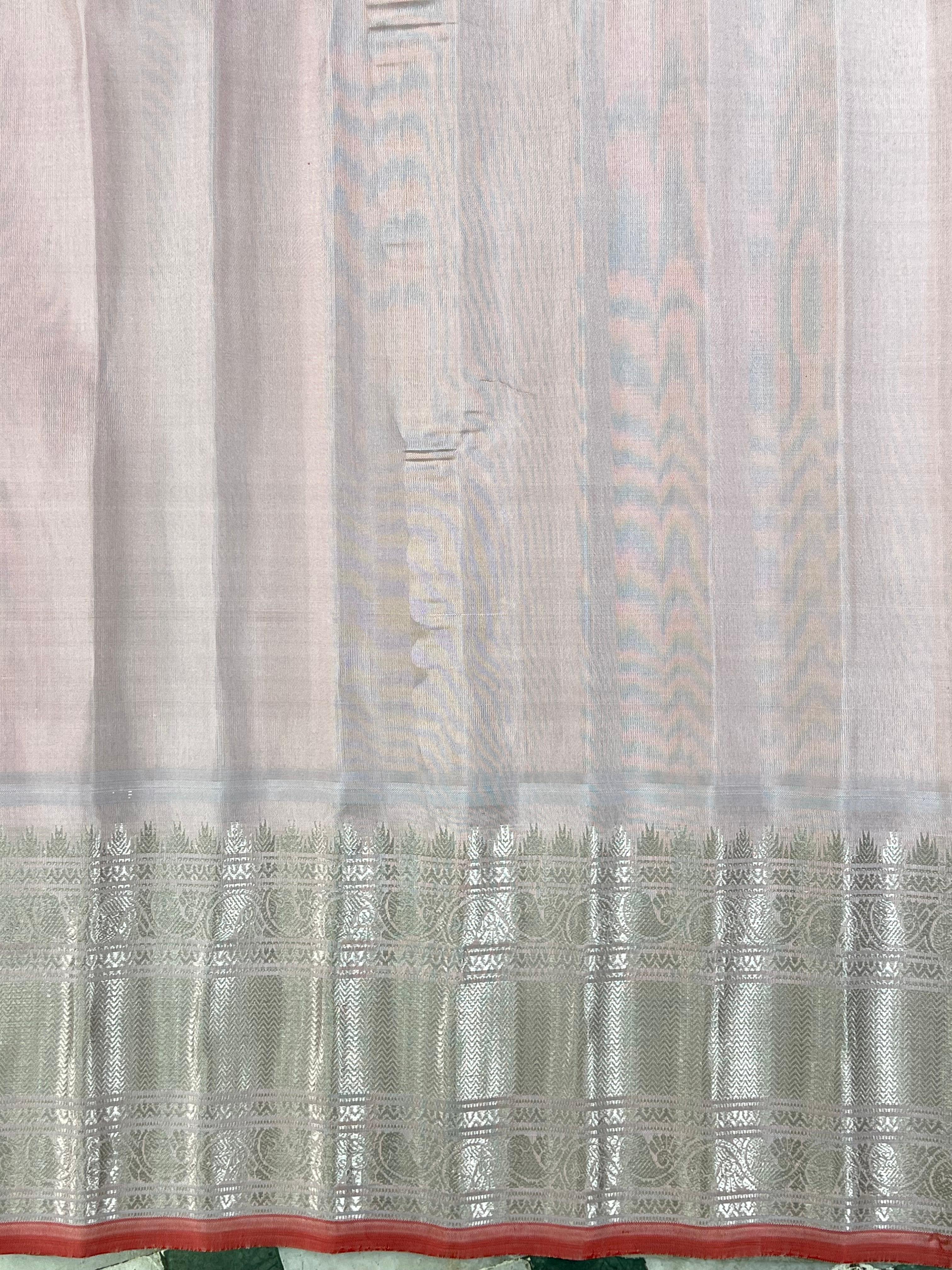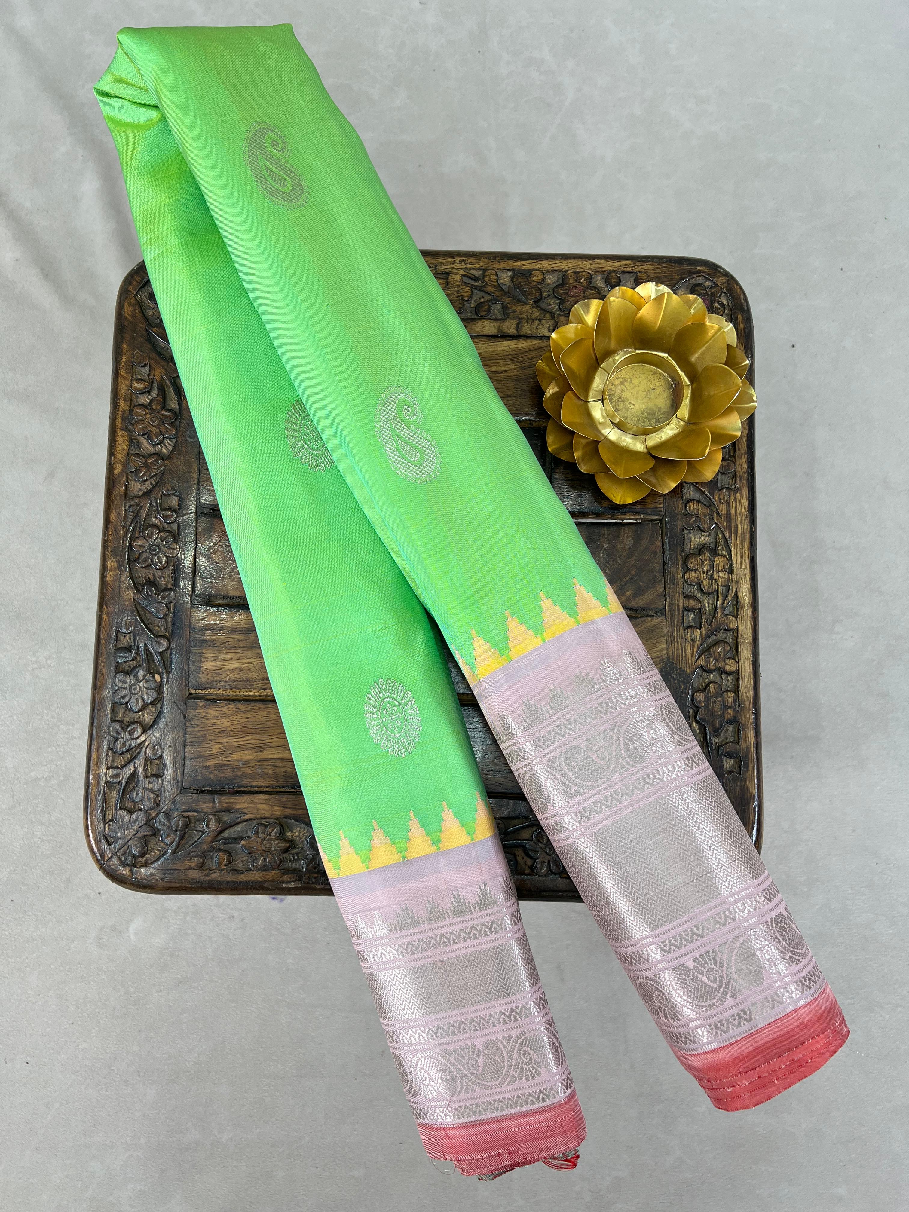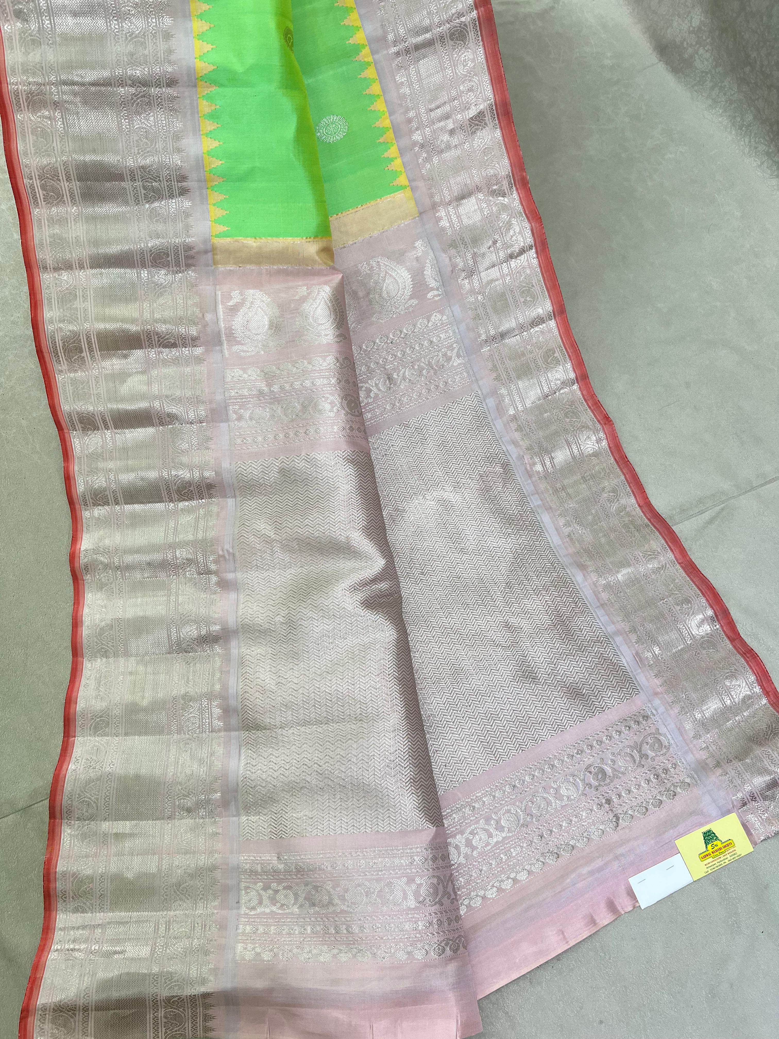 Gadwal Pure Silk Handloom Saree in a refreshing spring green body highlighted with silver zari buttas. The contrast light peach border features intricate silver zari temple motifs and traditional designs, accentuated with a hint of light red detailing. Pair with contrast blouse, and is Silk Mark certified for authenticity.
