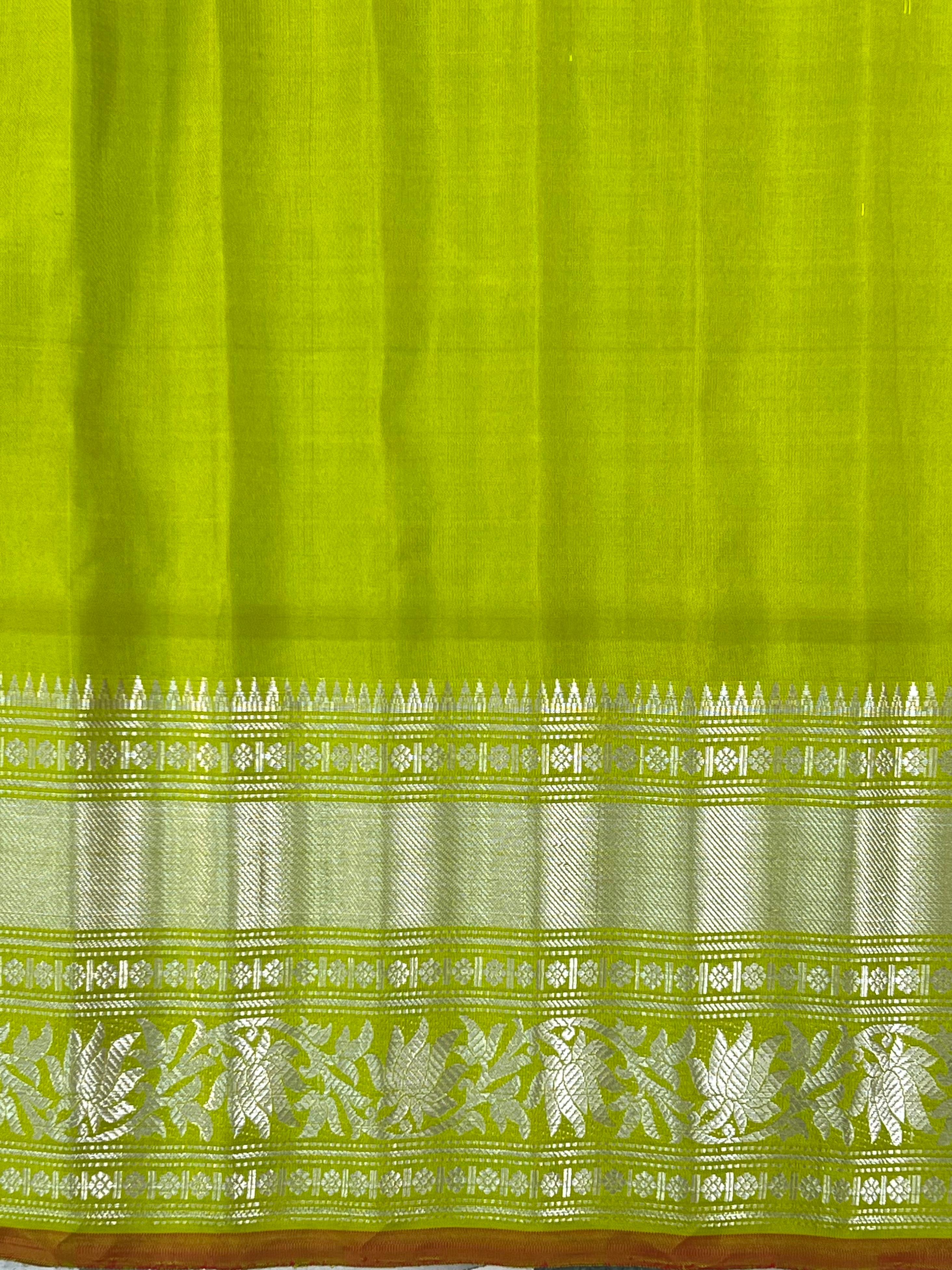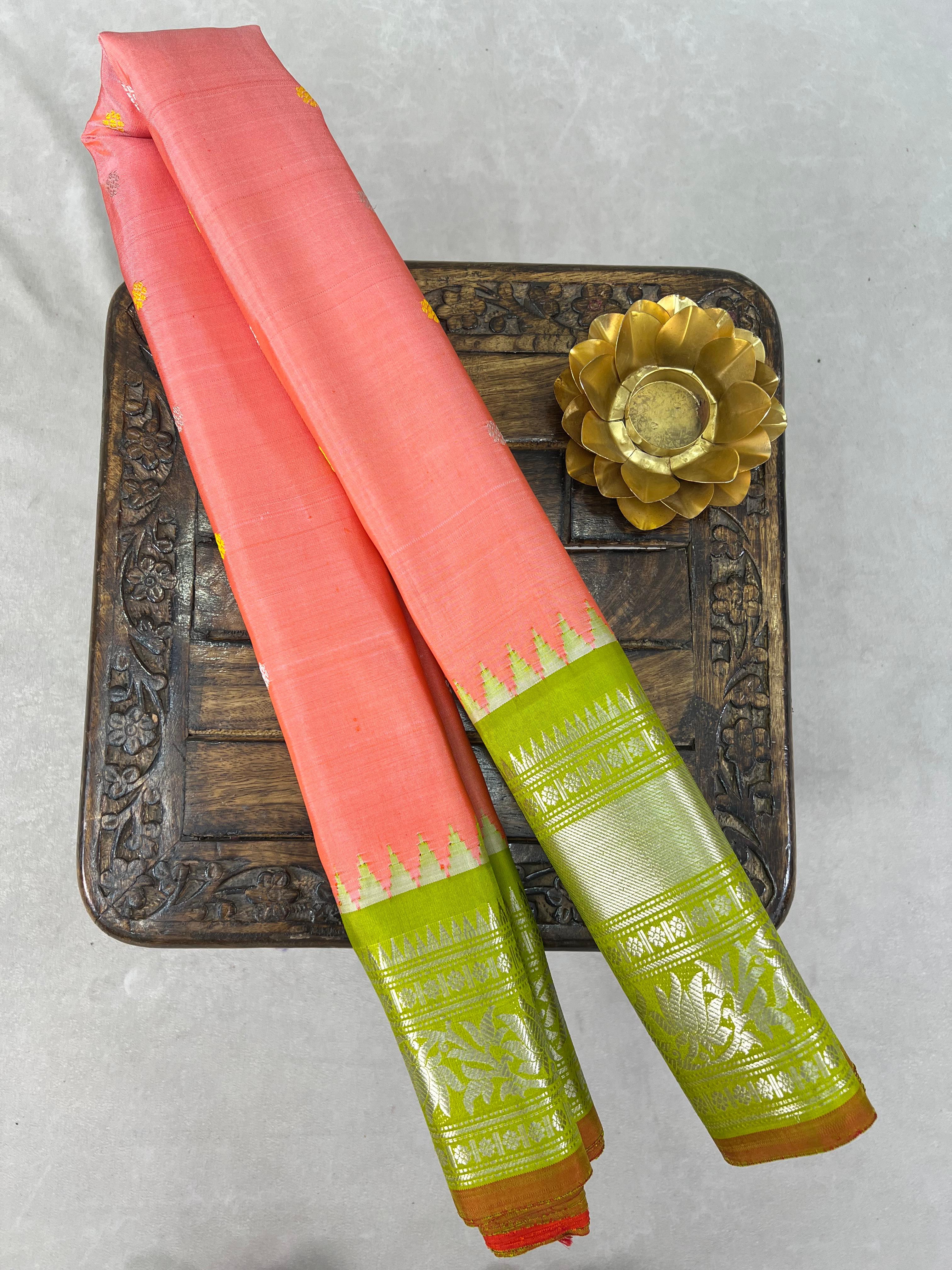 Gadwal Pure Silk Handloom Saree in a refreshing peach colour body highlighted with silver zari buttas. The contrast parrot green border features intricate silver zari temple motifs and traditional designs, accentuated with a hint of rust colour detailing. Pair with contrast blouse, and is Silk Mark certified for authenticity.