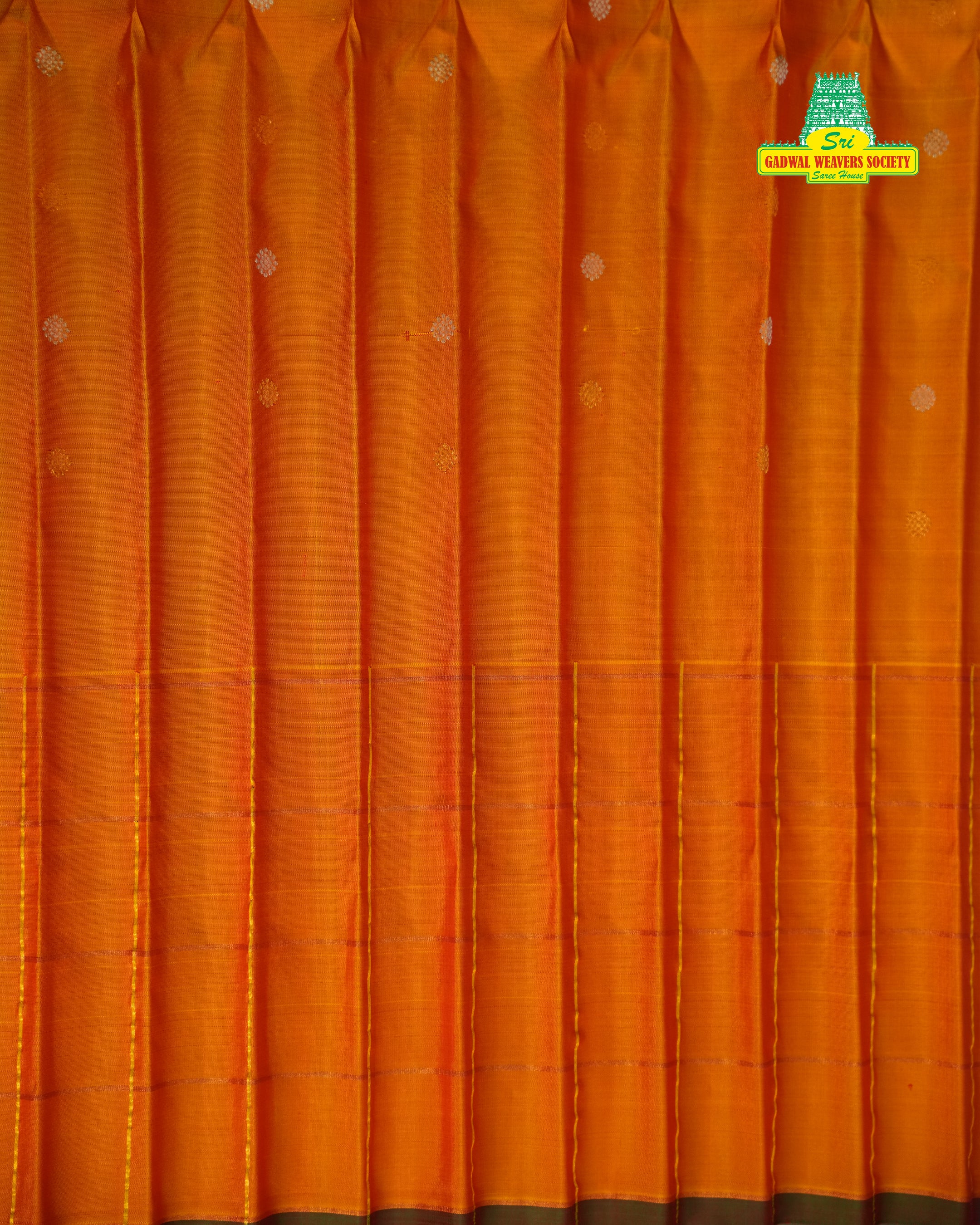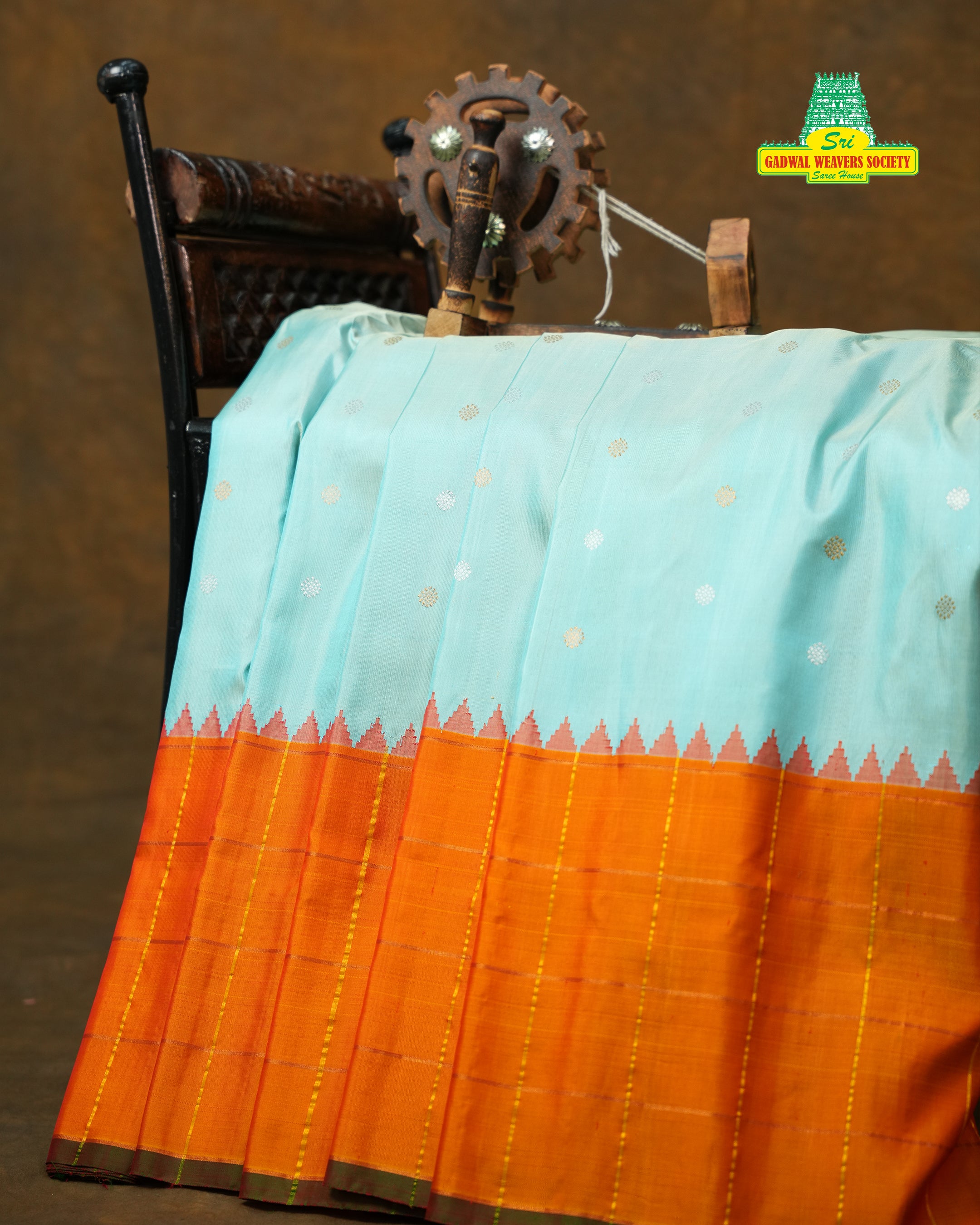 This elegant Gadwal Pure Silk Handloom Saree features a serene sky blue body adorned with delicate gold & silver zari buttas, creating a graceful and refreshing appeal. The saree is beautifully contrasted with a vibrant orange border woven in checks with traditional Gadwal style, highlighted with temple motifs & green selevedge in pink and fine zari detailing. The combination of soft pastel blue and bright orange adds a perfect balance of elegance and vibrance. Paired with a contrast blouse, this saree comes with Silk Mark certification, ensuring its authenticity and pure handloom craftsmanship.