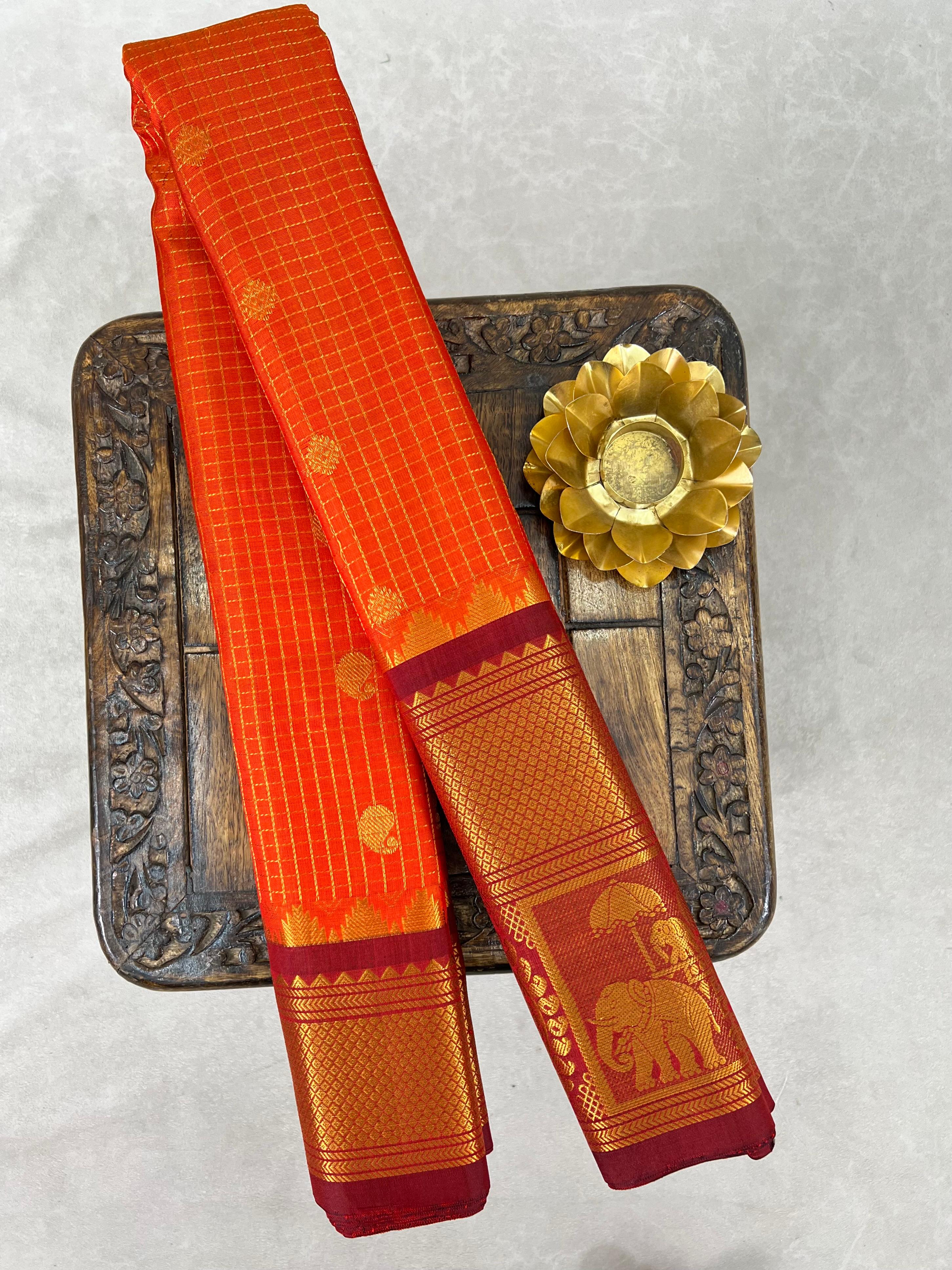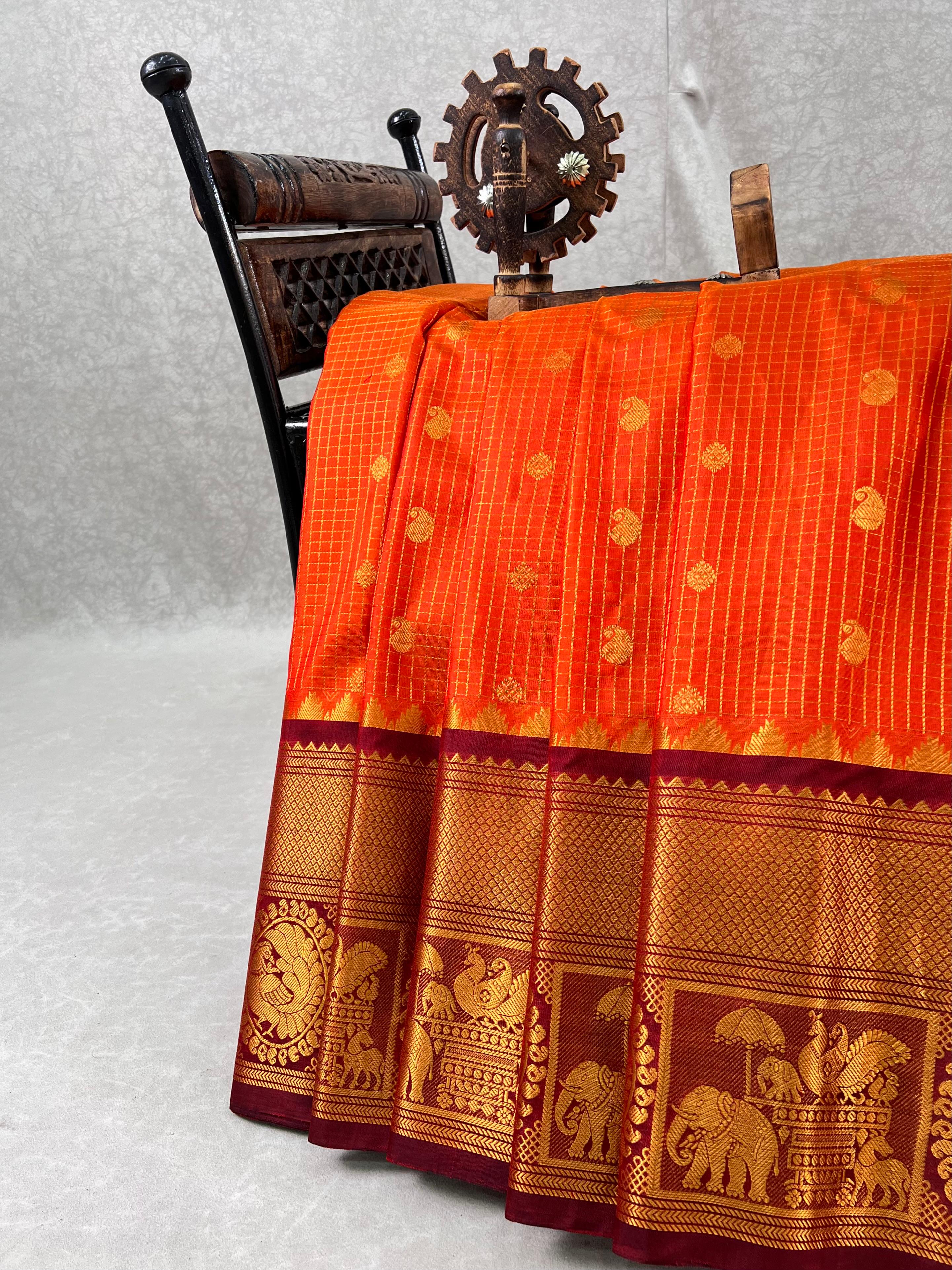 This exquisite Gadwal Pure Silk Handloom Saree features a Neon Orange body adorned with elegant gold zari checks and delicately woven gold buttas, showcasing the timeless beauty of traditional craftsmanship. The saree is elevated by its striking Maroon Border, intricately designed with shimmering gold zari that adds a bold and regal contrast, this saree is perfect for weddings, festive occasions, and cultural celebrations. A true blend of heritage, luxury, and elegance. Paired with a contrast blouse and it is Silk mark certified.