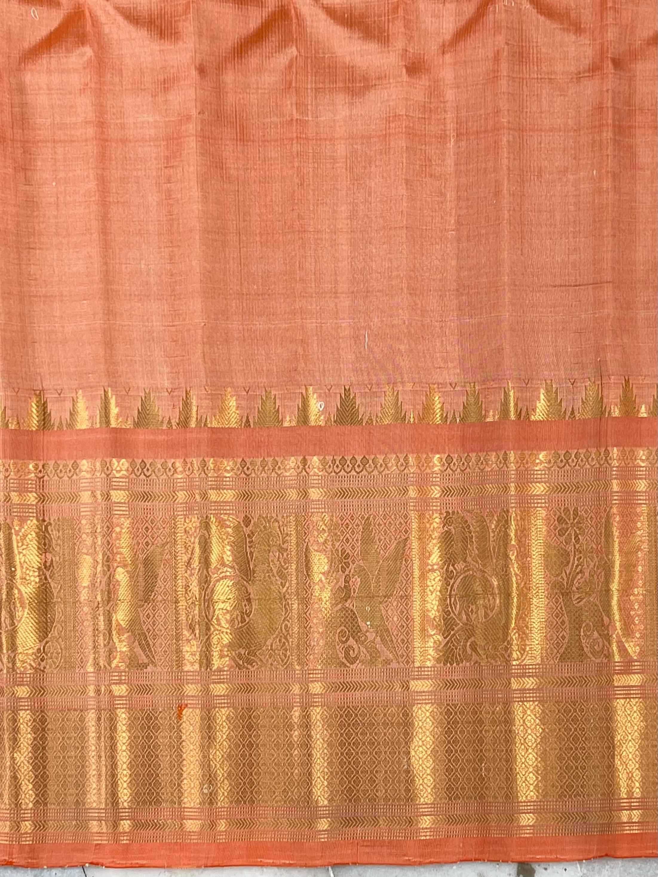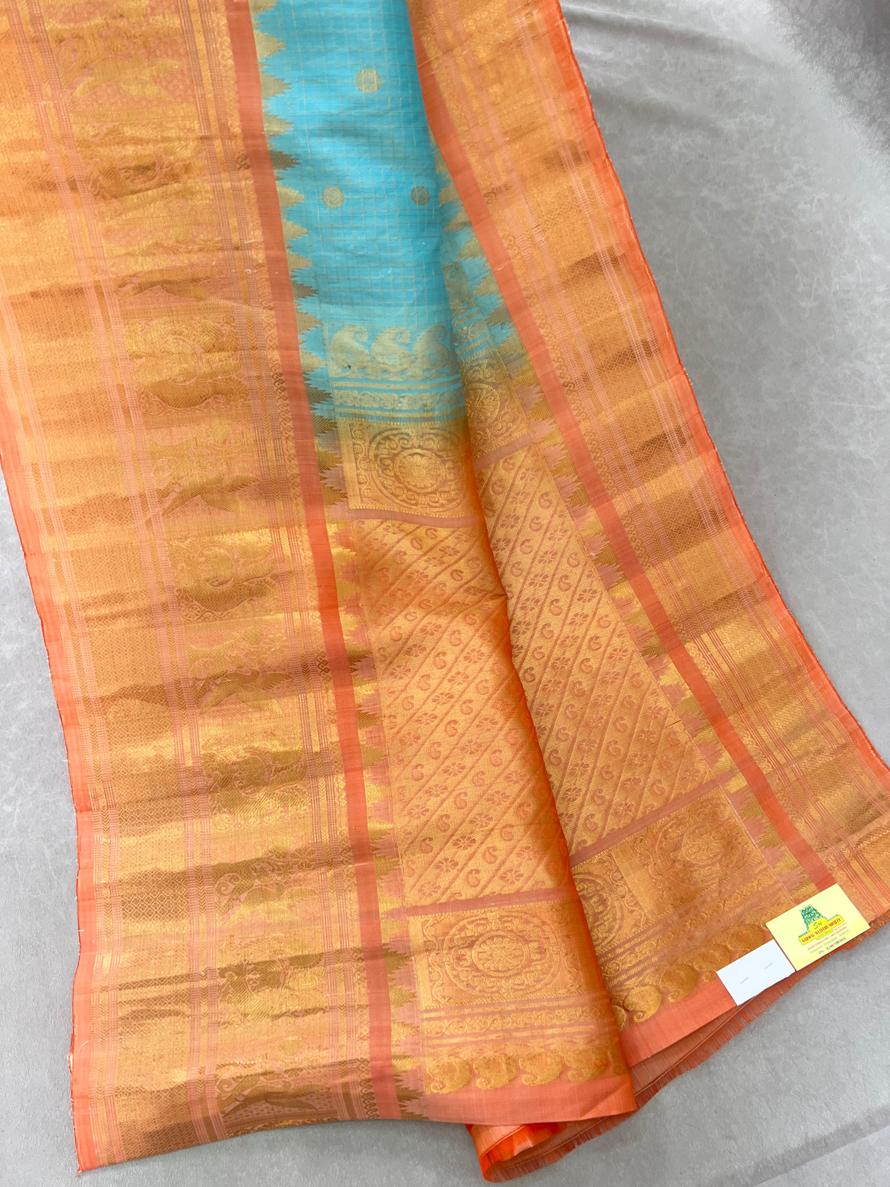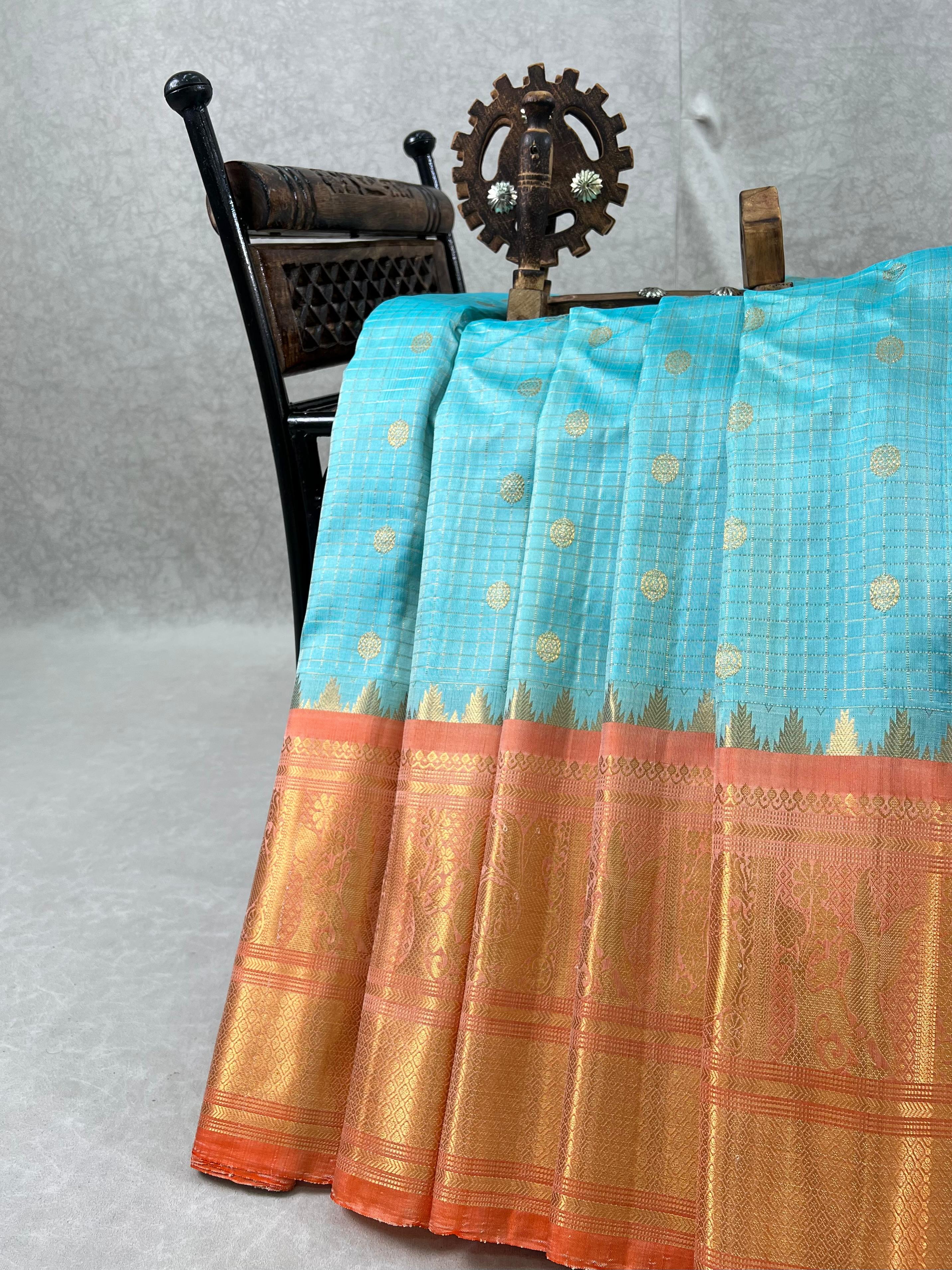 This exquisite Gadwal Pure Silk Handloom Saree features a Aqua blue body adorned with elegant gold zari checks and delicately woven gold buttas, showcasing the timeless beauty of traditional craftsmanship. The saree is elevated by its striking light Orange border, intricately designed with shimmering gold zari that adds a bold and regal contrast, this saree is perfect for weddings, festive occasions, and cultural celebrations. A true blend of heritage, luxury, and elegance. Paired with a contrast blouse and it is Silk mark certified.