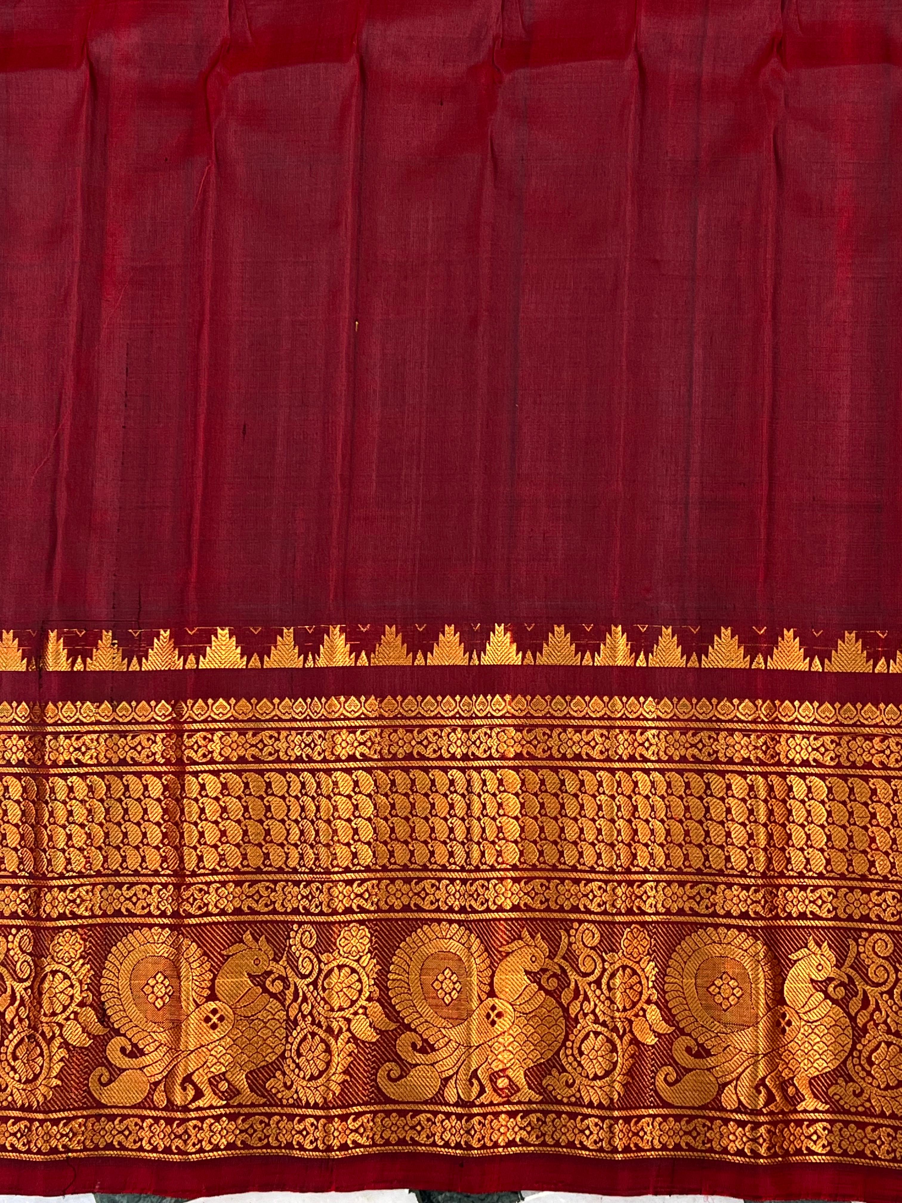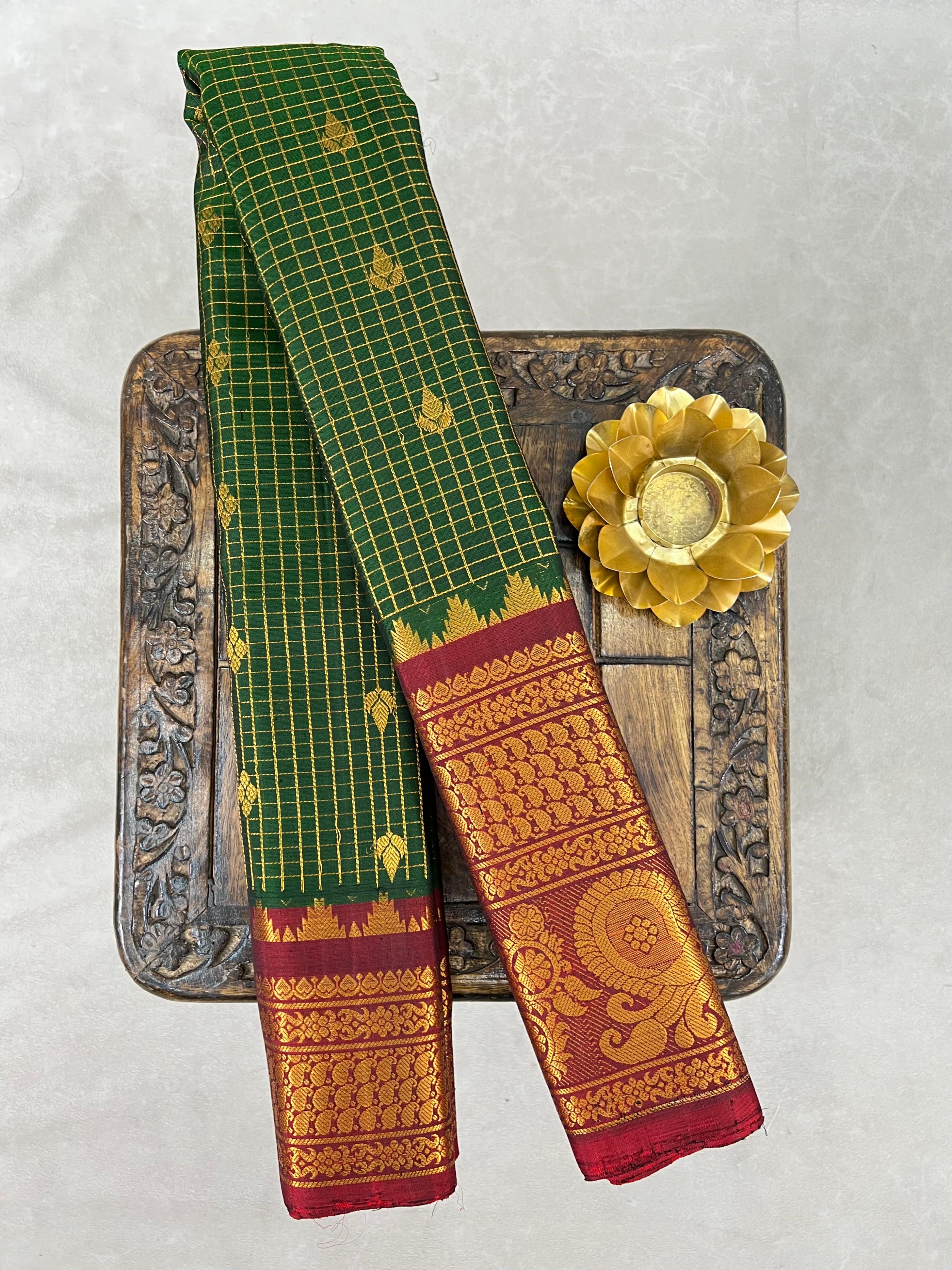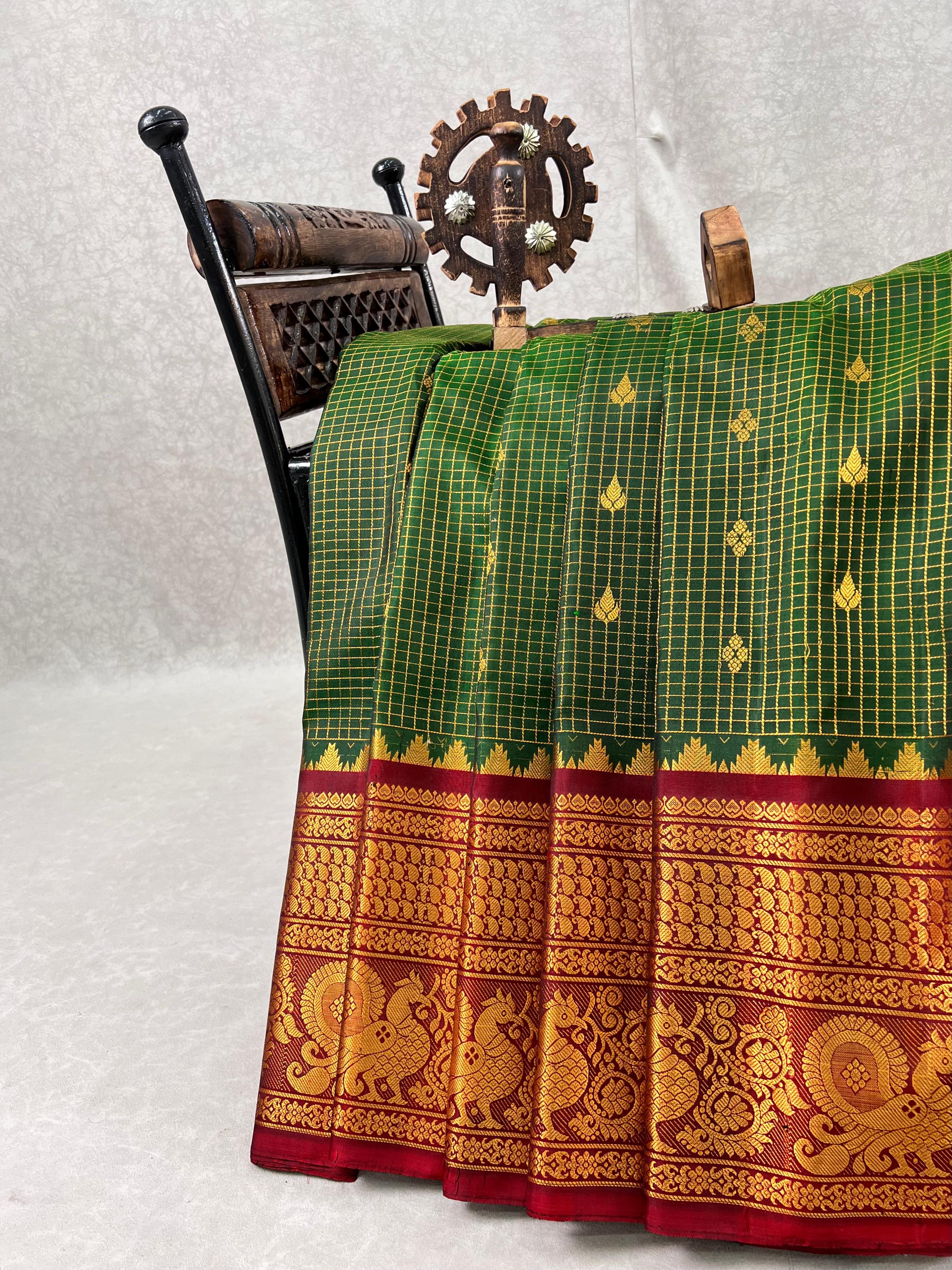 This exquisite Gadwal Pure Silk Handloom Saree features a dark Green body adorned with elegant gold zari checks and delicately woven gold buttas, showcasing the timeless beauty of traditional craftsmanship. The saree is elevated by its striking light Maroon border, intricately designed with shimmering gold zari that adds a bold and regal contrast, this saree is perfect for weddings, festive occasions, and cultural celebrations. A true blend of heritage, luxury, and elegance. Paired with a contrast blouse and it is Silk mark certified.