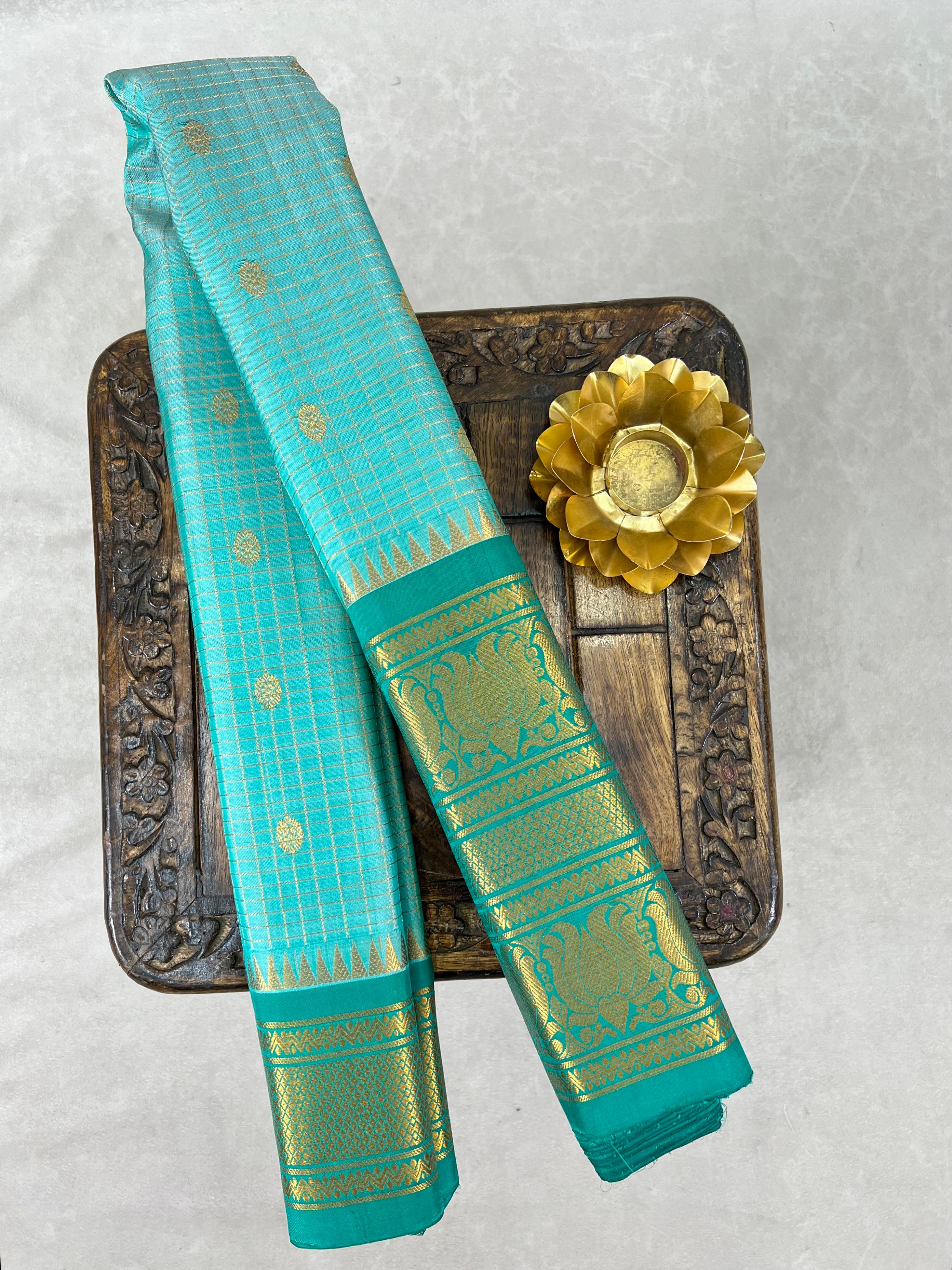 This exquisite Gadwal Pure Silk Handloom Saree features a Seafoam green body adorned with elegant gold zari checks and delicately woven gold buttas, showcasing the timeless beauty of traditional craftsmanship. The saree is elevated by its striking light Bottle green border, intricately designed with shimmering gold zari that adds a bold and regal contrast, this saree is perfect for weddings, festive occasions, and cultural celebrations. A true blend of heritage, luxury, and elegance. Paired with a contrast blouse and it is Silk mark certified.