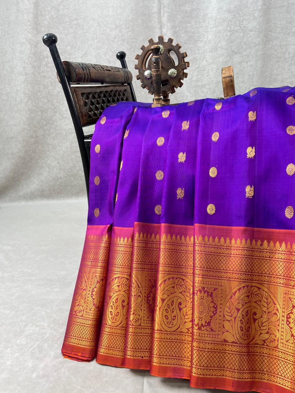 This exquisite Gadwal Pure Silk Handloom Saree features a Purple body elegantly adorned with delicate gold zari motifs, radiating timeless grace and sophistication. The saree is beautifully enhanced by a striking big Rust orange border highlighted with intricate gold zari detailing adding a regal traditional appeal. Ideal for festive, wedding, and traditional occasions, this masterpiece showcases the authentic craftsmanship of Gadwal handlooms. Pair it with a contrast blouse, and enjoy complete assurance as it is Silk Mark Certified.
