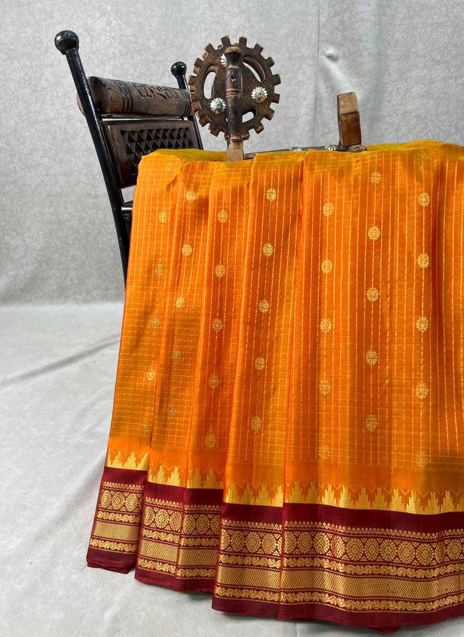 This exquisite Gadwal Pure Silk Handloom Saree features a orange body adorned with delicate gold zari checks with gold zari buttas, exuding timeless elegance. The highlight of the saree is dark red with gold zari detailing. Perfect for festive and traditional occasions, this saree reflects the classic craftsmanship and royal charm of Gadwal handlooms. Pair with Contrast Blouse, and it is Silk Mark certified.