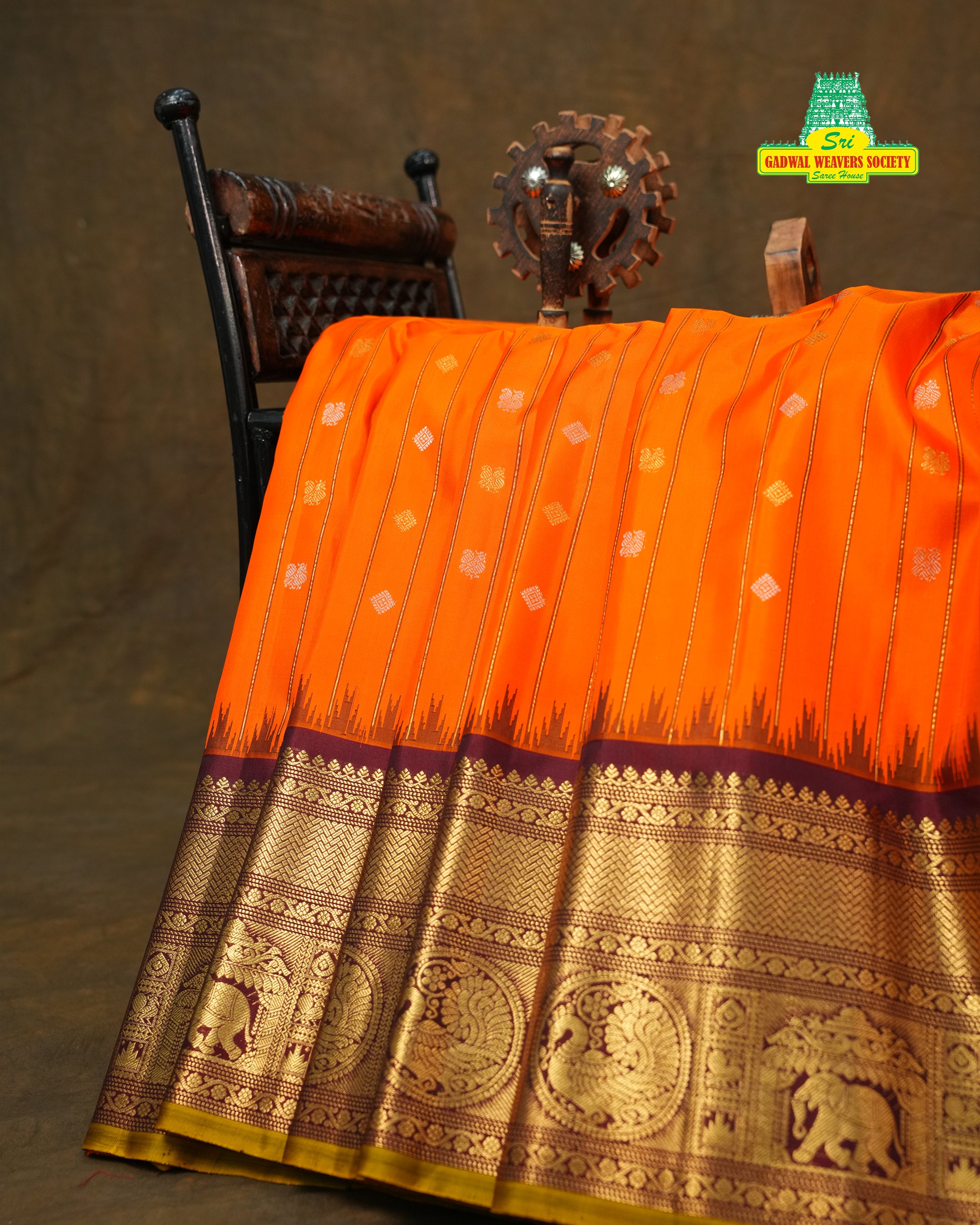 This gorgeous Gadwal Pure Silk Handloom Saree is a perfect blend of tradition and elegance, featuring a Bright Orange body with Gold zari stripes. Delicate floral motifs in Silver and gold zari, adding a touch of grace to the overall look. The lower part of the saree is adorned with a Maroon border with rich Yellow Selvedge, featuring intricate floral and geometric patterns that enhance the luxurious feel, elevating the saree’s appeal. This saree comes with a contrast blouse and it is Silk Mark certified