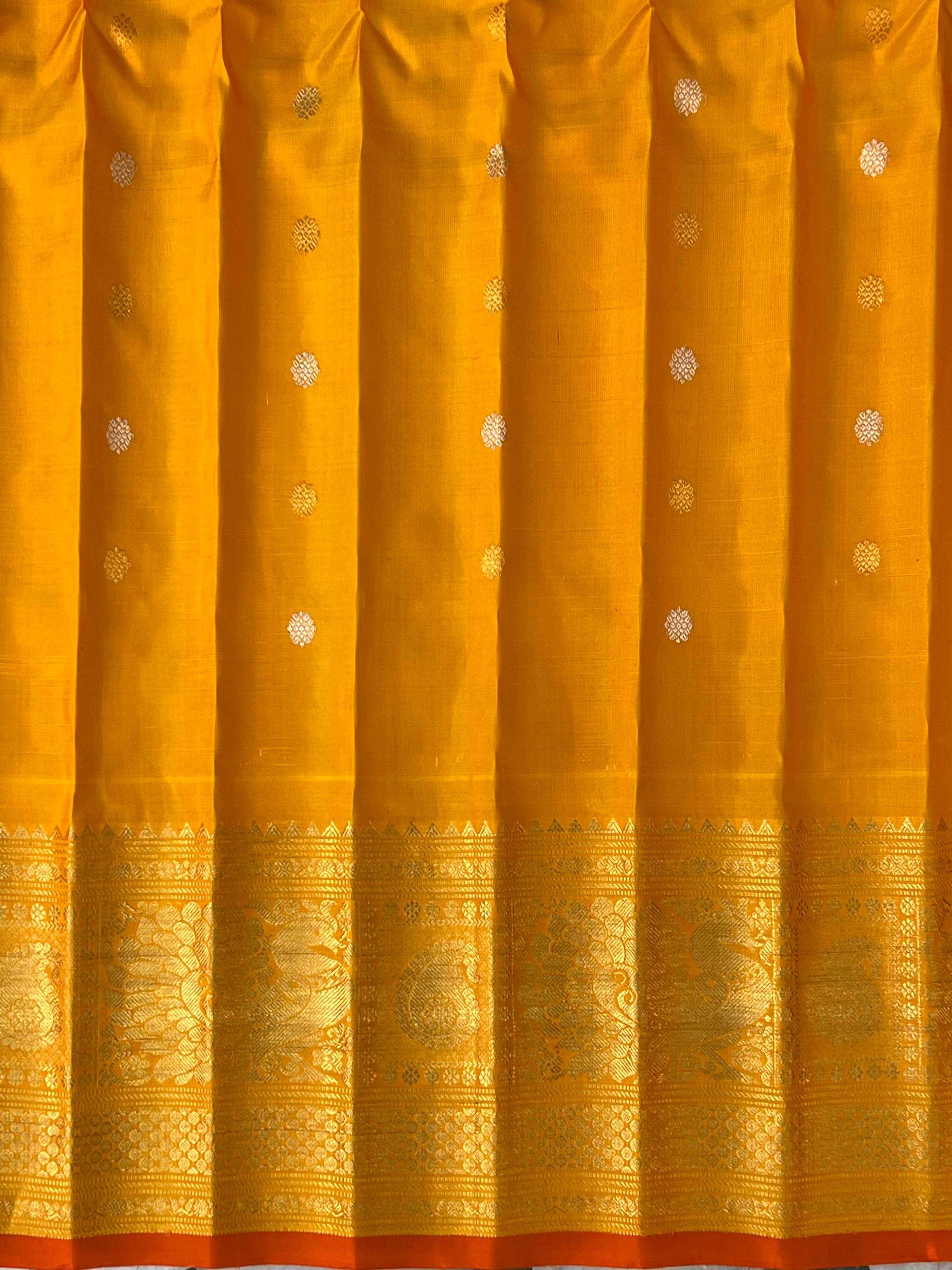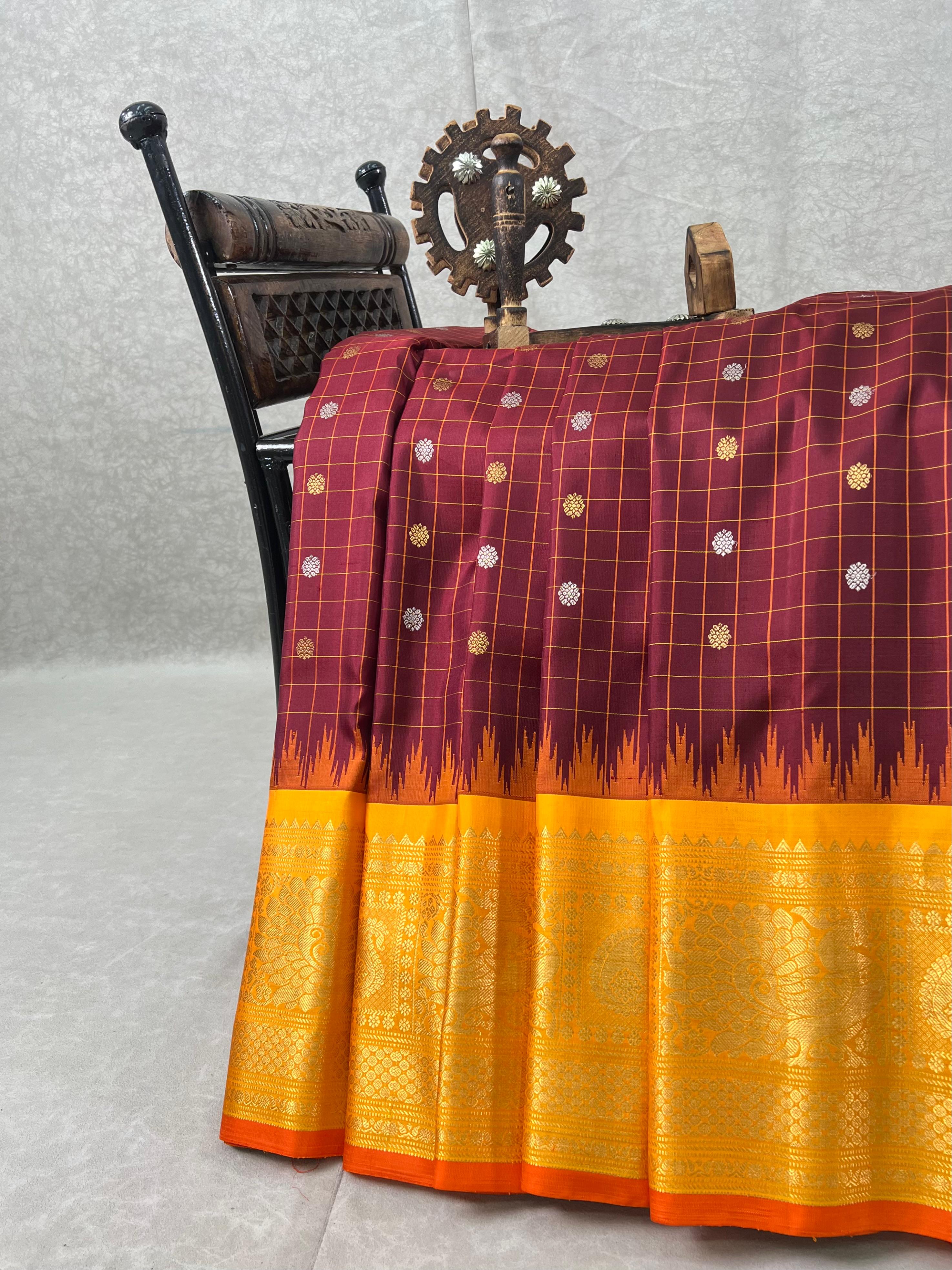 This Gadwal Pure Silk Handloom Saree showcases a timeless Dark brown body highlighted with classic Thread Checks and adorned with intricate Gold and silver zari buttas, giving it a rich and graceful appeal. The striking Yellow border with Orange selvedge, woven with exquisite zari motifs and a traditional temple design, adds a bold touch of heritage to the overall look. Paired with a contrasting blouse, this masterpiece blends tradition with sophistication, making it perfect for festive occasions, weddings, and cultural celebrations. Stunning in craftsmanship and purity, this saree is proudly Silk Mark Certified.