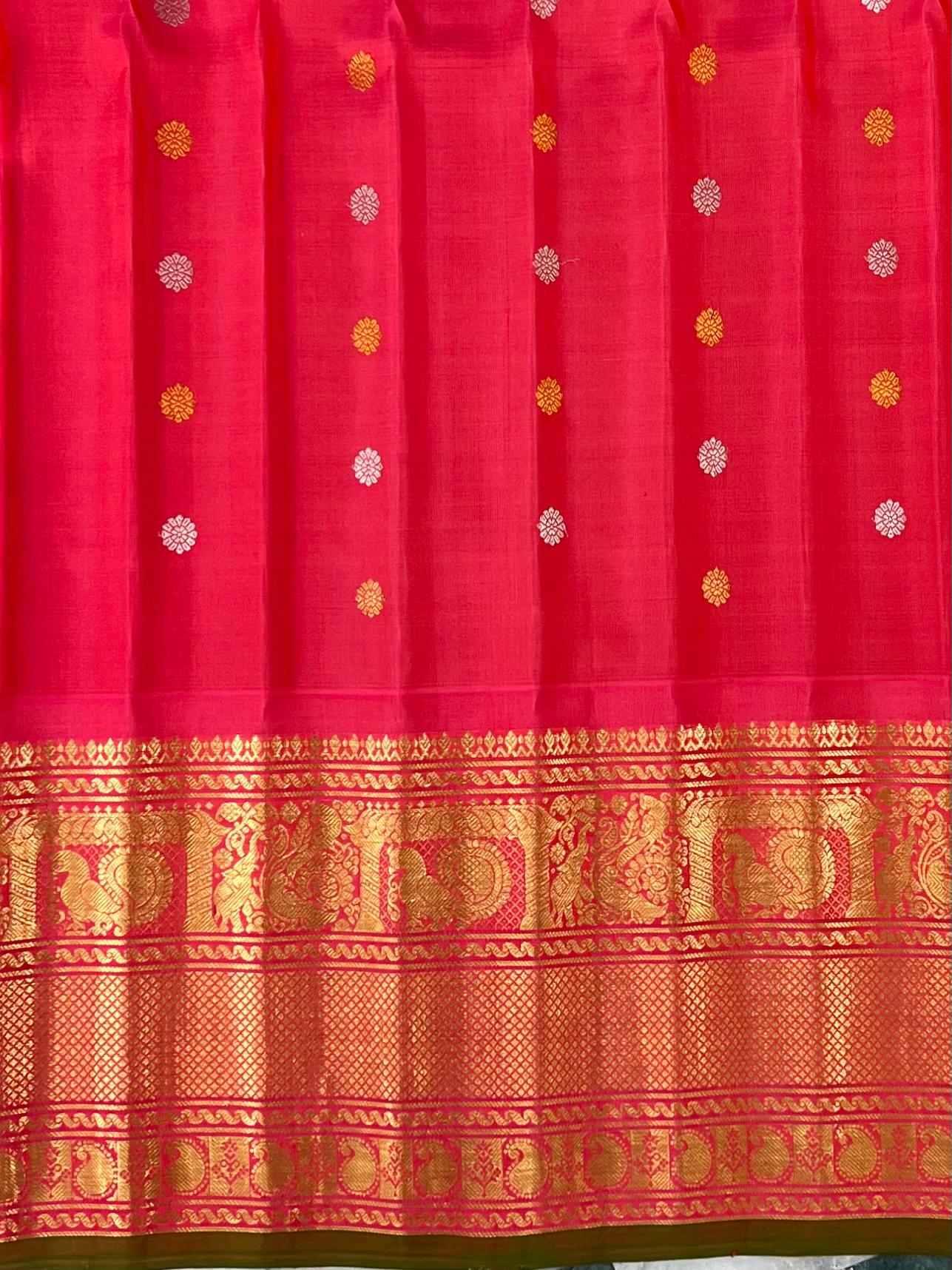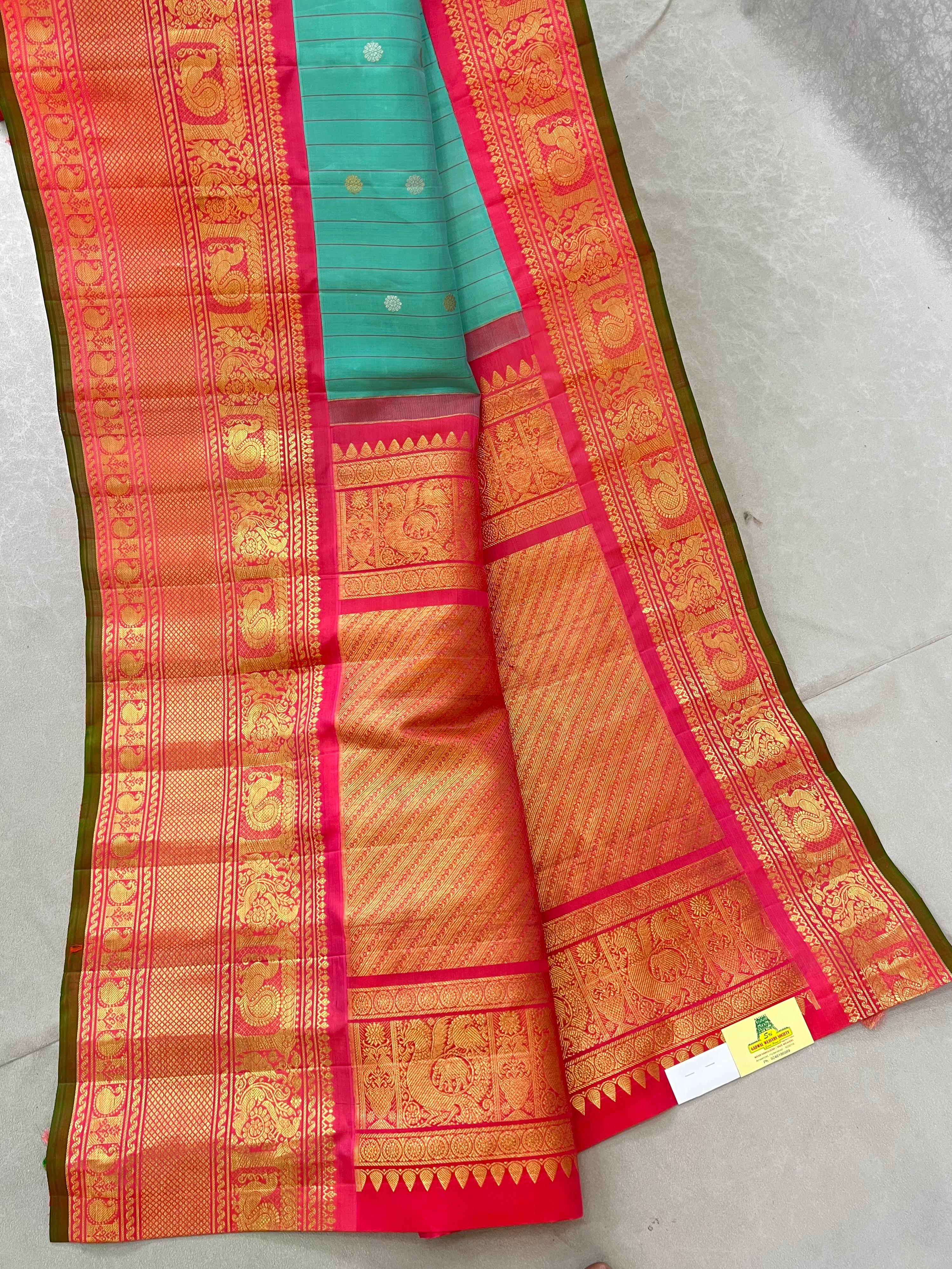This Gadwal Pure Silk Handloom Saree showcases a timeless Sea green body highlighted with classic Thread Stripes and adorned with intricate Gold and silver zari motifs, giving it a rich and graceful appeal. The striking Pink border with green selvedge, woven with exquisite Gold zari detailing, adds a bold touch of heritage to the overall look. Paired with a contrasting blouse, this masterpiece blends tradition with sophistication, making it perfect for festive occasions, weddings, and cultural celebrations. Stunning in craftsmanship and purity, this saree is proudly Silk Mark Certified.