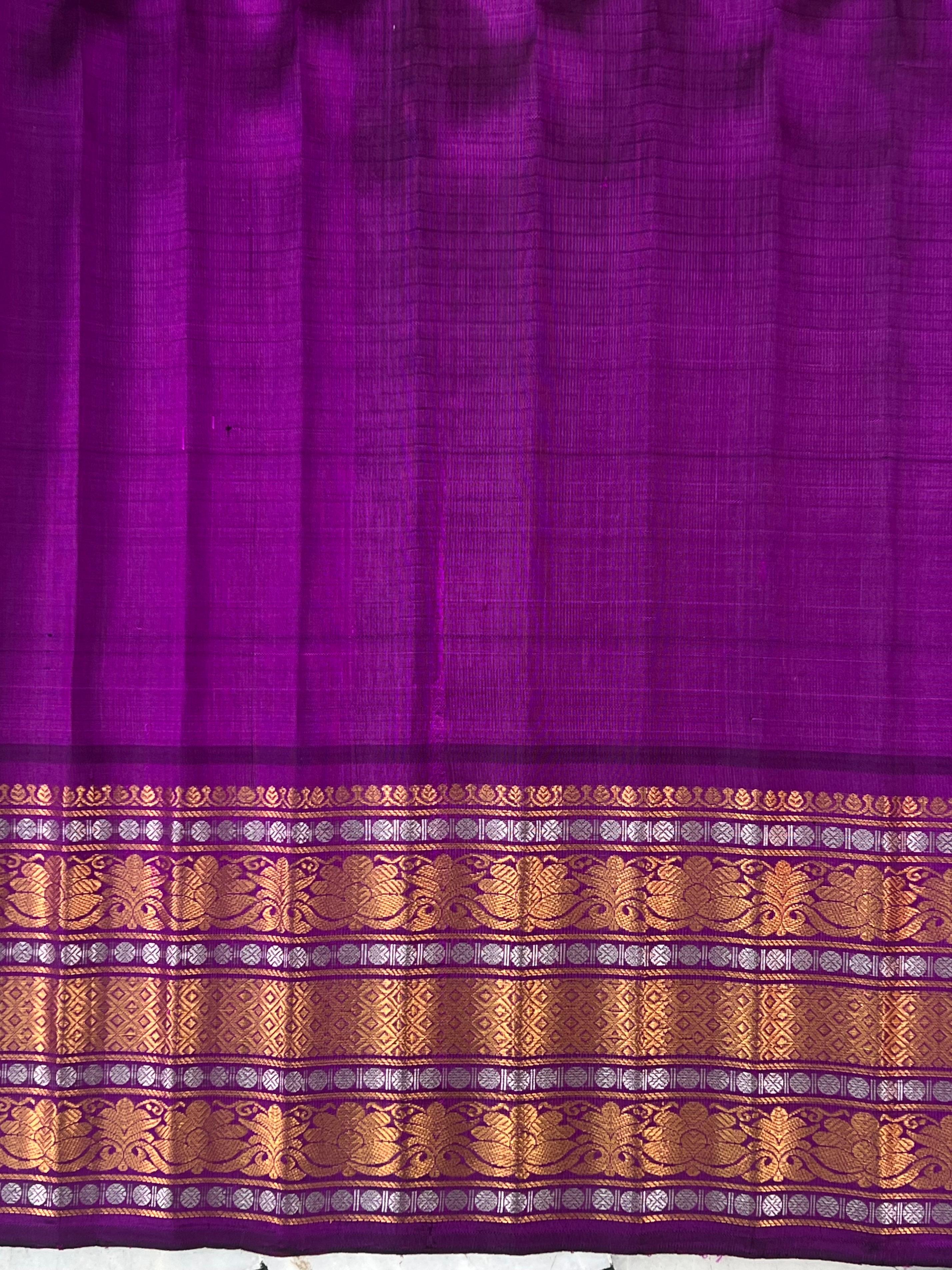 This Gadwal Pure Silk Handloom Saree showcases a timeless Cream body highlighted with classic Thread checks and adorned with intricate Gold and silver zari motifs, giving it a rich and graceful appeal. The striking Purple border, woven with exquisite Gold and Silver zari detailing, adds a bold touch of heritage to the overall look. Paired with a contrasting blouse, this masterpiece blends tradition with sophistication, making it perfect for festive occasions, weddings, and cultural celebrations. Stunning in craftsmanship and purity, this saree is proudly Silk Mark Certified.