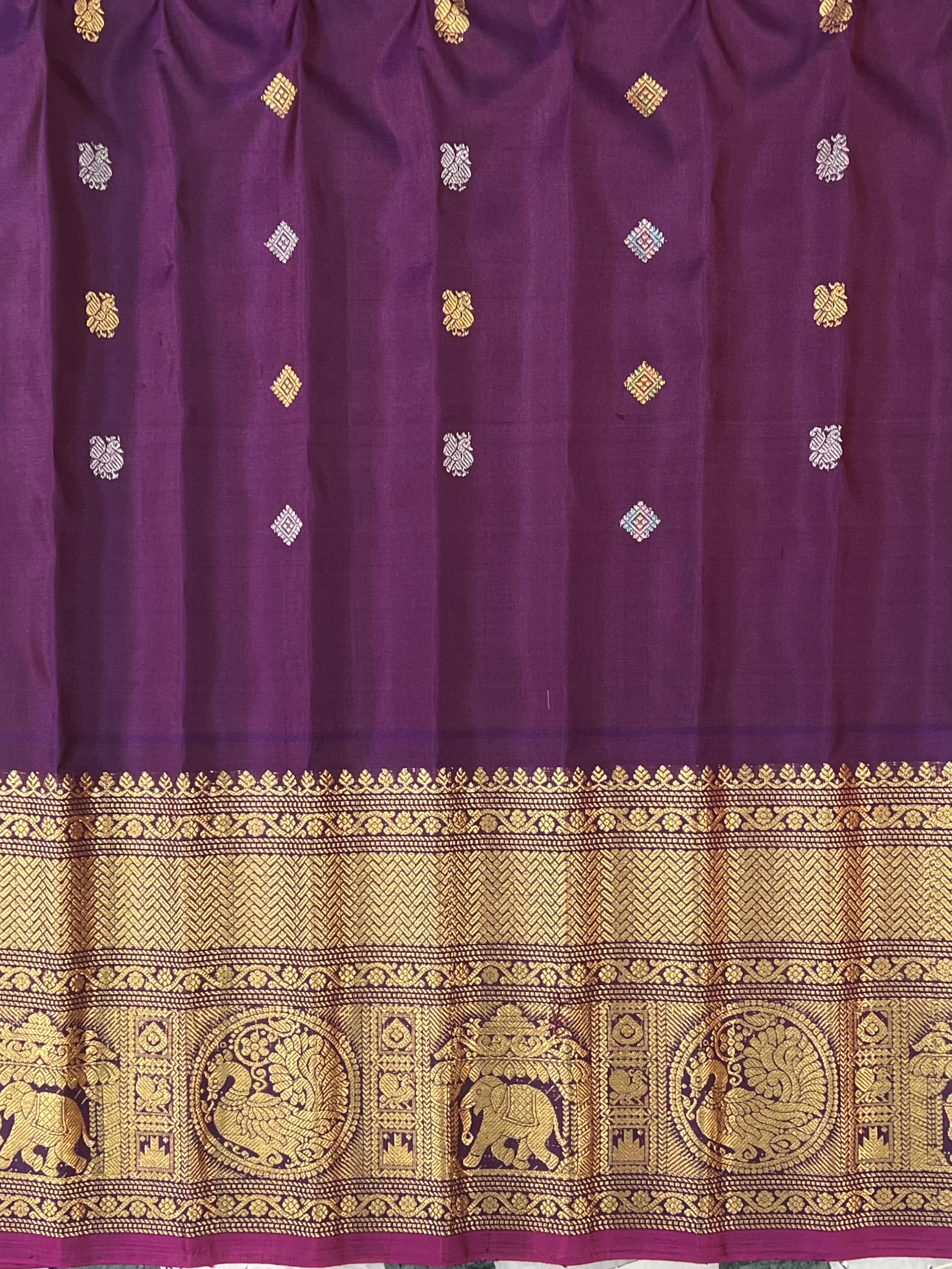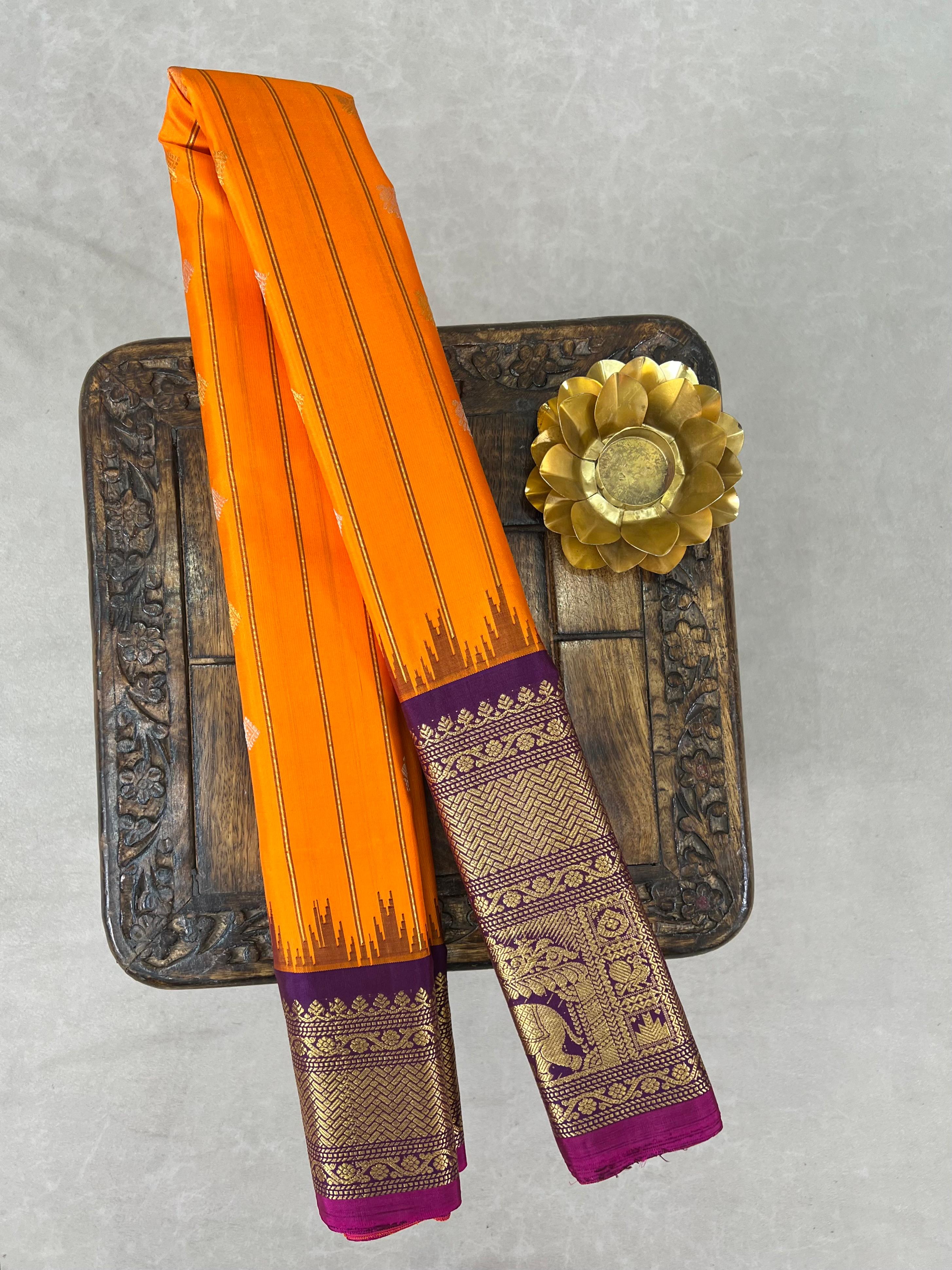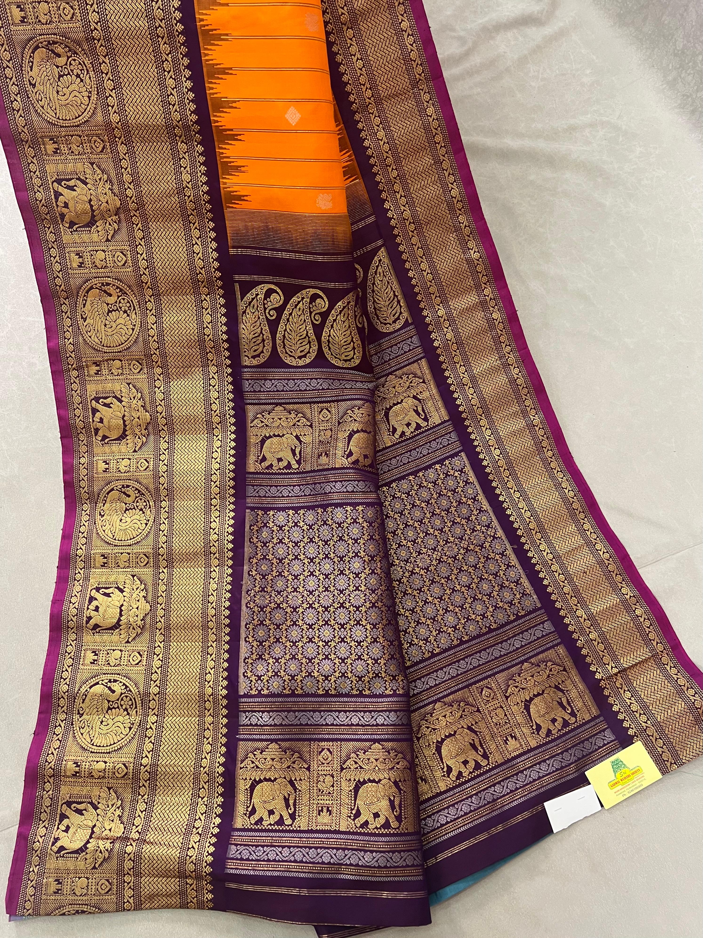 This gorgeous Gadwal Pure Silk Handloom Saree is a perfect blend of tradition and elegance, featuring a Bright Orange body with Gold zari stripes. Delicate floral Gold and Silver zari motifs, adding a touch of grace to the overall look. The lower part of the saree is adorned with a Purple border and Gold zari detailing with rich Magenta Selvedge, featuring intricate floral and geometric patterns that enhance the luxurious feel, elevating the saree’s appeal. This saree comes with a contrast blouse and it is Silk Mark certified
